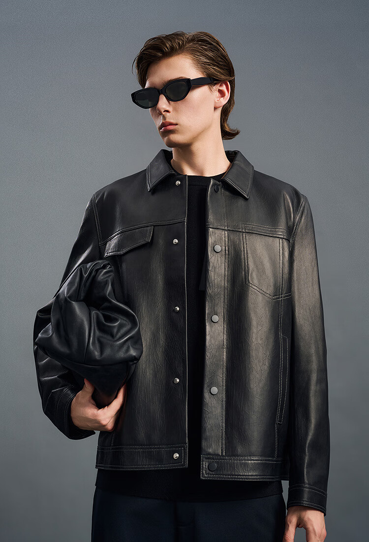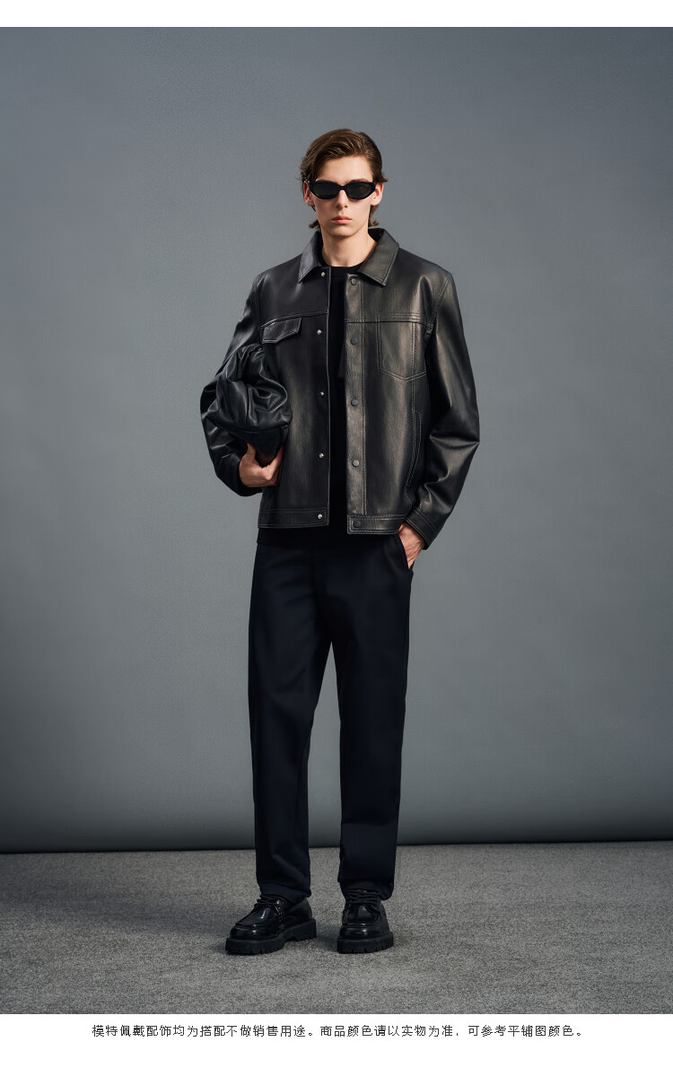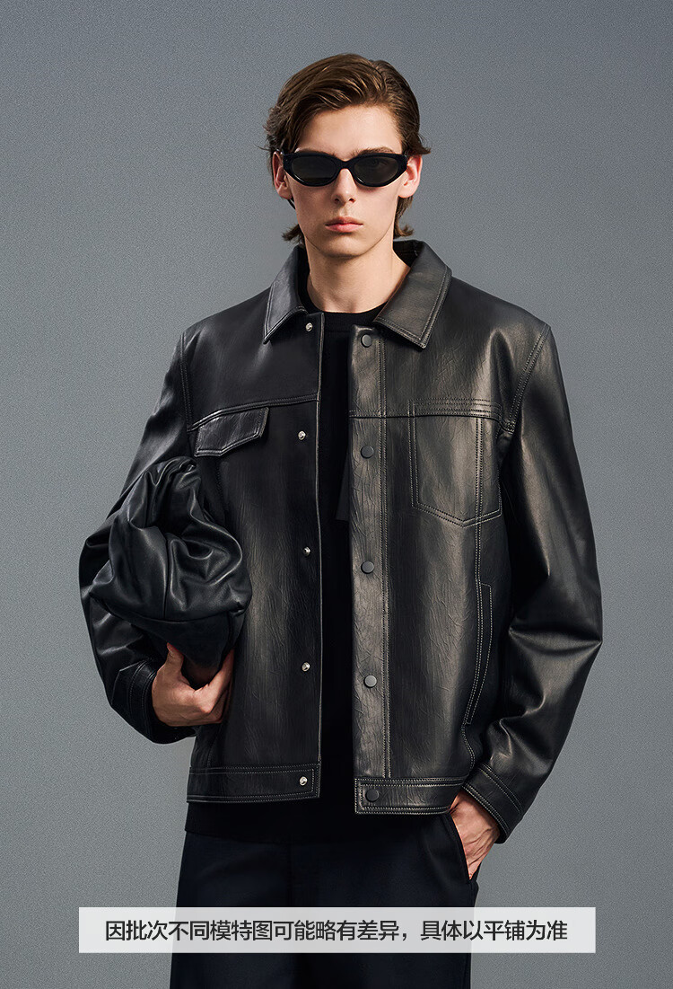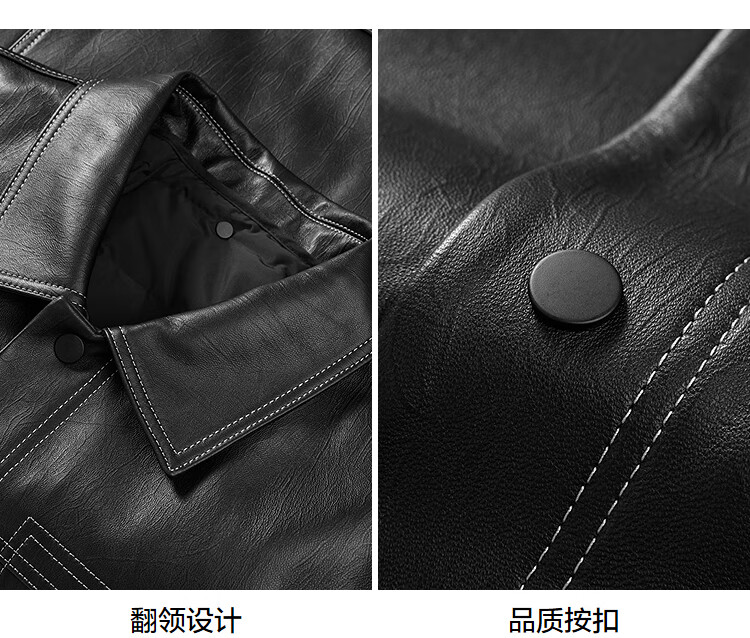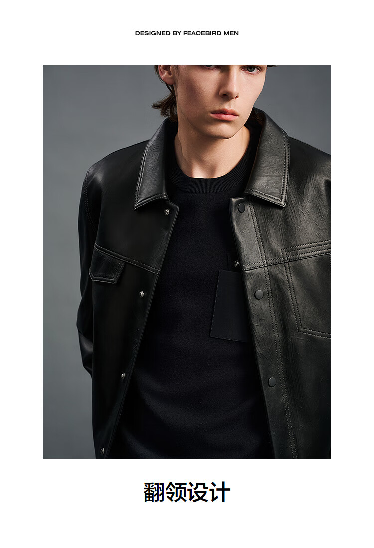 PEACEBIRD Men's Genuine Leather Jacket Topstitched Lapel Jacket Retro Casual Jacket B1BDE4F01 Black 1 L