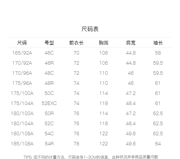China (cm) 165 / 88-90 170 / 96-98 175 / 108-110 180 / 118-122 185 / 126-130