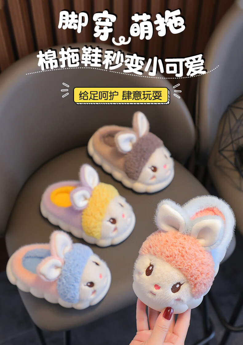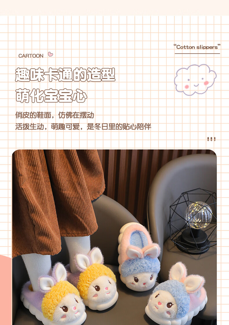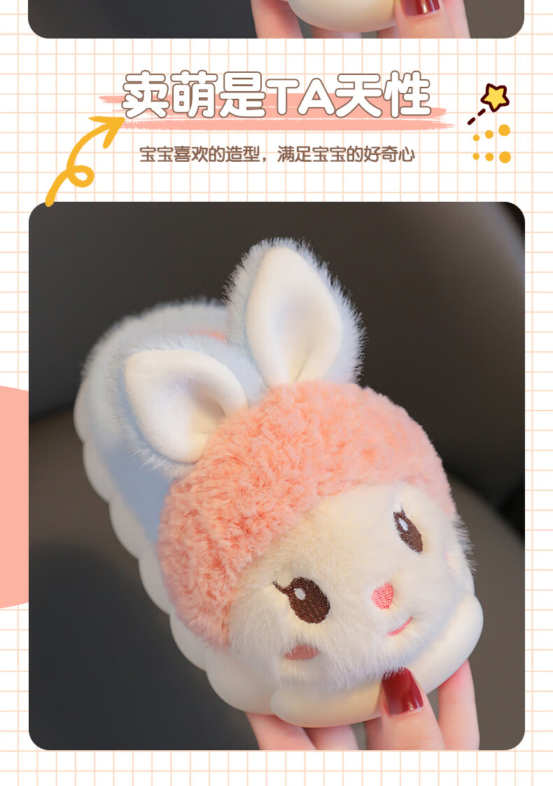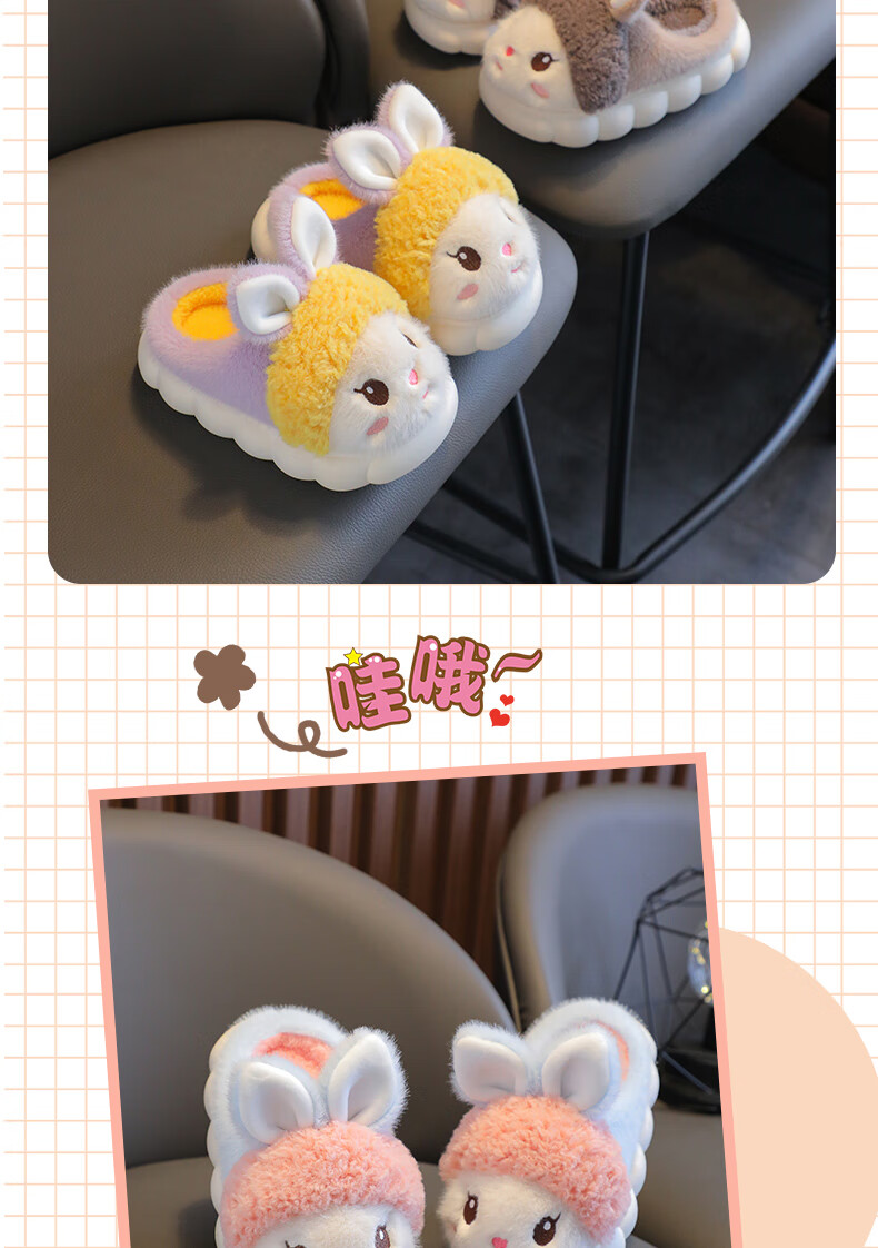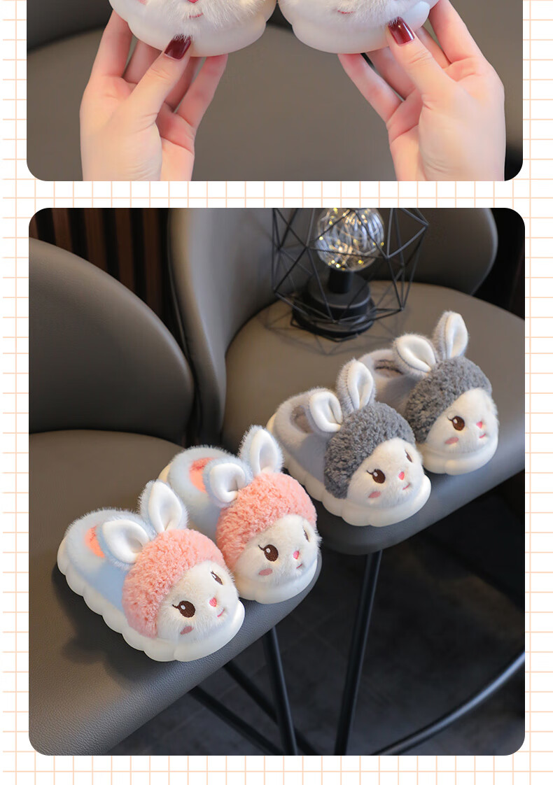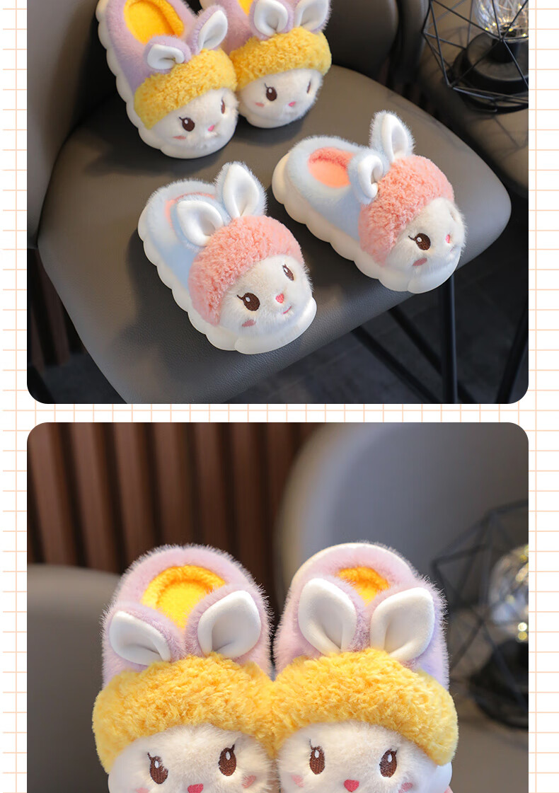 Candy astringent children's cotton slippers, winter plus velvet, thickened, warm, soft sole, non-slip, home cartoon rabbit, boys and girls, baby cotton slippers, heel included, pink, size 22-23, inner length 14cm