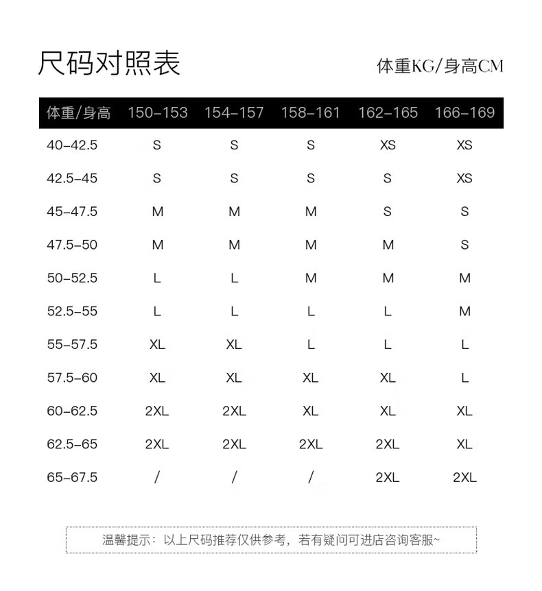 China (cm) 160-165/84-86 165-170 / 88-90 167-172 / 92-96 168-173 / 98-102 170-176 / 106-110