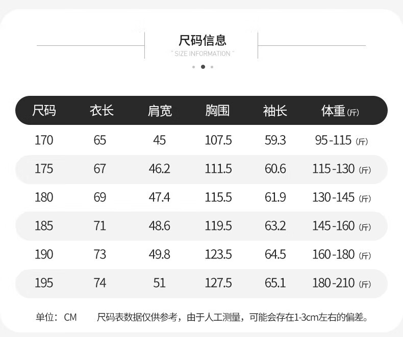 China (cm) 165 / 88-90 170 / 96-98 175 / 108-110 180 / 118-122 185 / 126-130