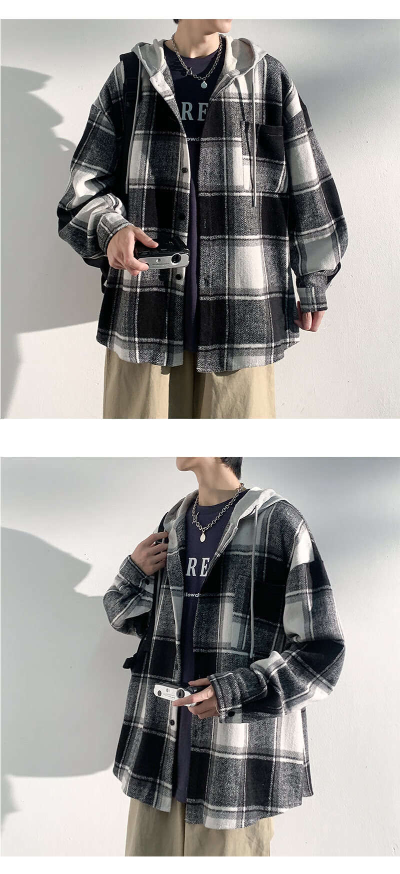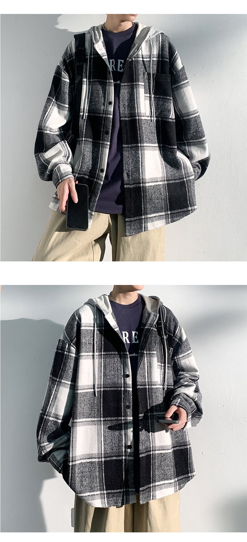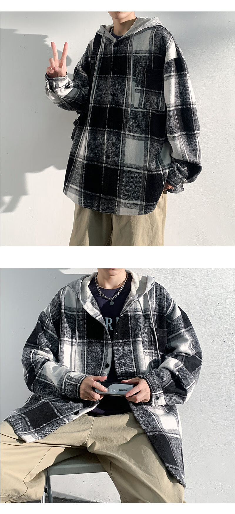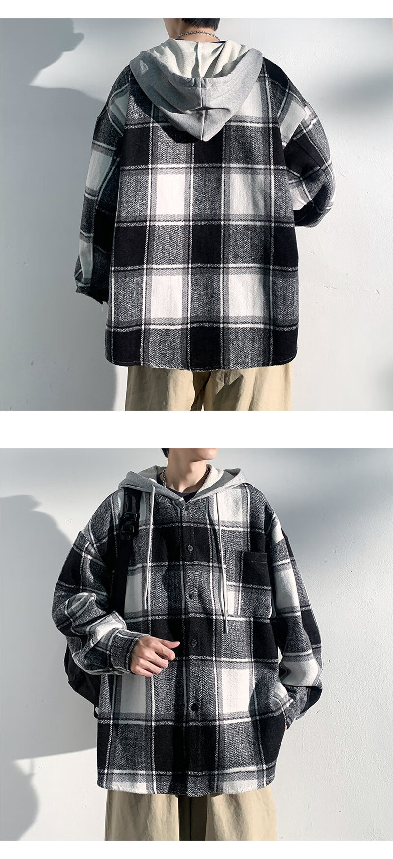 Playboy hooded men's shirt long-sleeved spring and autumn new thickened loose trendy casual plaid shirt jacket for men J25858 black plaid XL recommended 130-145Jin Jin equals 0.5 kg
