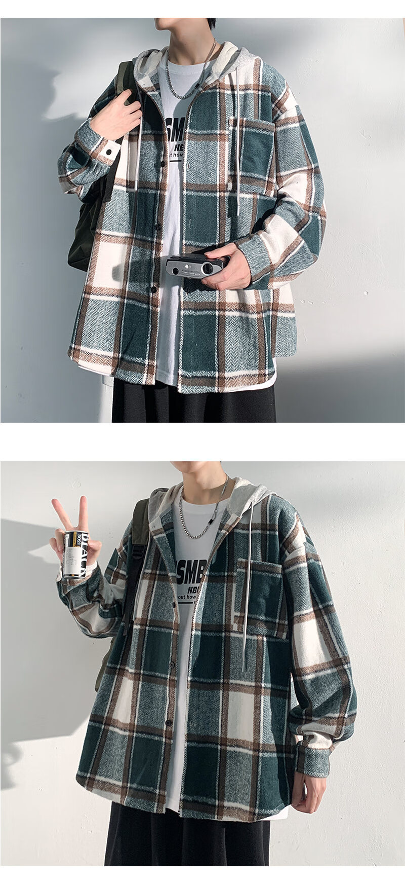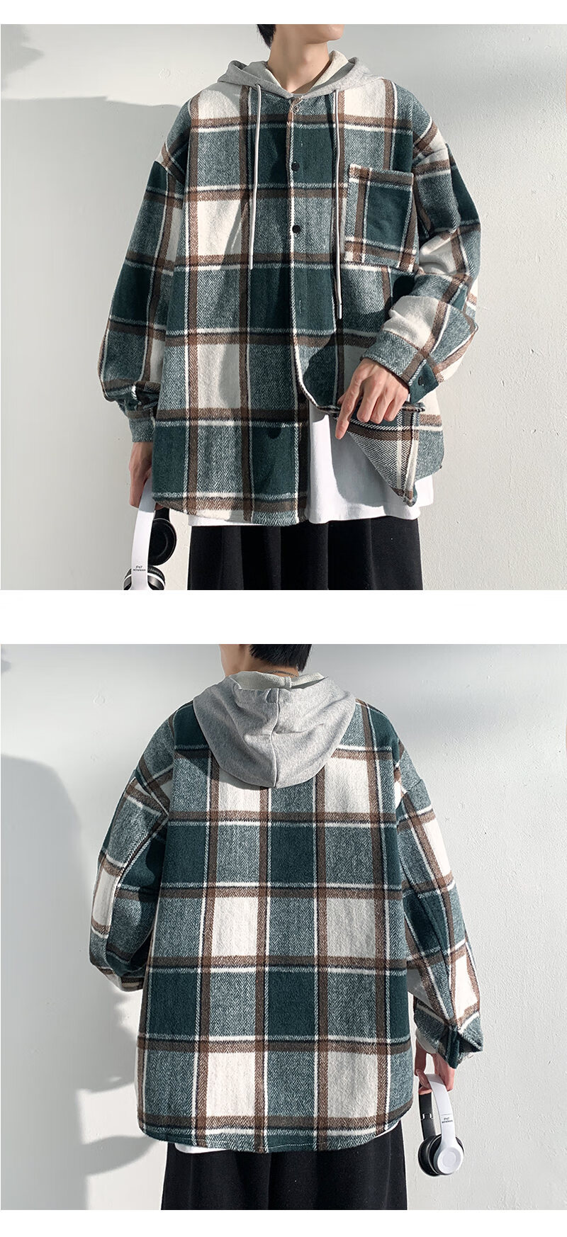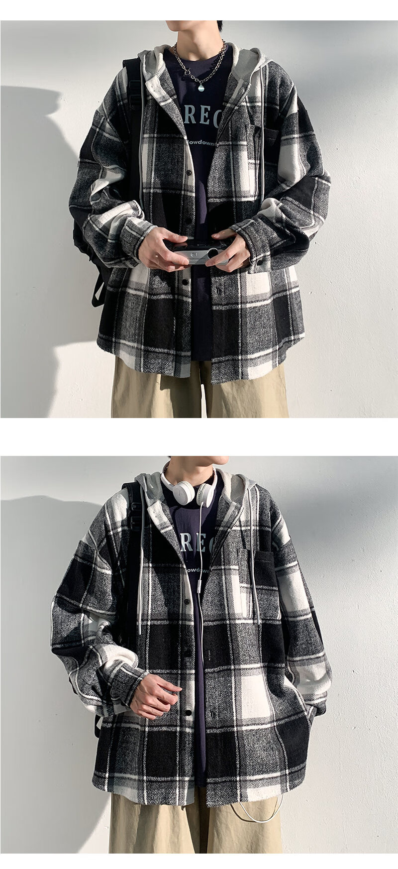 Playboy hooded men's shirt long-sleeved spring and autumn new thickened loose trendy casual plaid shirt jacket for men J25858 black plaid XL recommended 130-145Jin Jin equals 0.5 kg