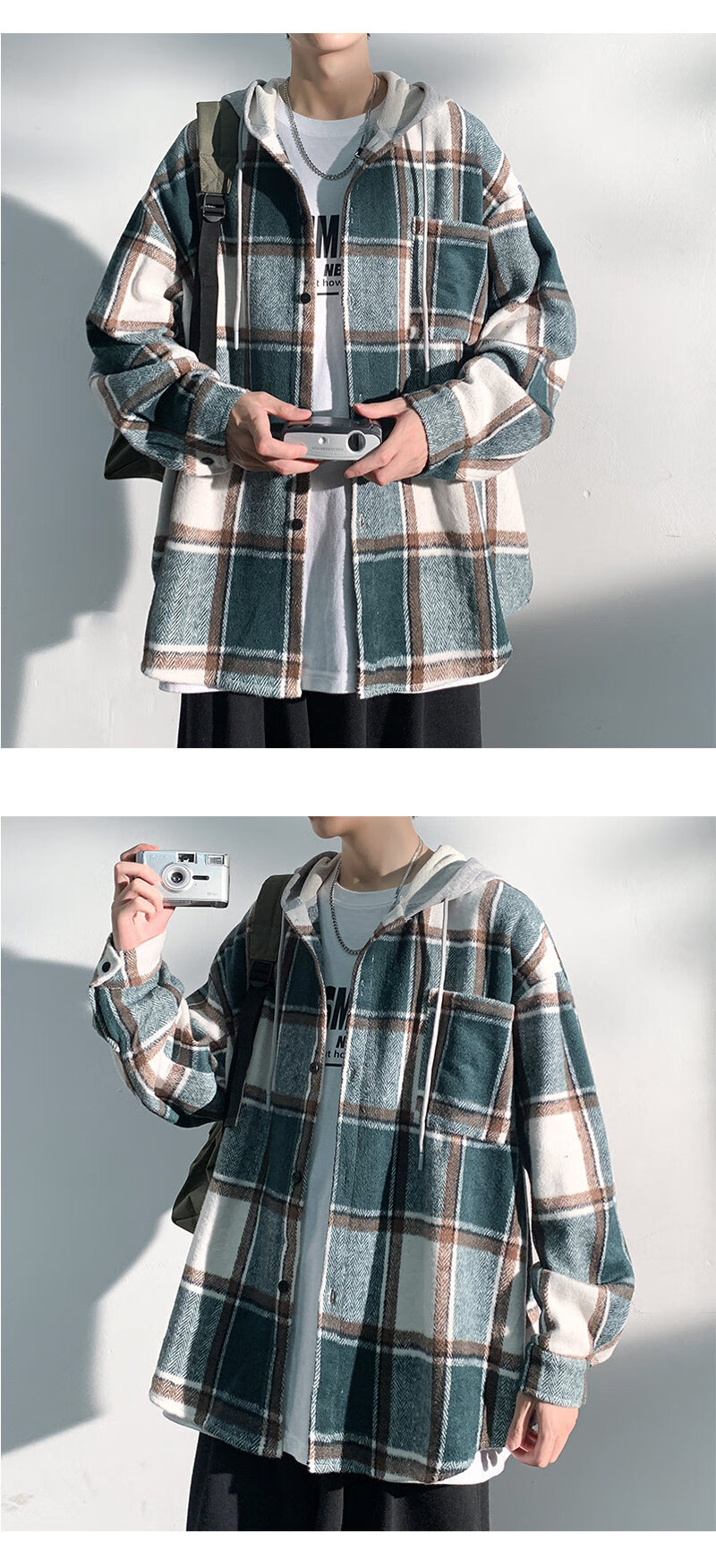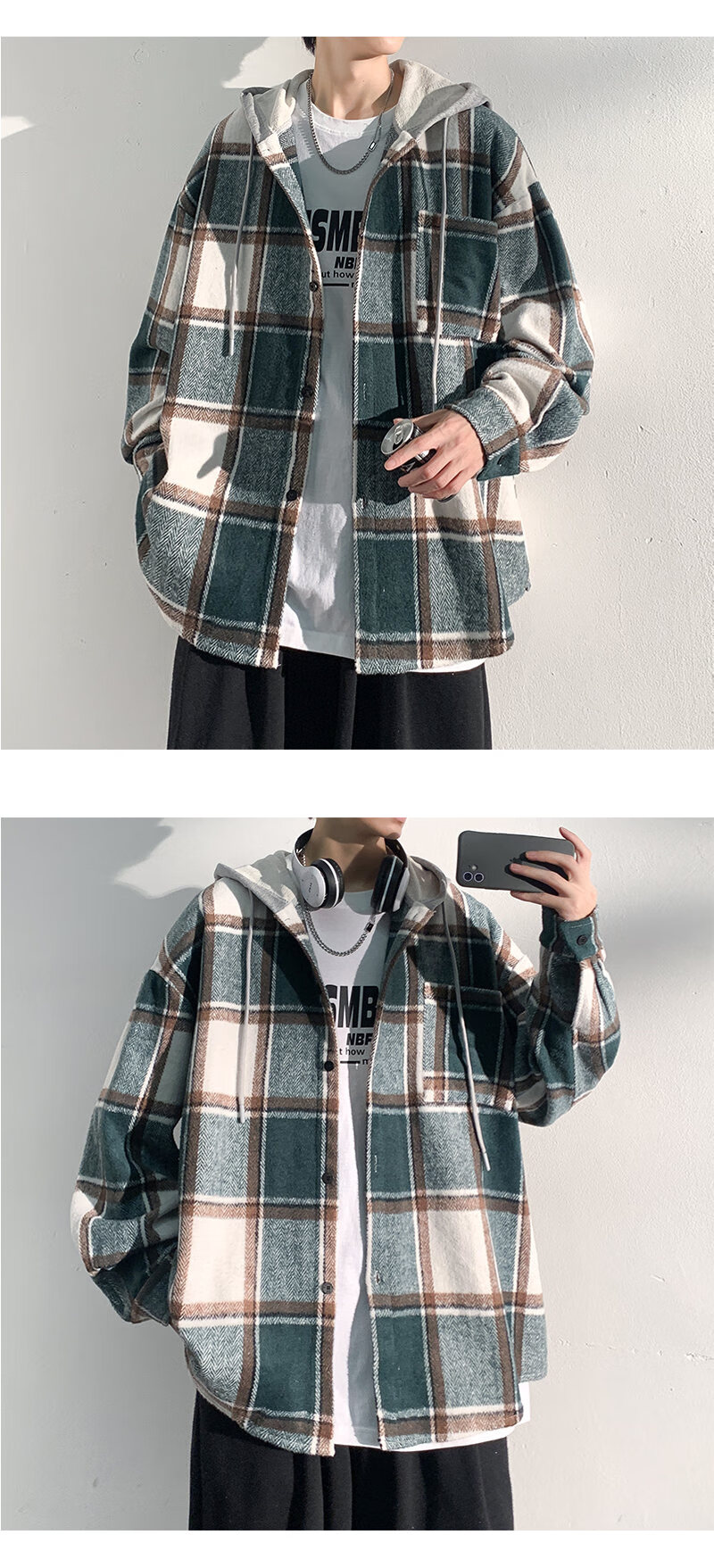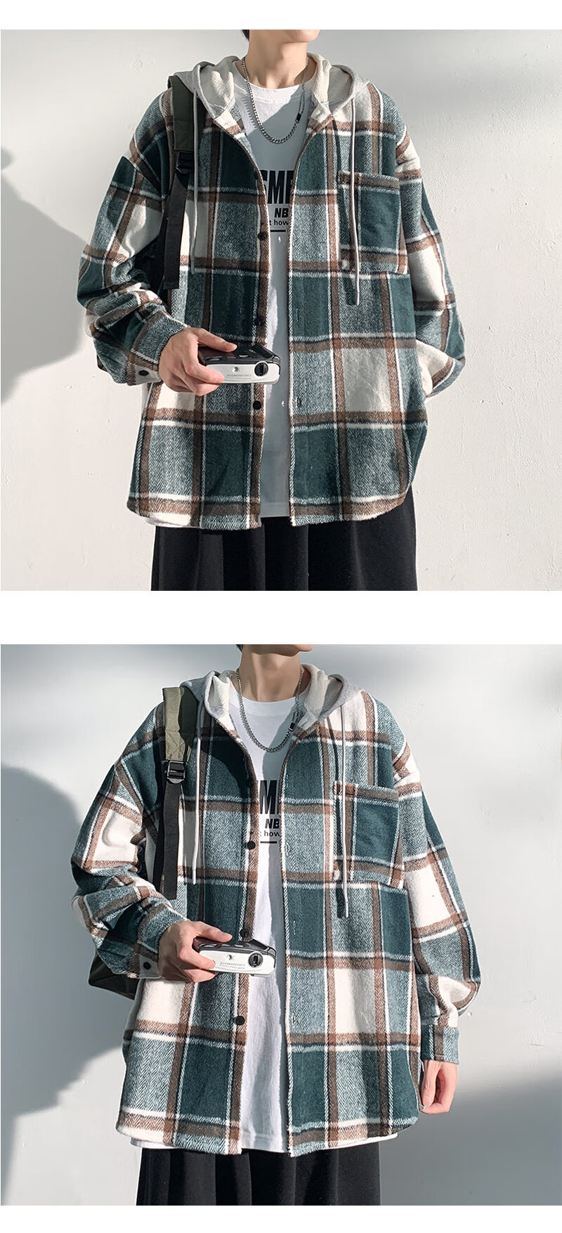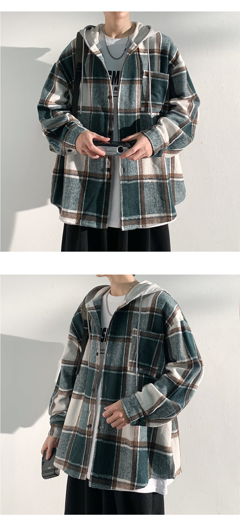 Playboy hooded men's shirt long-sleeved spring and autumn new thickened loose trendy casual plaid shirt jacket for men J25858 black plaid XL recommended 130-145Jin Jin equals 0.5 kg