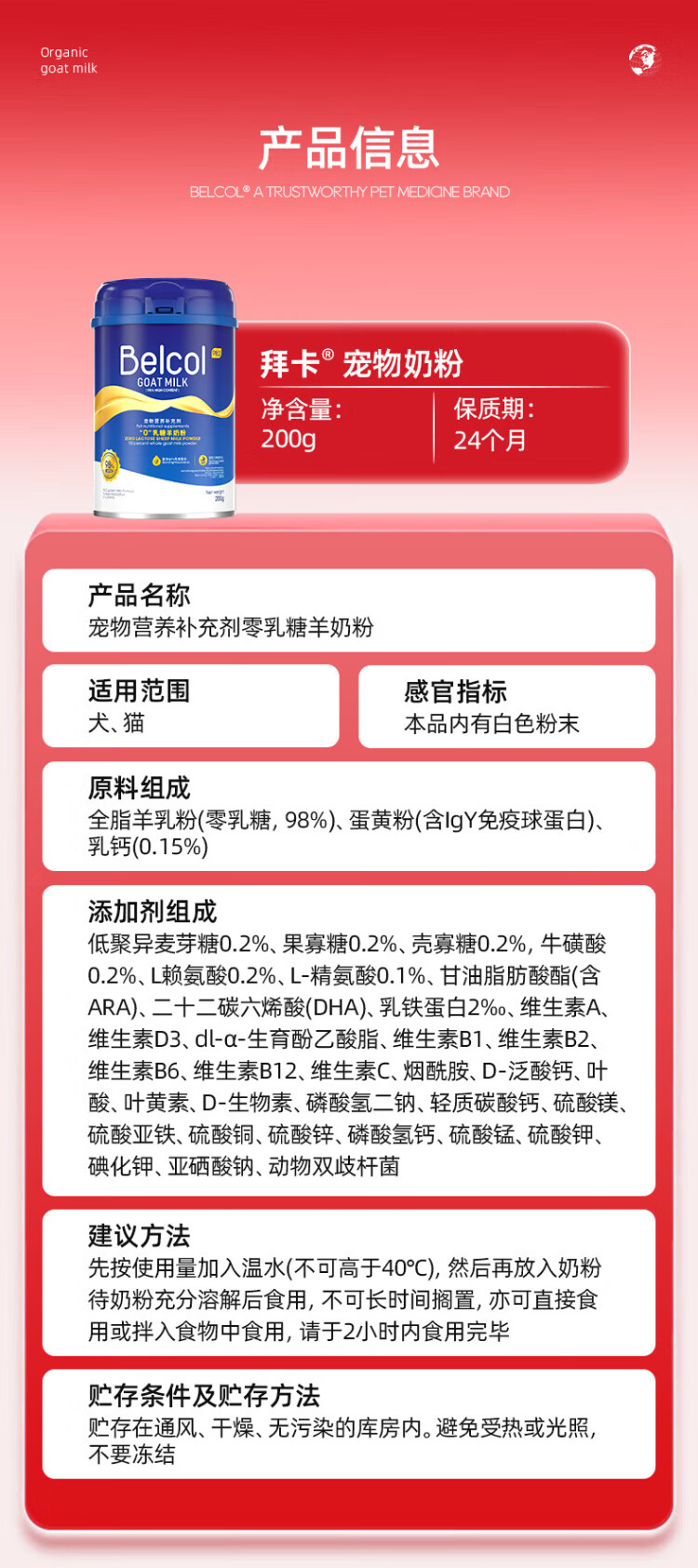 Baika Baika 0 Lactose Goat Milk Powder Dog Kittens Newborn Cat Puppies 0-4 Months Special Imported Raw Material Pets 98% Zero Lactose Goat Milk Powder 200g
