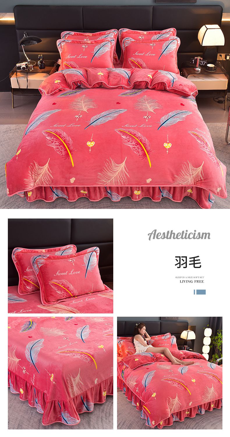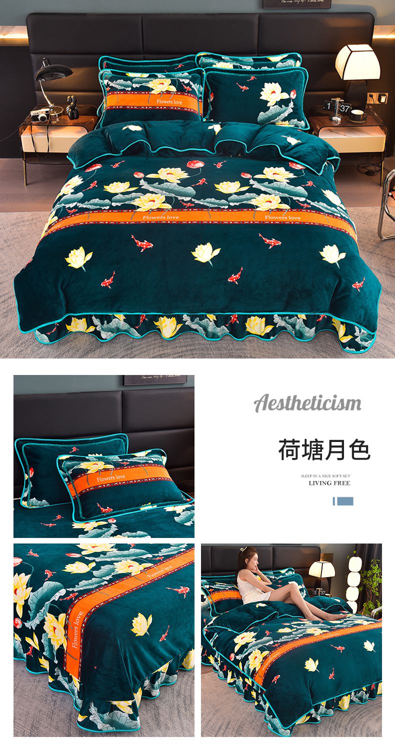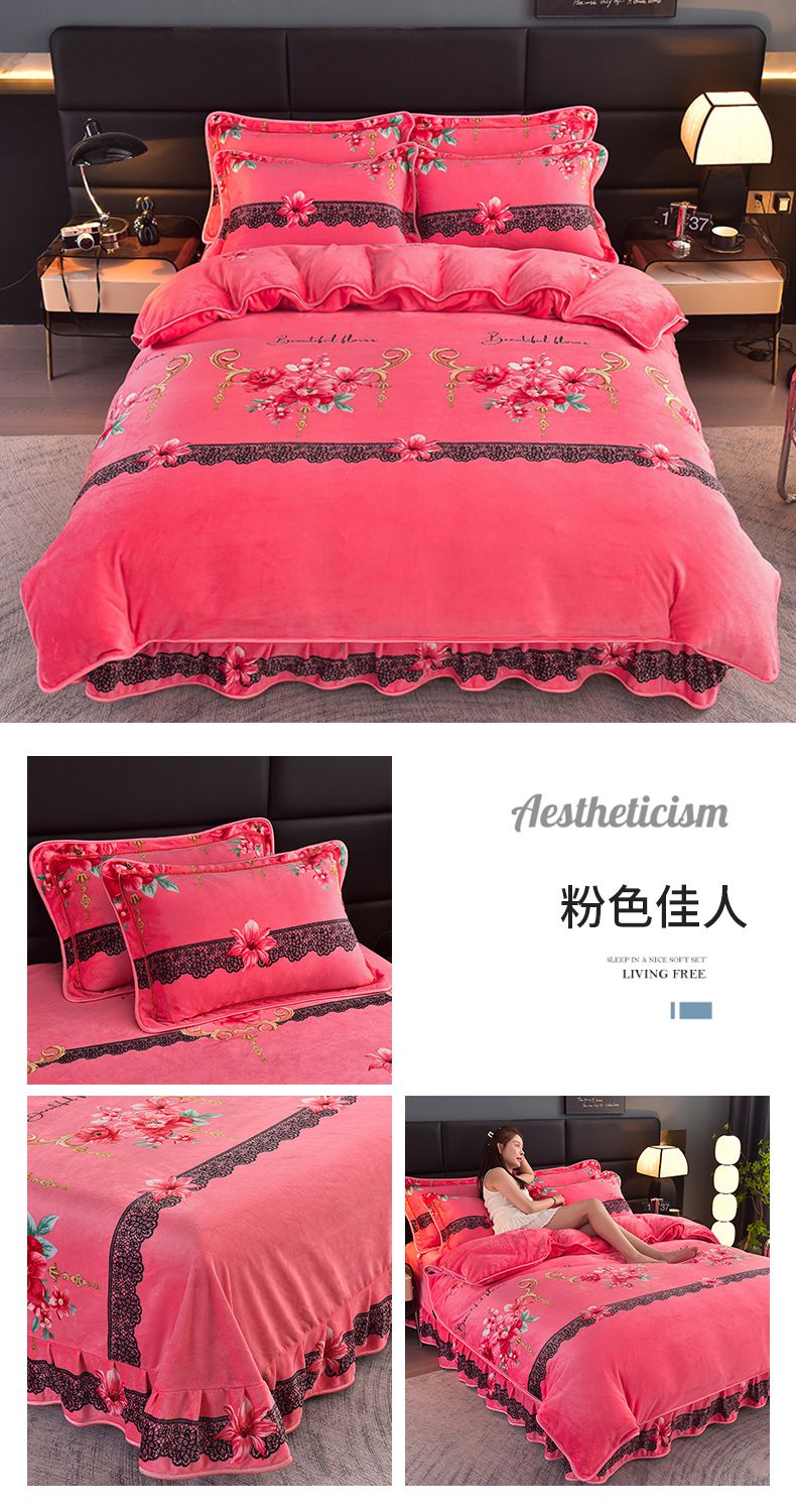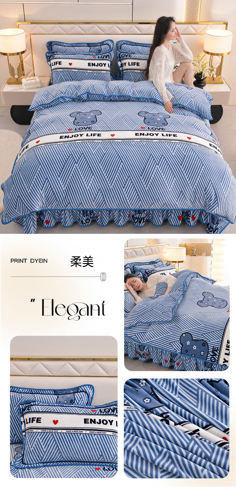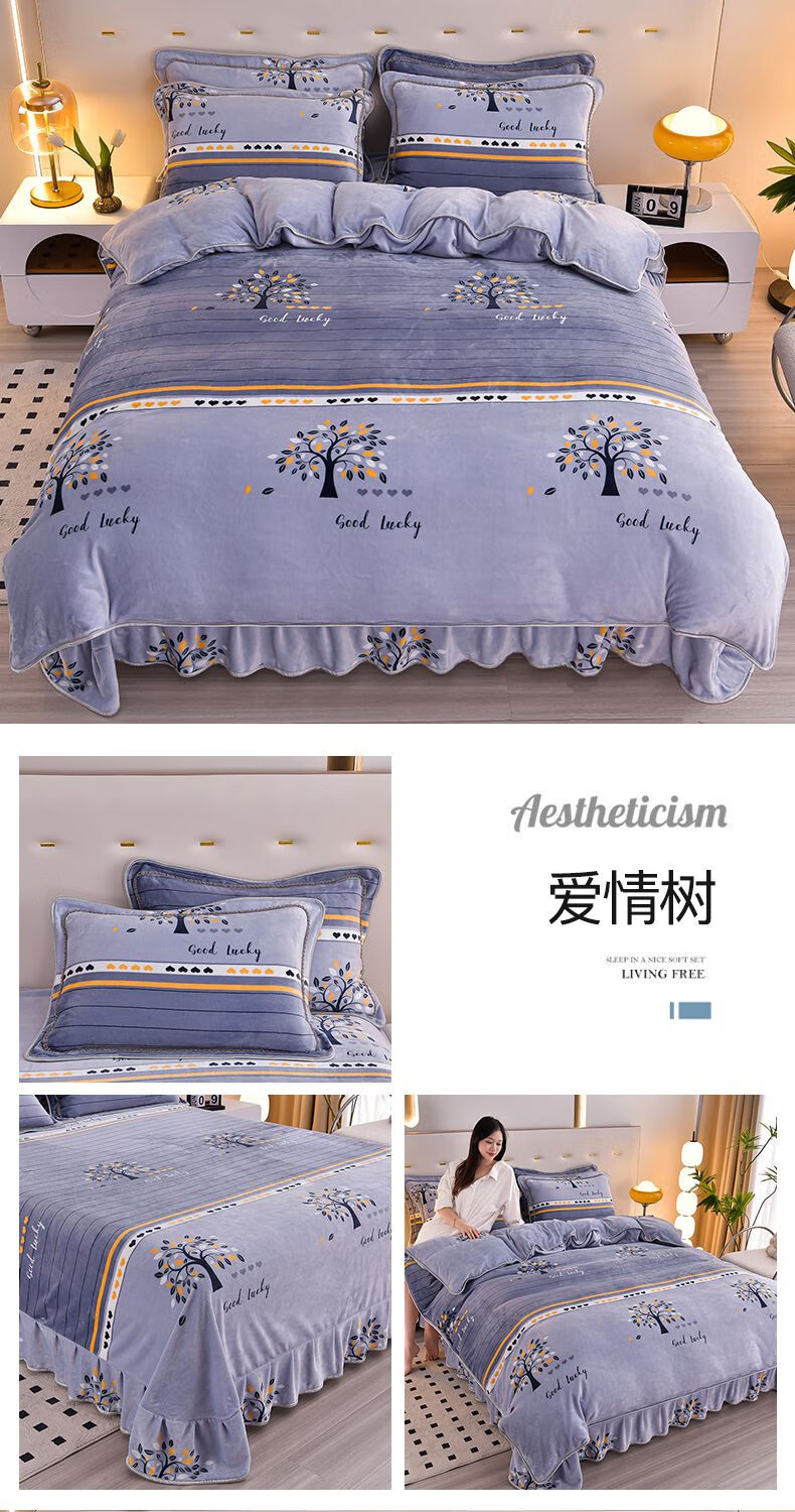 Mercury series milk velvet four-piece set for winter thickened coral velvet 2025 new double-sided flannel quilt cover bed skirt bedding pattern sentiment thickened and warm anti-static hot at the touch 1.5/1.8m bed skirt style four-piece set-quilt cover 200*230