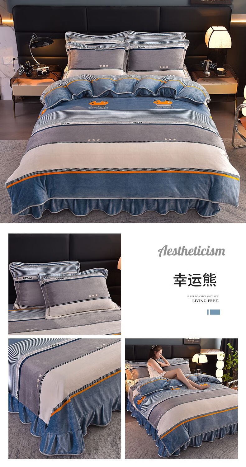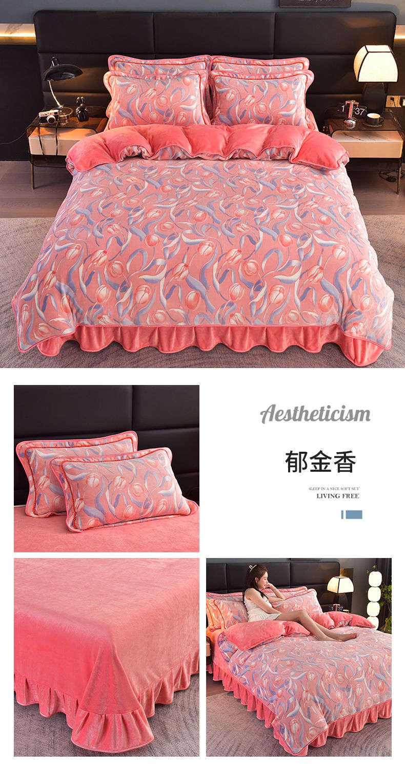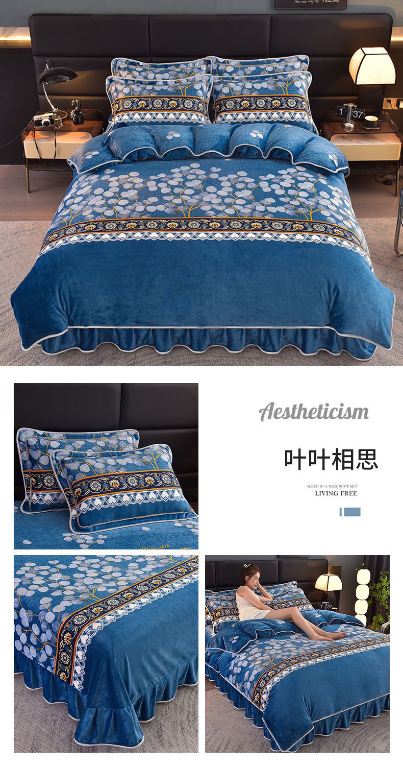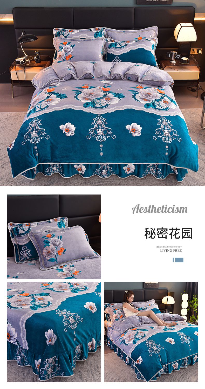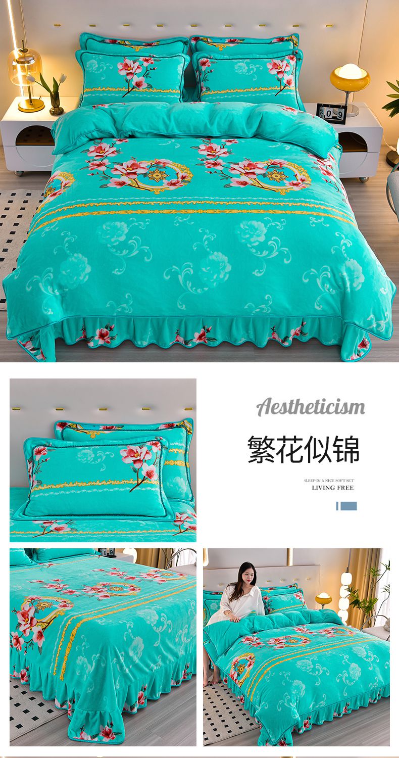 Mercury series milk velvet four-piece set for winter thickened coral velvet 2025 new double-sided flannel quilt cover bed skirt bedding pattern sentiment thickened and warm anti-static hot at the touch 1.5/1.8m bed skirt style four-piece set-quilt cover 200*230
