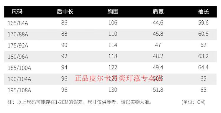 China (cm) 165 / 88-90 170 / 96-98 175 / 108-110 180 / 118-122 185 / 126-130