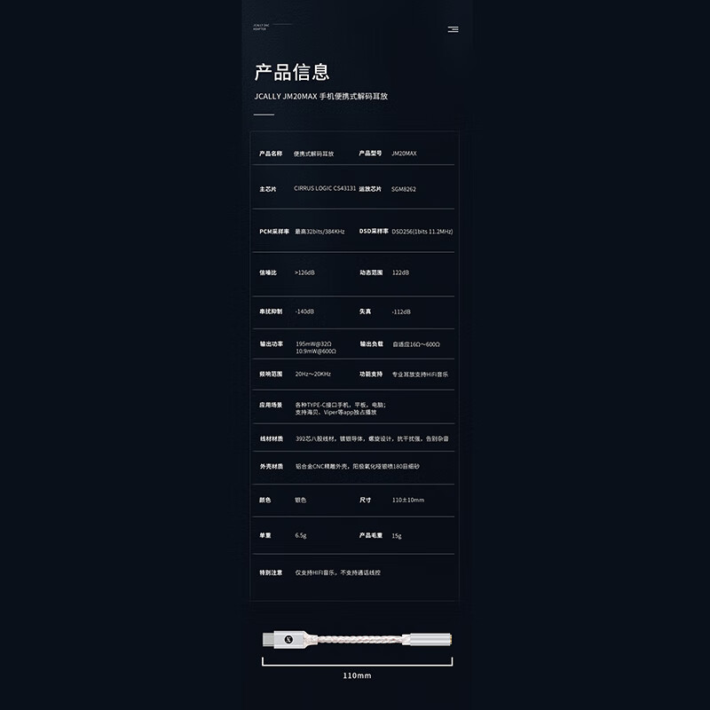 JCALLY JM20MAX small tail DAC decoder amp decoder Type-C headphone accessories HiFi audio CS43131+SGM8262 professional fever lossless music player JM20MAX silver