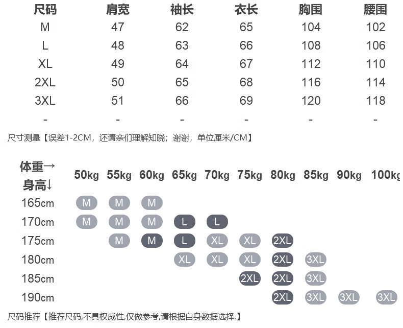 China (cm) 165 / 88-90 170 / 96-98 175 / 108-110 180 / 118-122 185 / 126-130