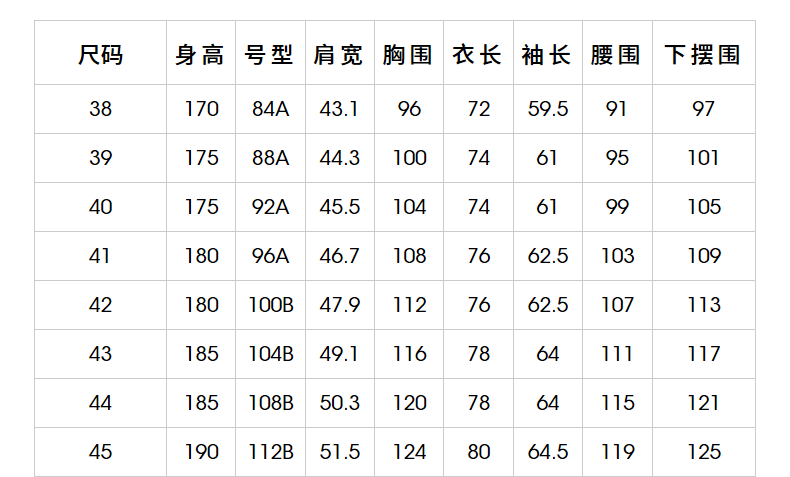 China (cm) 160-165/84-86 165-170 / 88-90 167-172 / 92-96 168-173 / 98-102 170-176 / 106-110