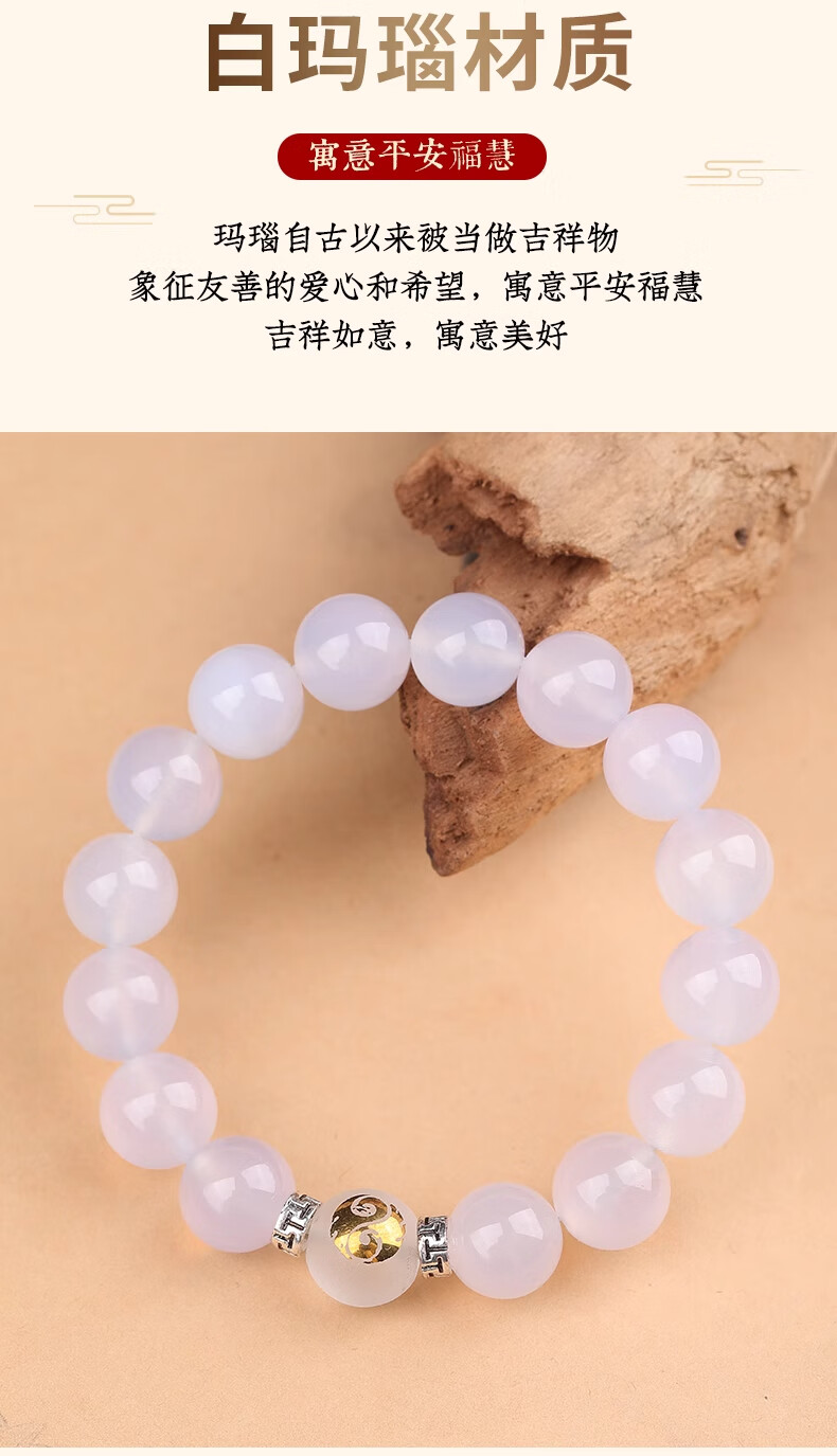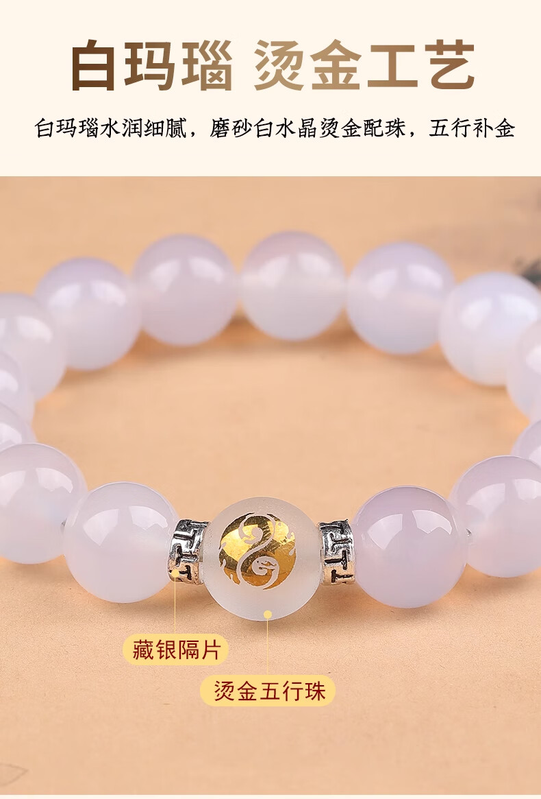 Baoxin Fanrui BOSFRU Five Elements Gold-Supplementing Gold Crystal Bracelet Natural Balance Stem for Tian Gua White Gold Jewelry Agate Bracelet Gift Five Elements Gold-Supplementing White Agate Bracelet Bead Diameter 10mm