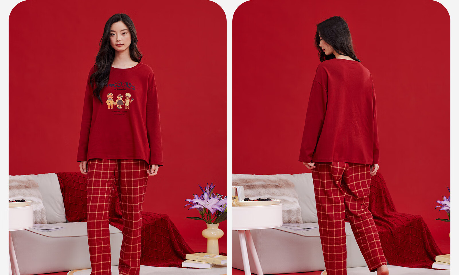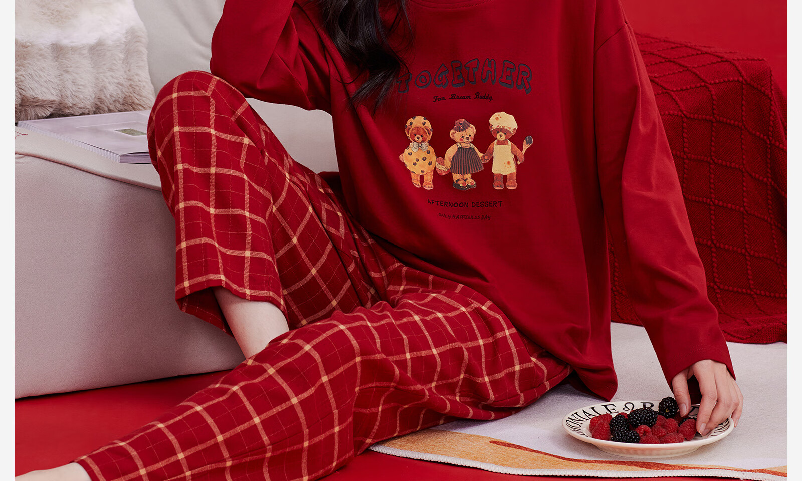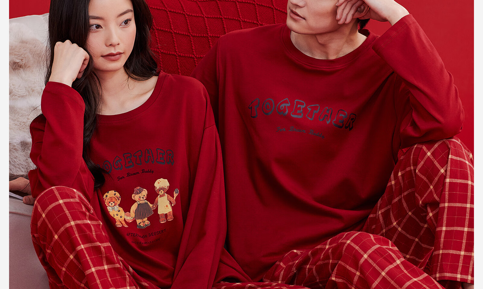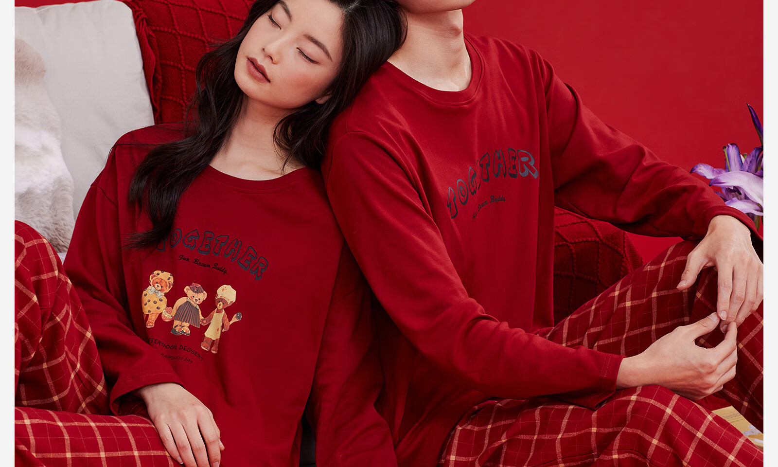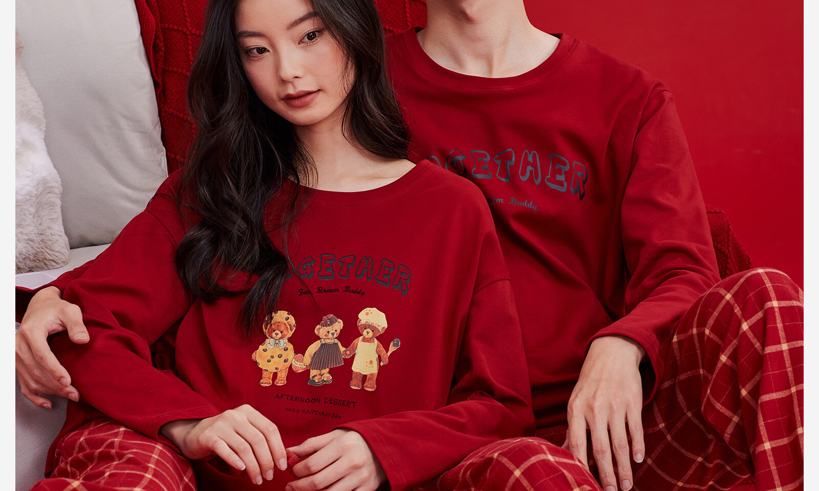 Darli red round neck couple pajamas for women spring and autumn pure cotton long-sleeved cartoon print wedding year red home clothes for men T8245243-029-red women M