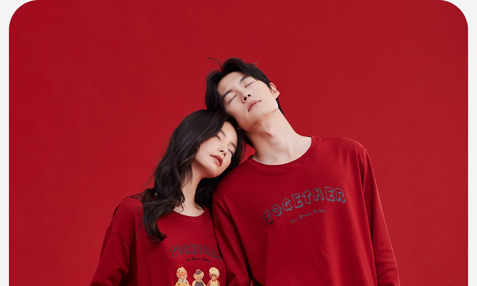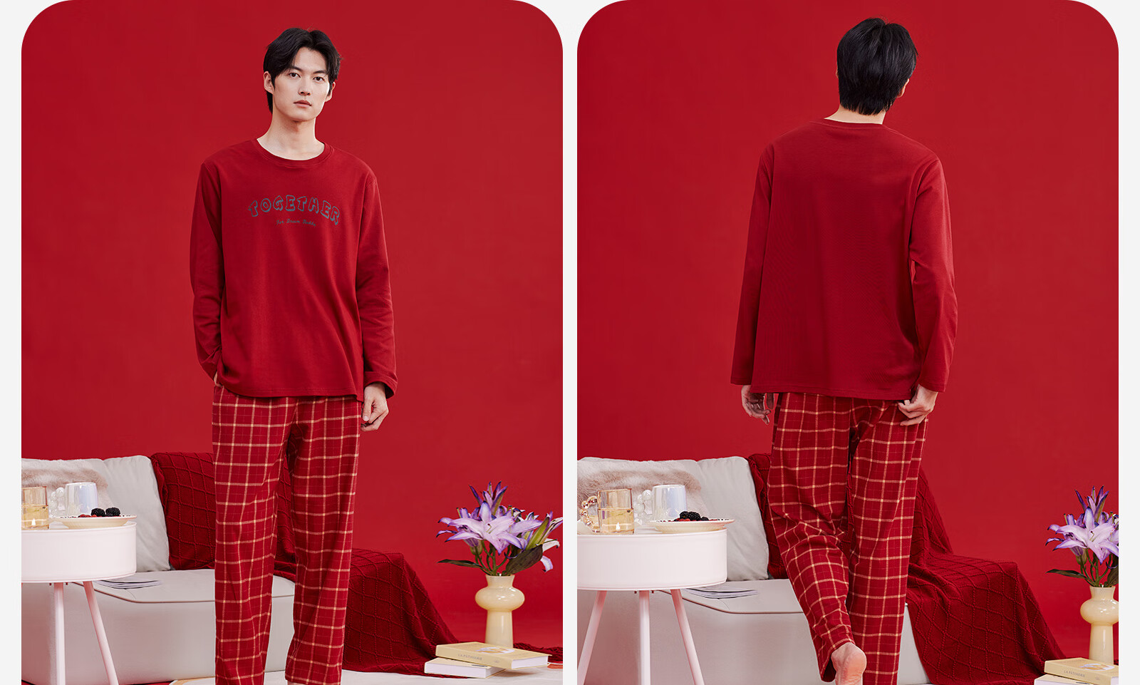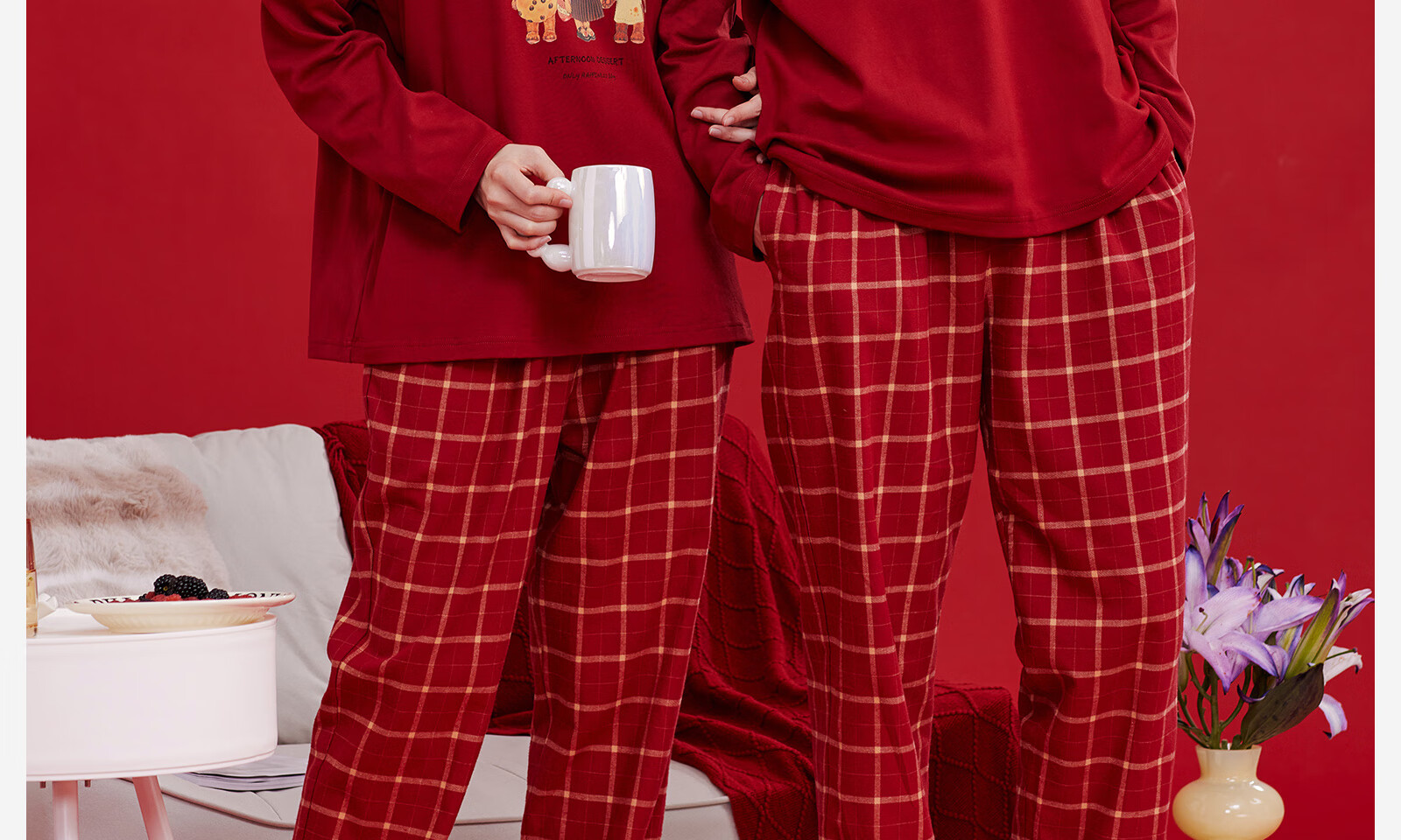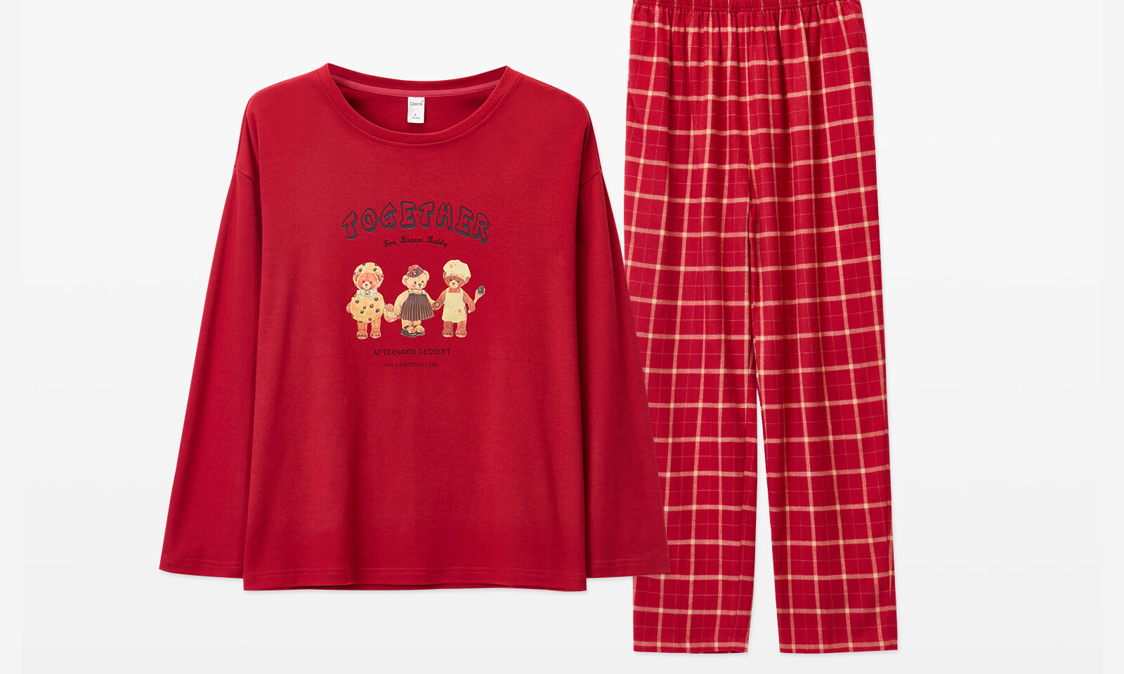Darli red round neck couple pajamas for women spring and autumn pure cotton long-sleeved cartoon print wedding year red home clothes for men T8245243-029-red women M