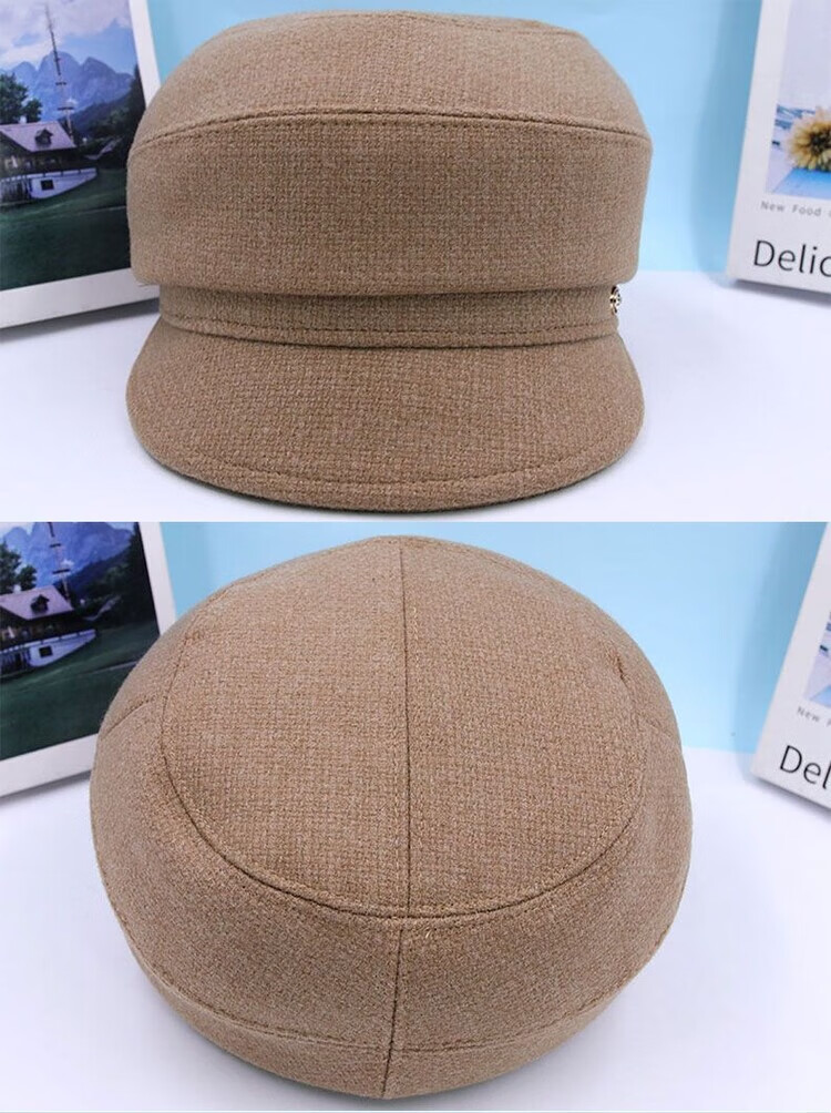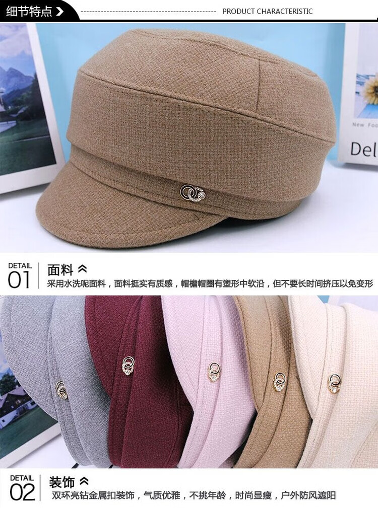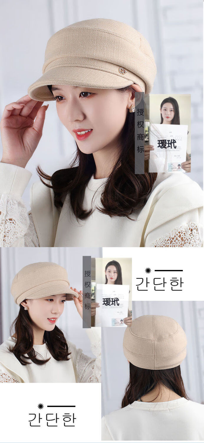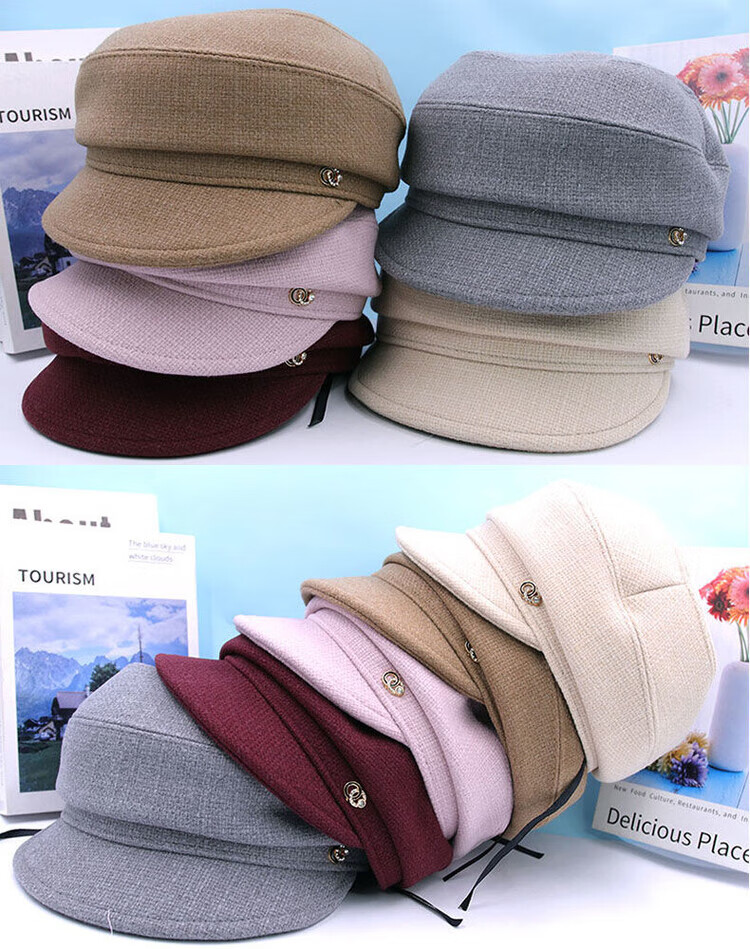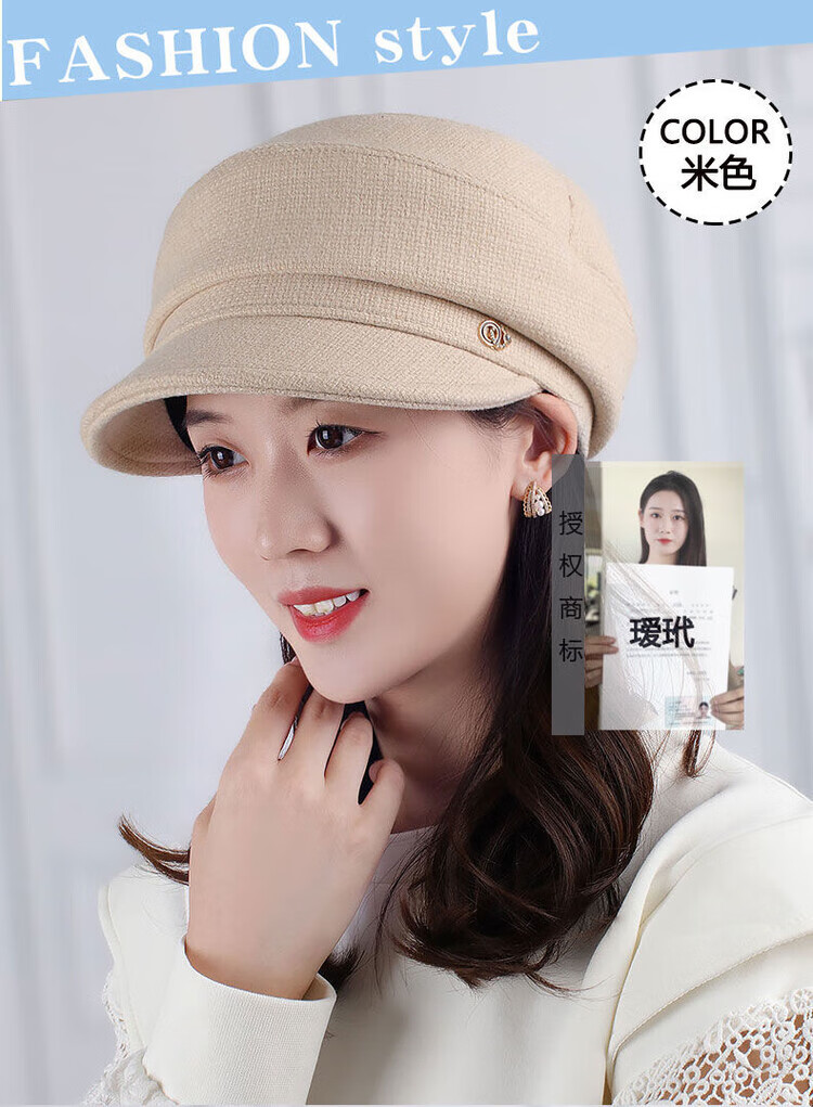 Hengyuanxiang Autumn and Winter Metal Decoration Feminine Peaked Cap Elegant and Versatile Woolen Beret Dome Beret Net Red Hat Autumn Beige 54-58 Drawstring
