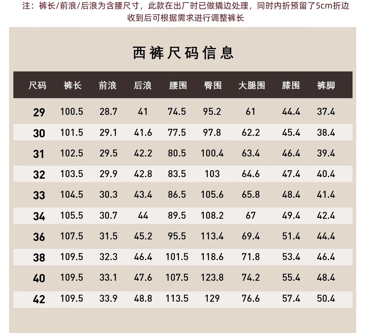 Outseam (cm) 99 cm 101.5 cm 104 cm 106.5 cm 109 cm