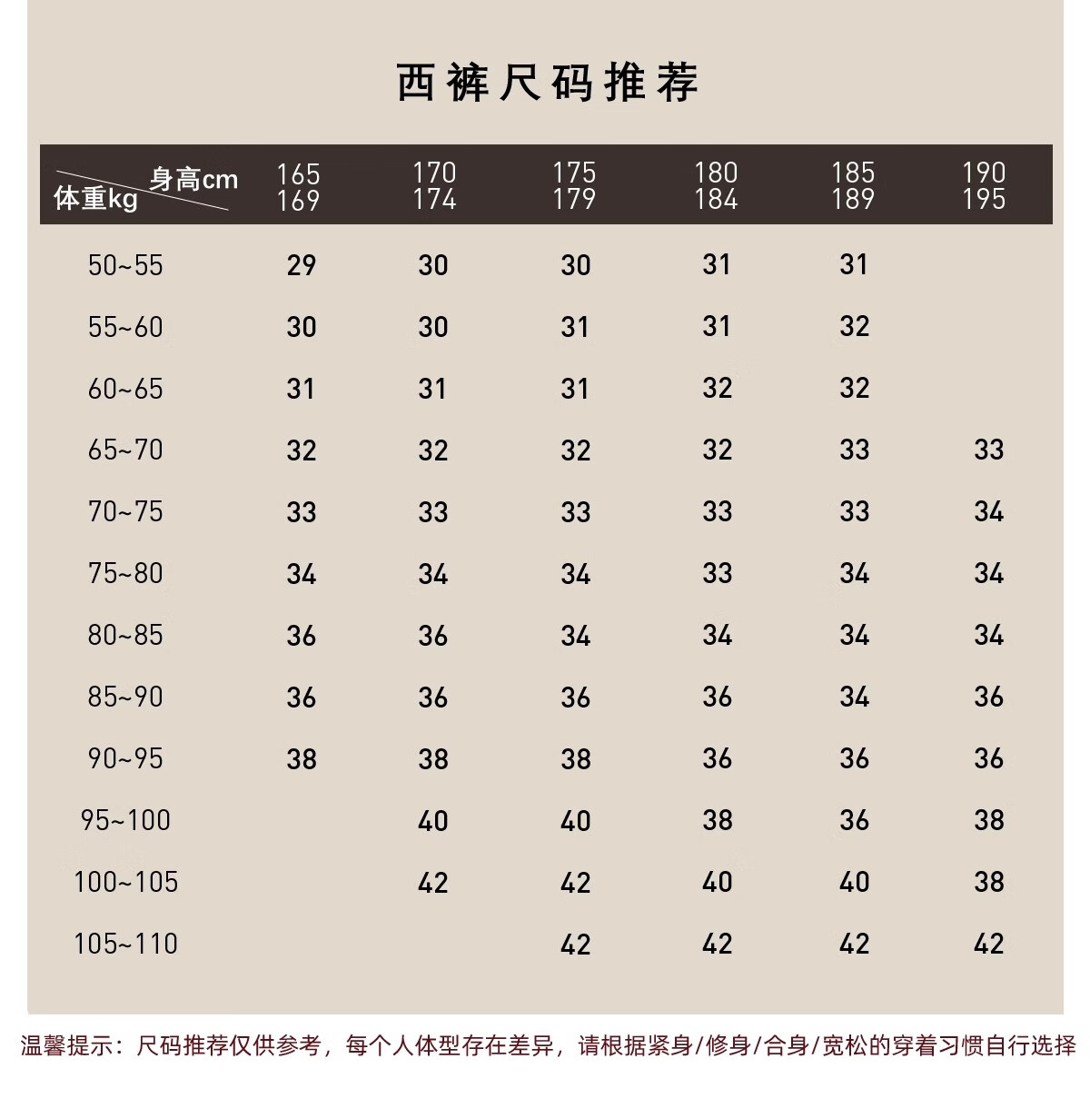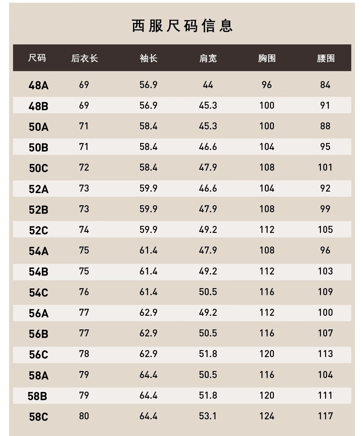 China (cm) 160-165/84-86 165-170 / 88-90 167-172 / 92-96 168-173 / 98-102 170-176 / 106-110
