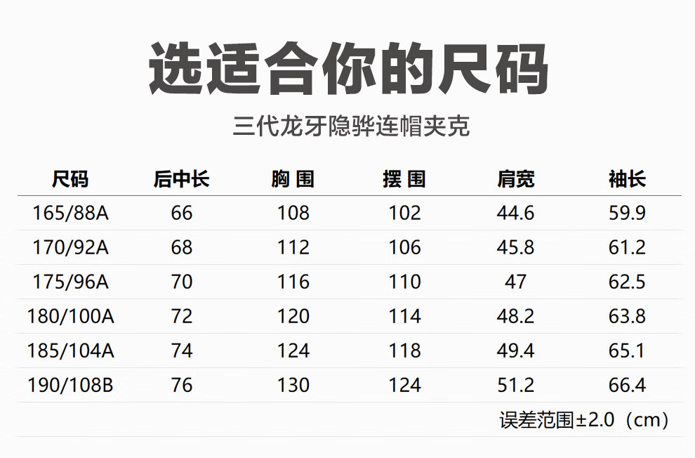 China (cm) 165 / 88-90 170 / 96-98 175 / 108-110 180 / 118-122 185 / 126-130