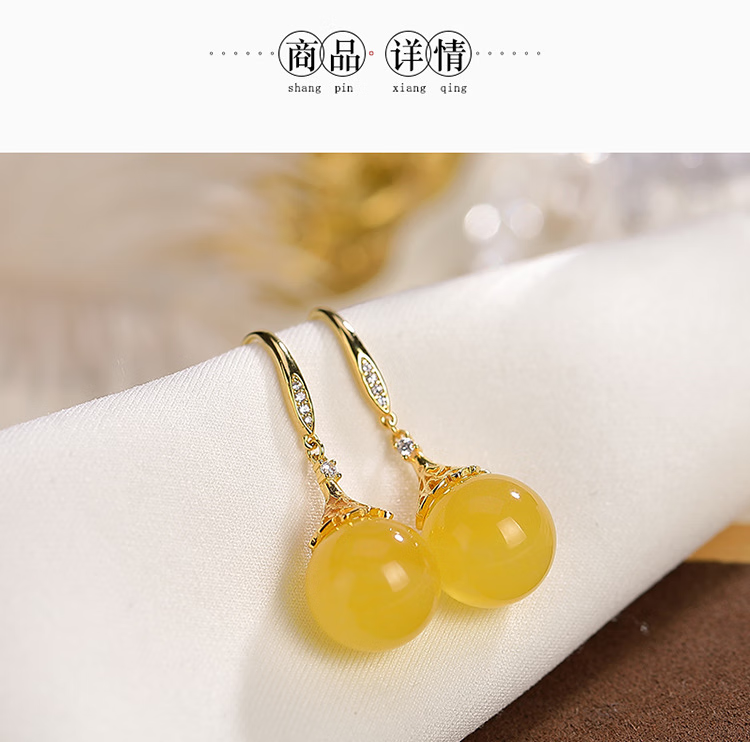 Chengyuanxiang CREORISETINS925 sterling silver gold-plated natural amber beeswax bead earrings, light and luxurious ladies' earrings, beeswax pair