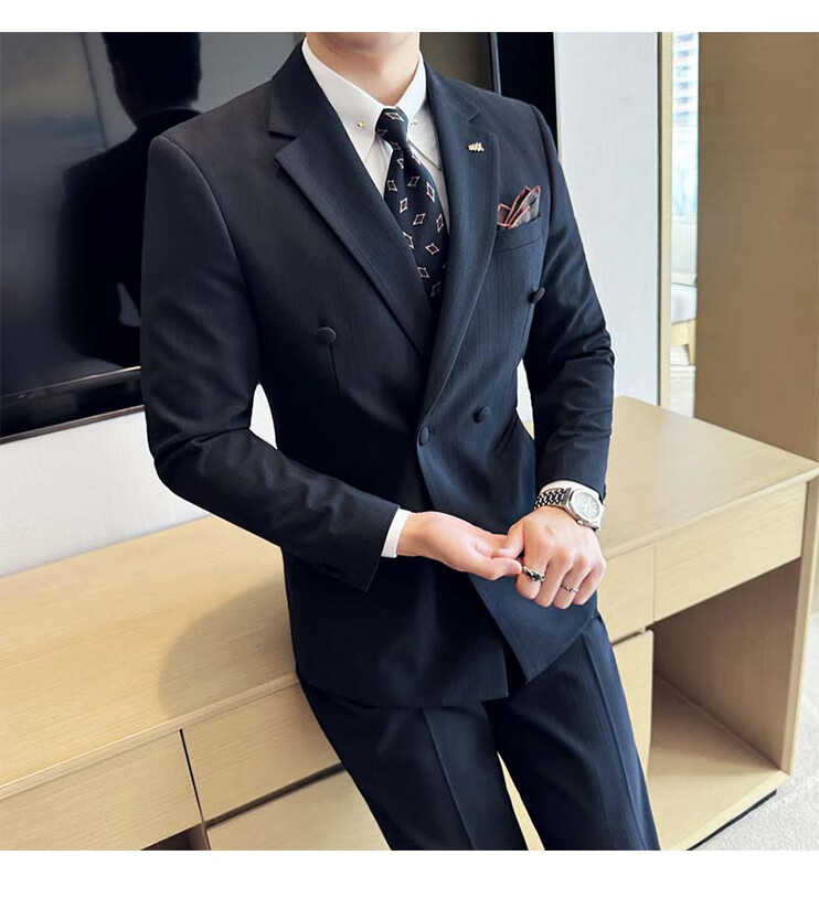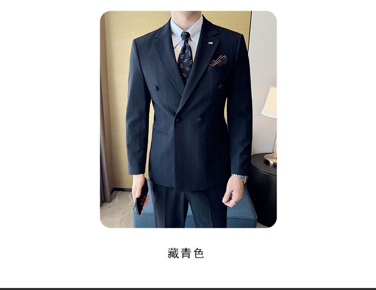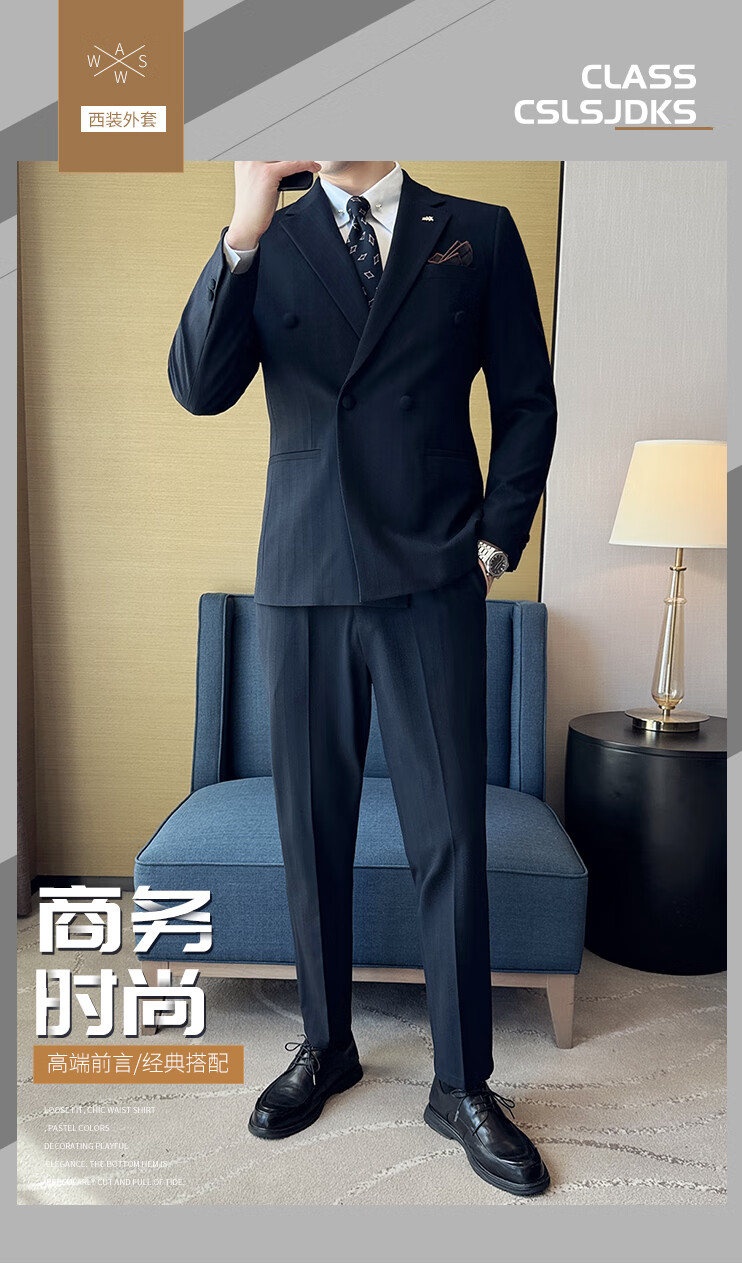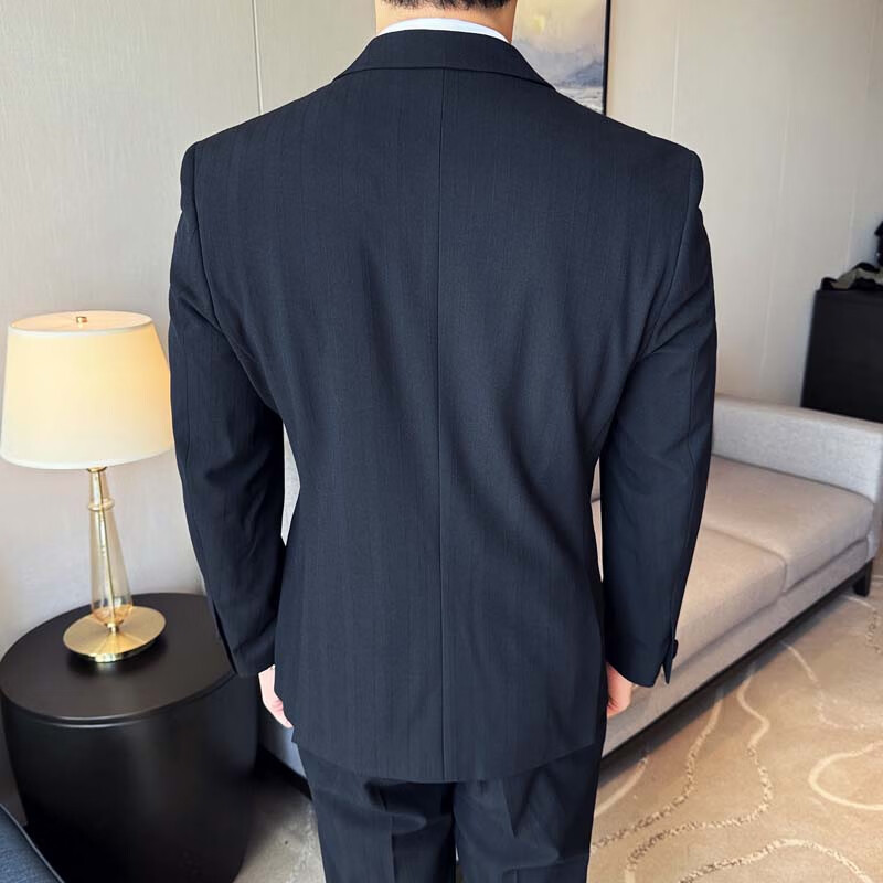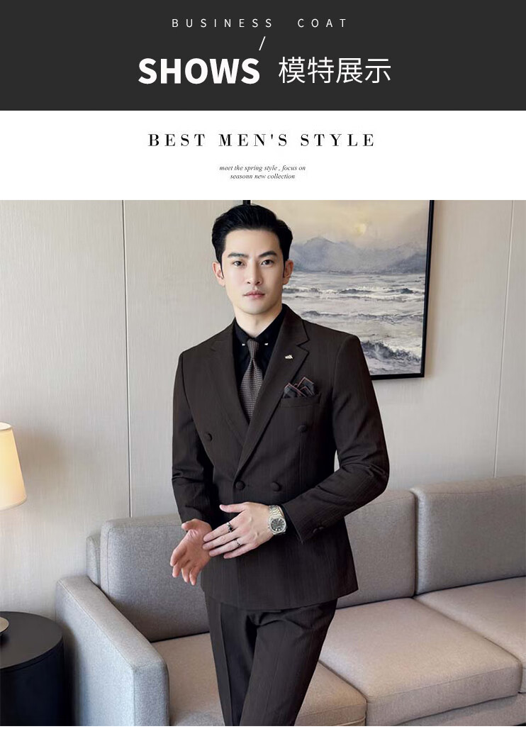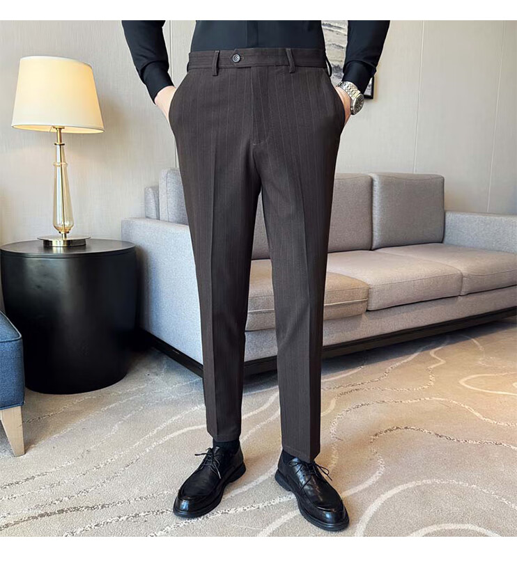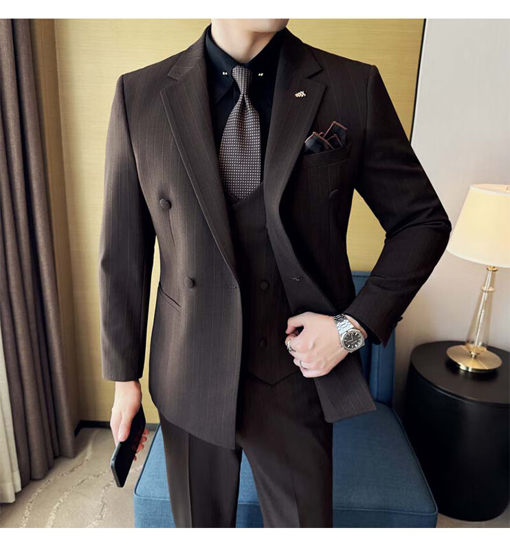 ROMON Light luxury haute couture groom wedding suit male British slim dress business formal striped suit dark coffee color # (suit + trousers) L