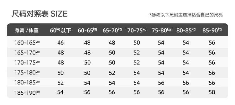 China (cm) 165 / 88-90 170 / 96-98 175 / 108-110 180 / 118-122 185 / 126-130
