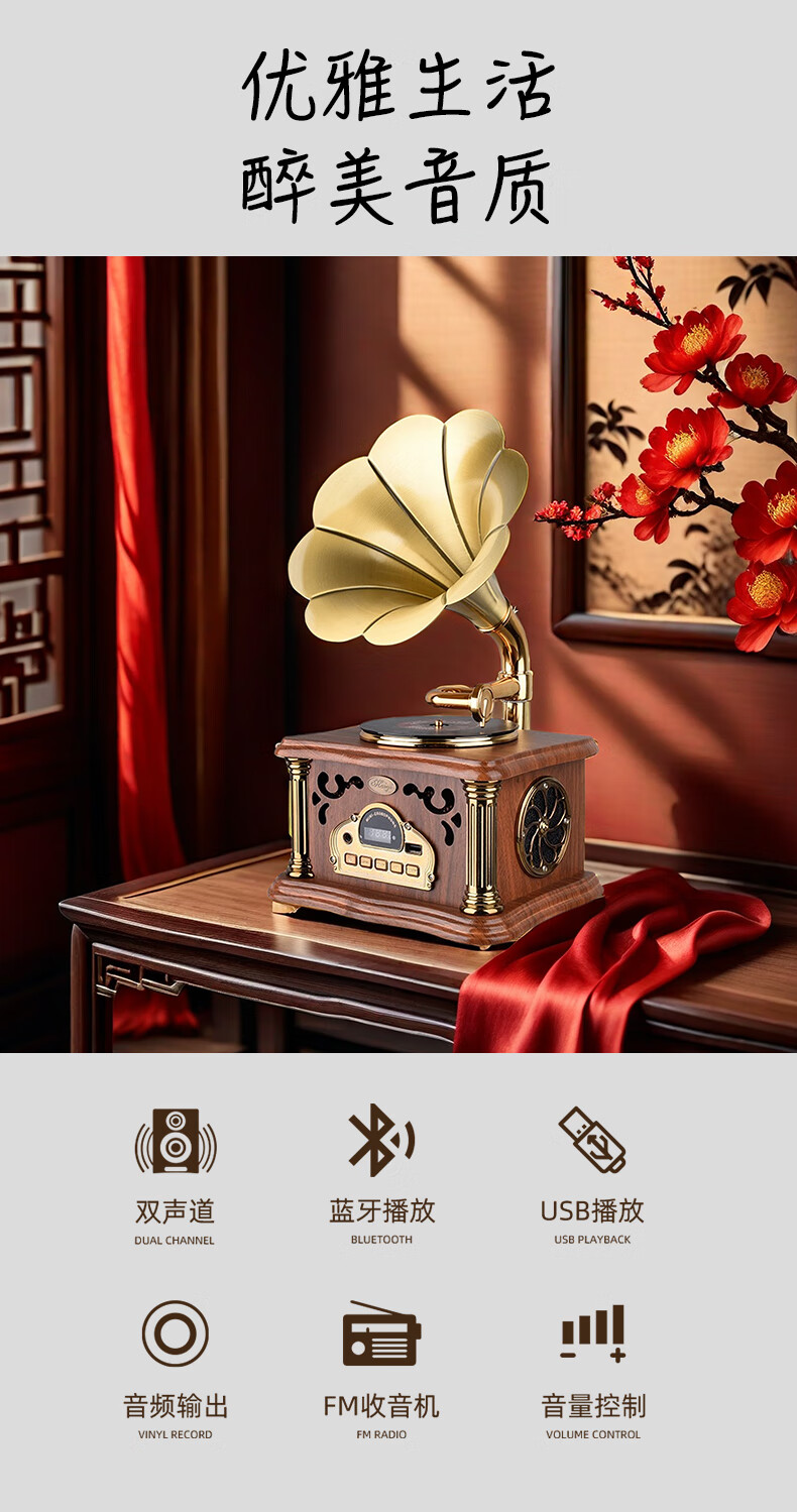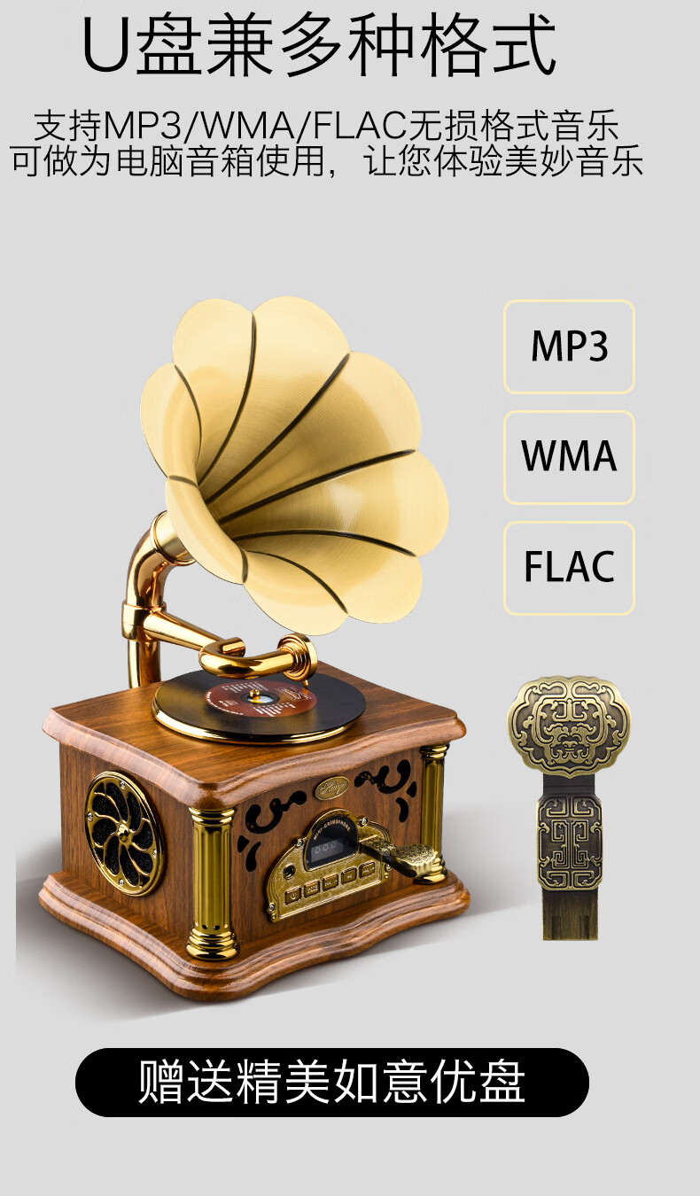 Jinmo Retro Mini Gramophone Large Speaker Bluetooth Small Audio Antique Speaker Multi-Functional Creative Gift Ornament Brown Charging Plug-in Dual-Purpose - Rotating Turntable to Send Music U Disk