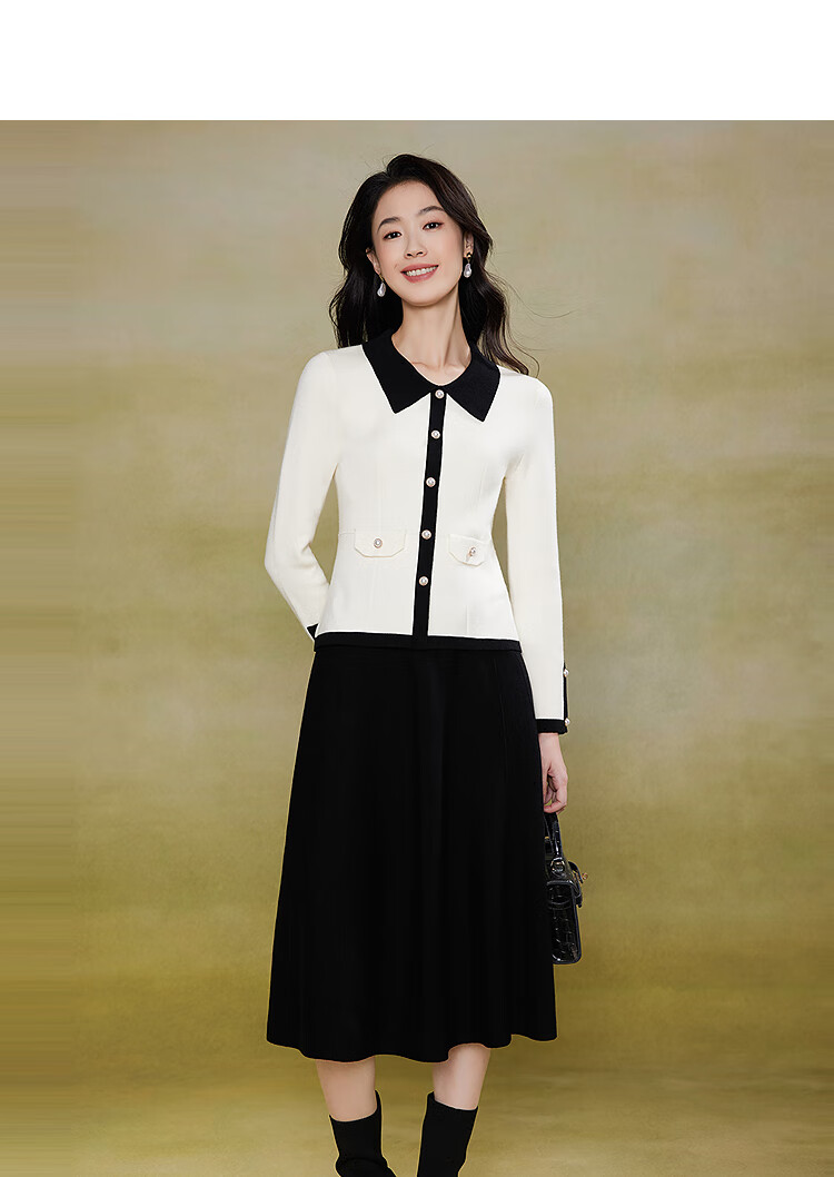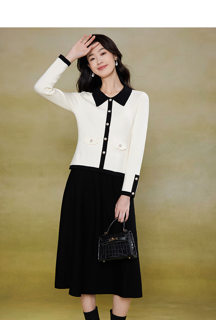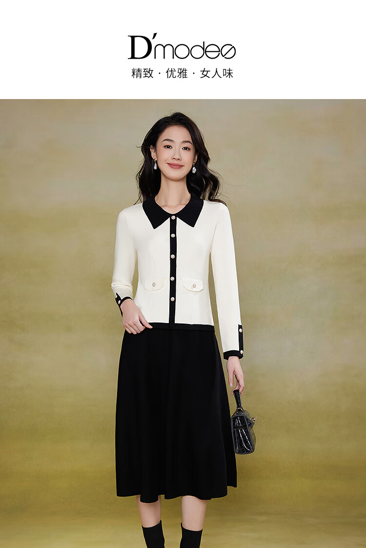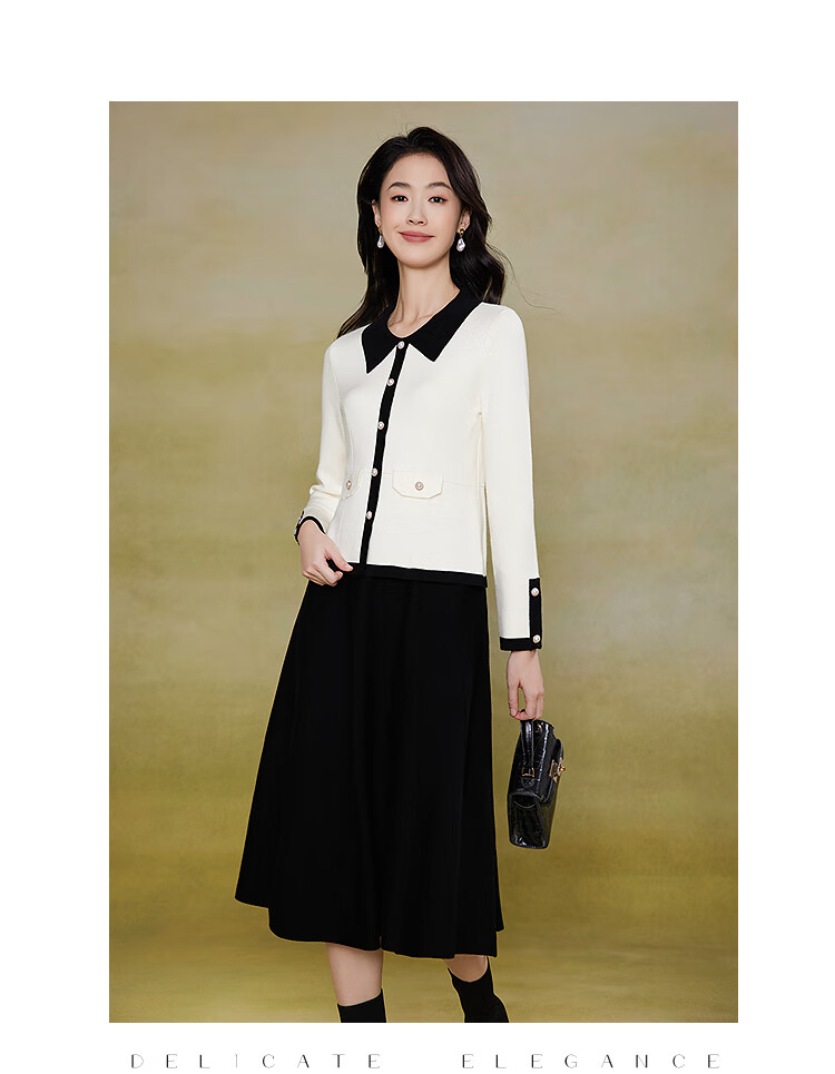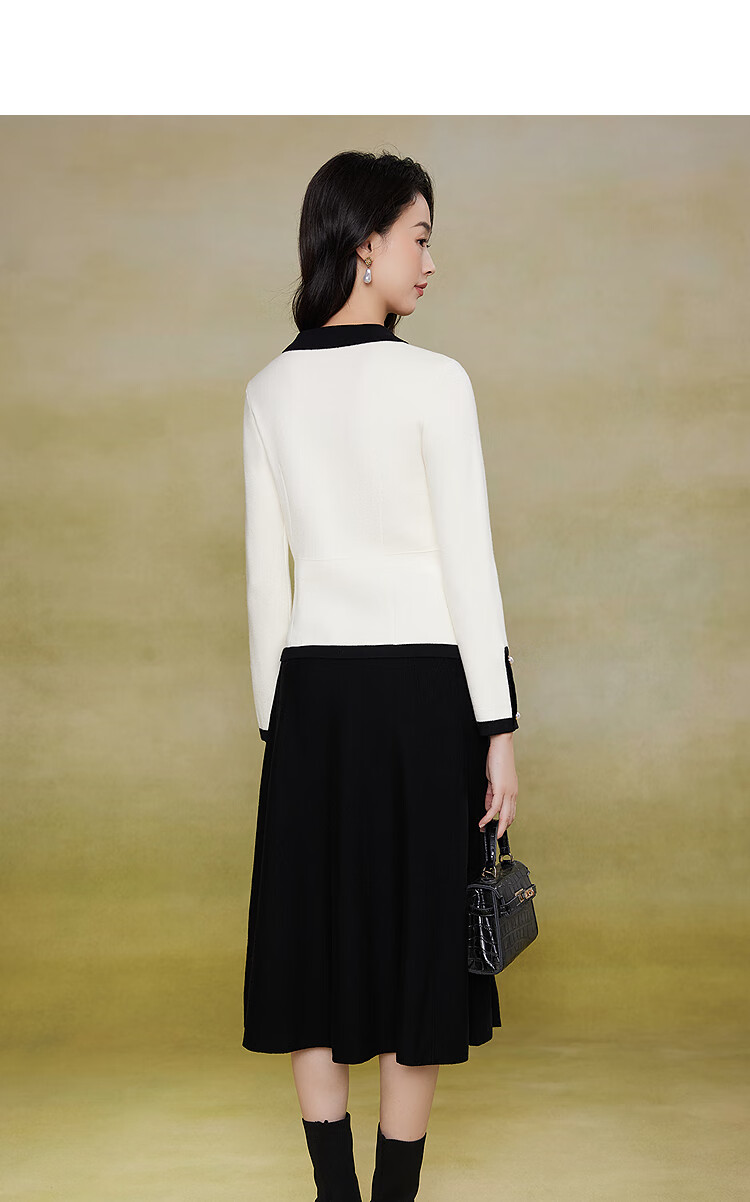 Daimax autumn new knitted suit color-blocked long-sleeved pullover sweater covering the flesh umbrella skirt two-piece set for women white XL