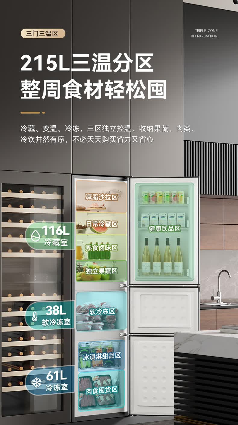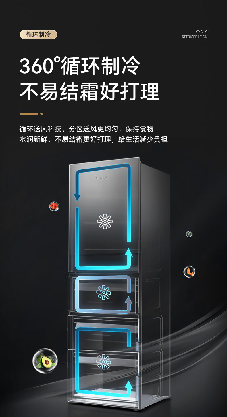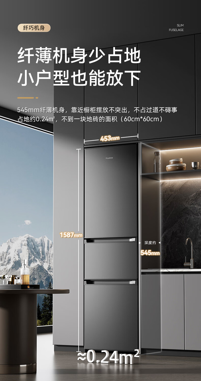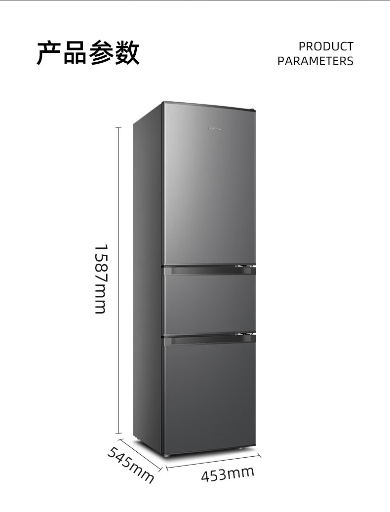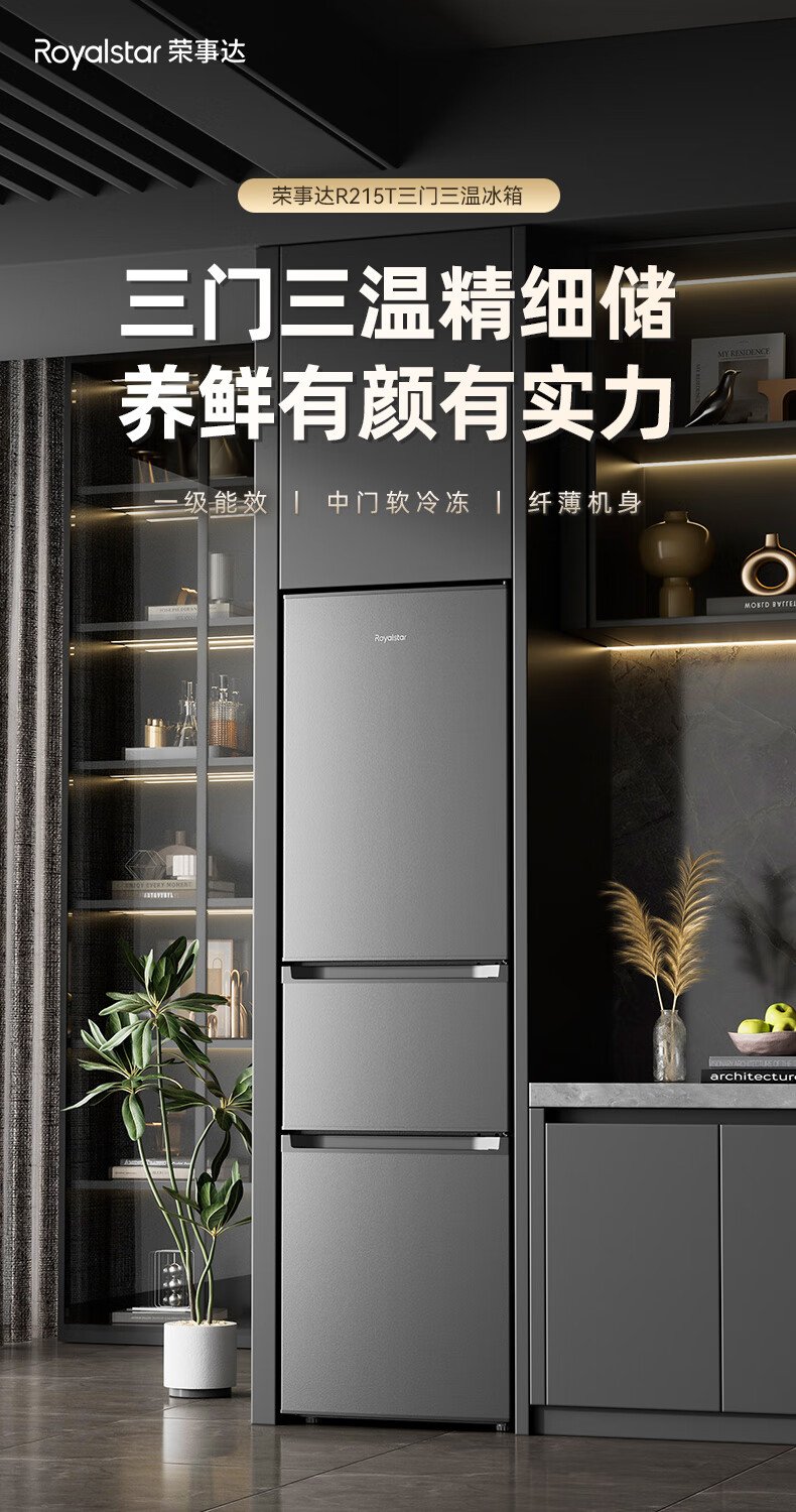 Royalstar 215 liter three-door refrigerator household large-capacity small and medium-sized three-door energy-saving low-noise rental mid-door soft freezing ultra-thin micro-frost bass preservation refrigerator trade-in 215 liters first-class energy efficiency two days of electricity titanium dark gray