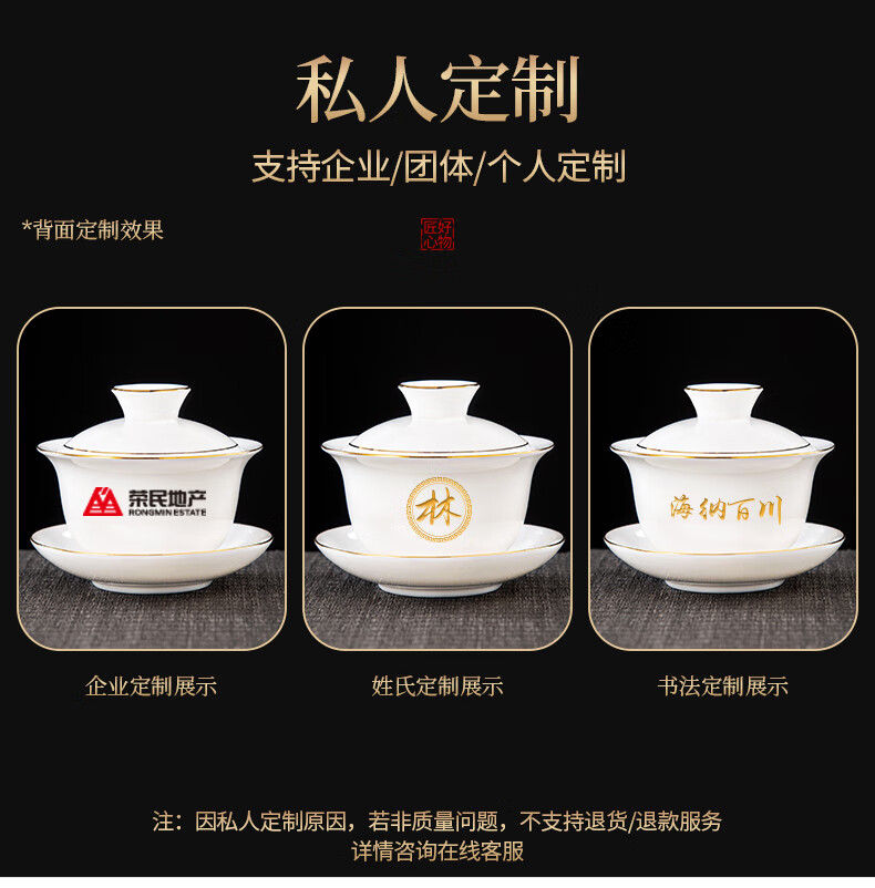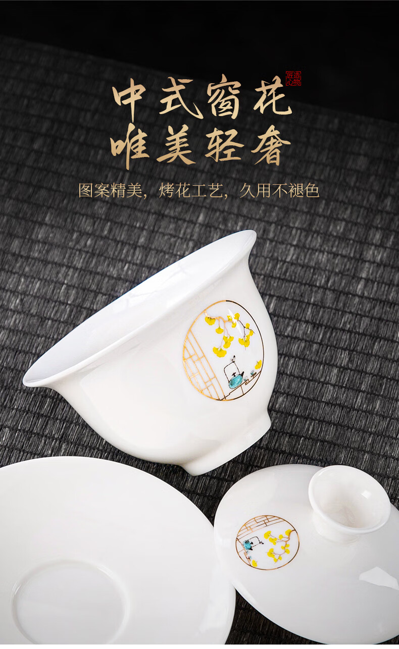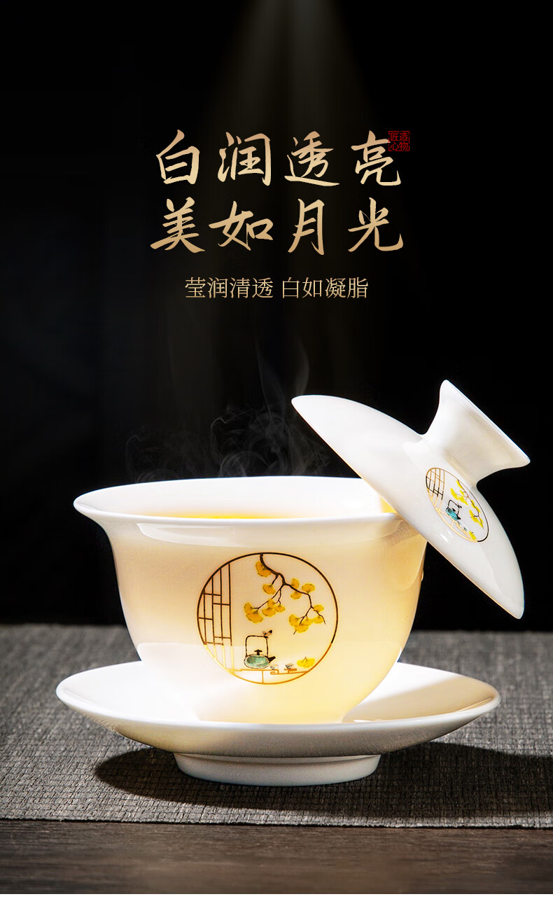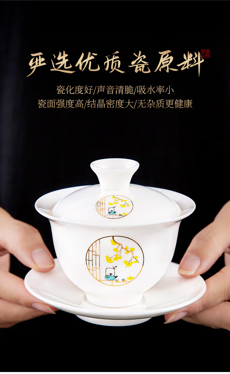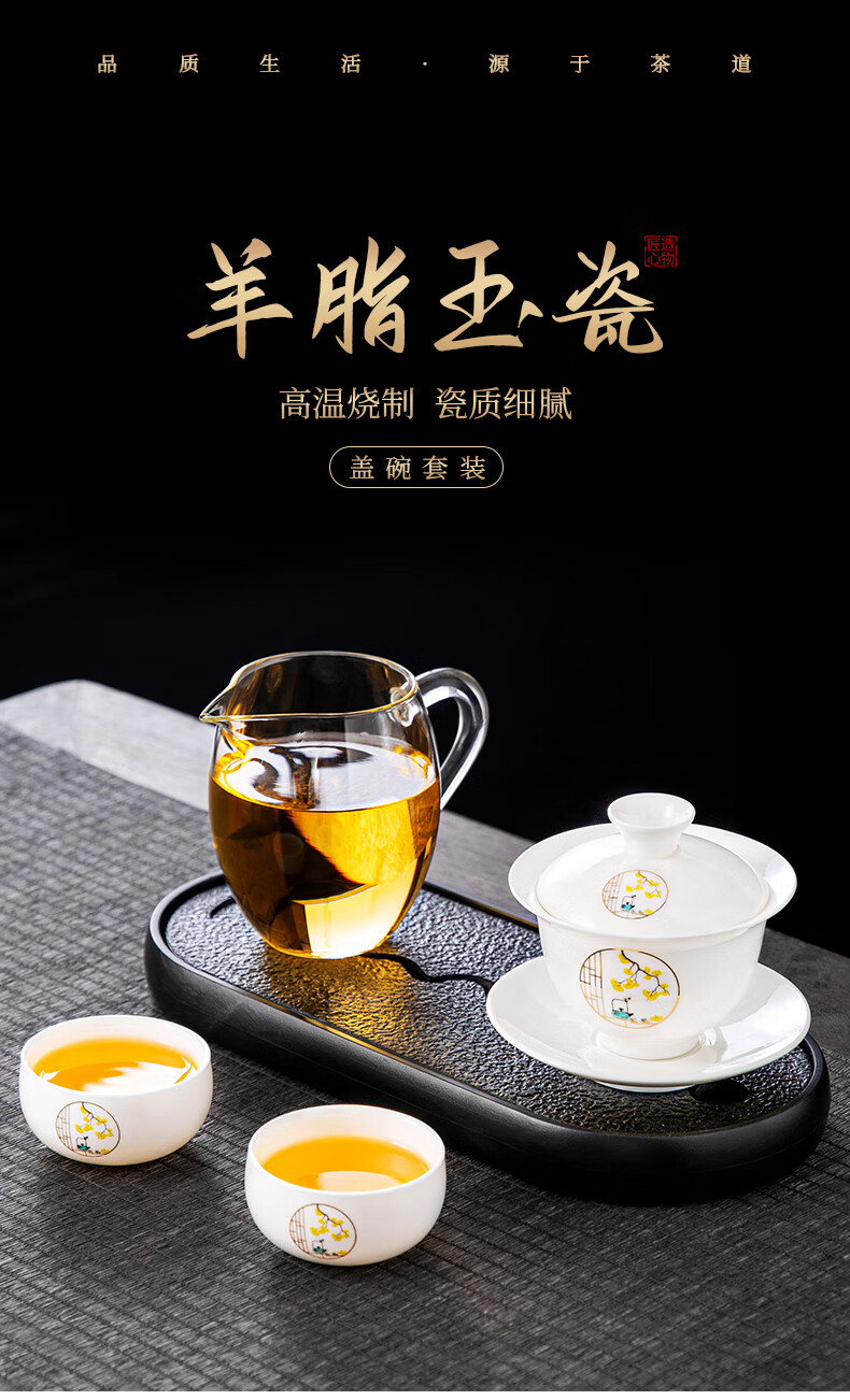 Xiangye Mutton Fat Jade Kung Fu Tea Set Sancai Covered Bowl Three-piece Set with Tea Tray Complete Set for Guests to Make Teapot and Drink Tea Cup Yunchu Pure White Covered Bowl Two-cup 4-piece Set + Gourd Tray
