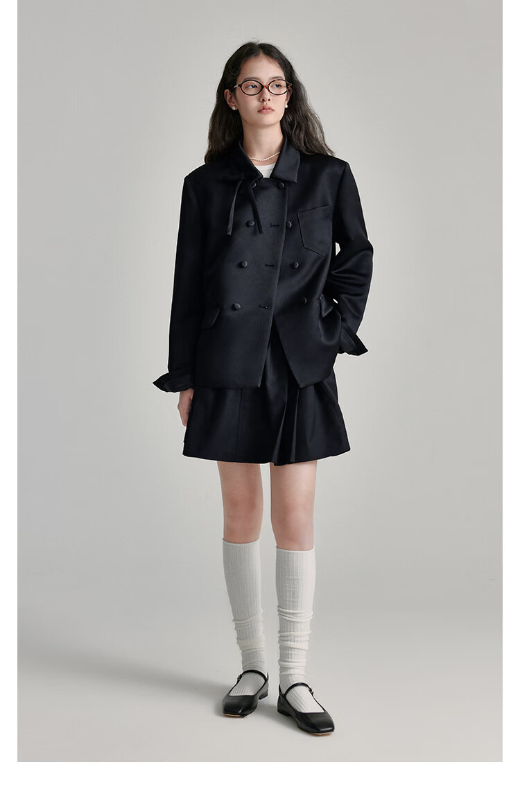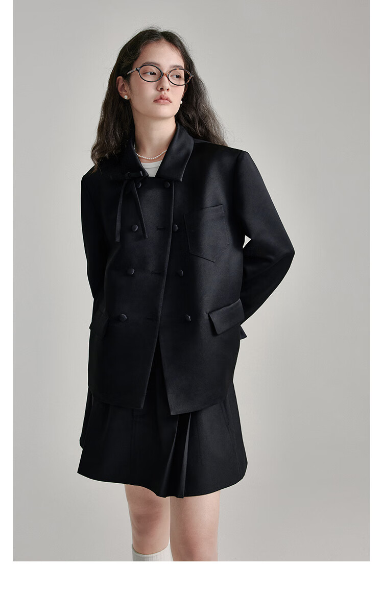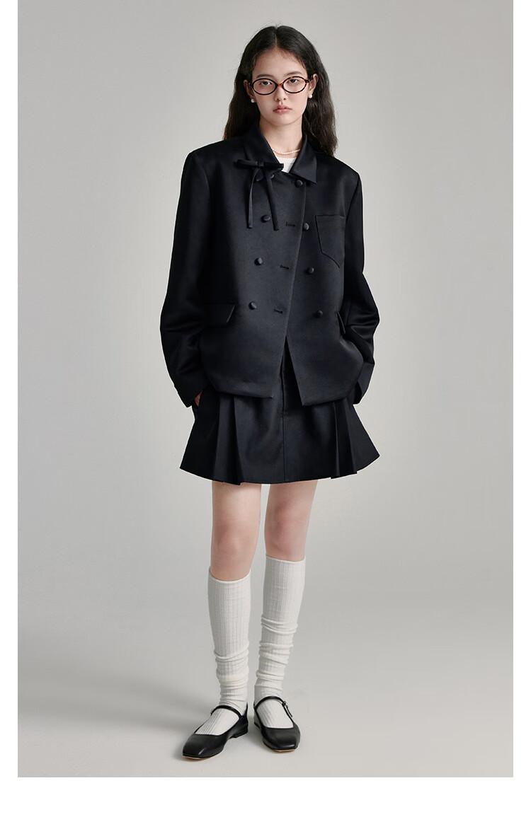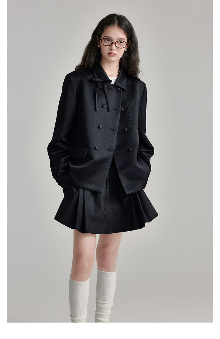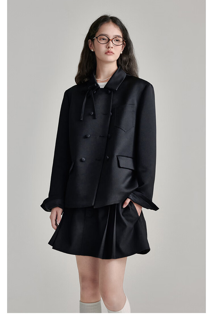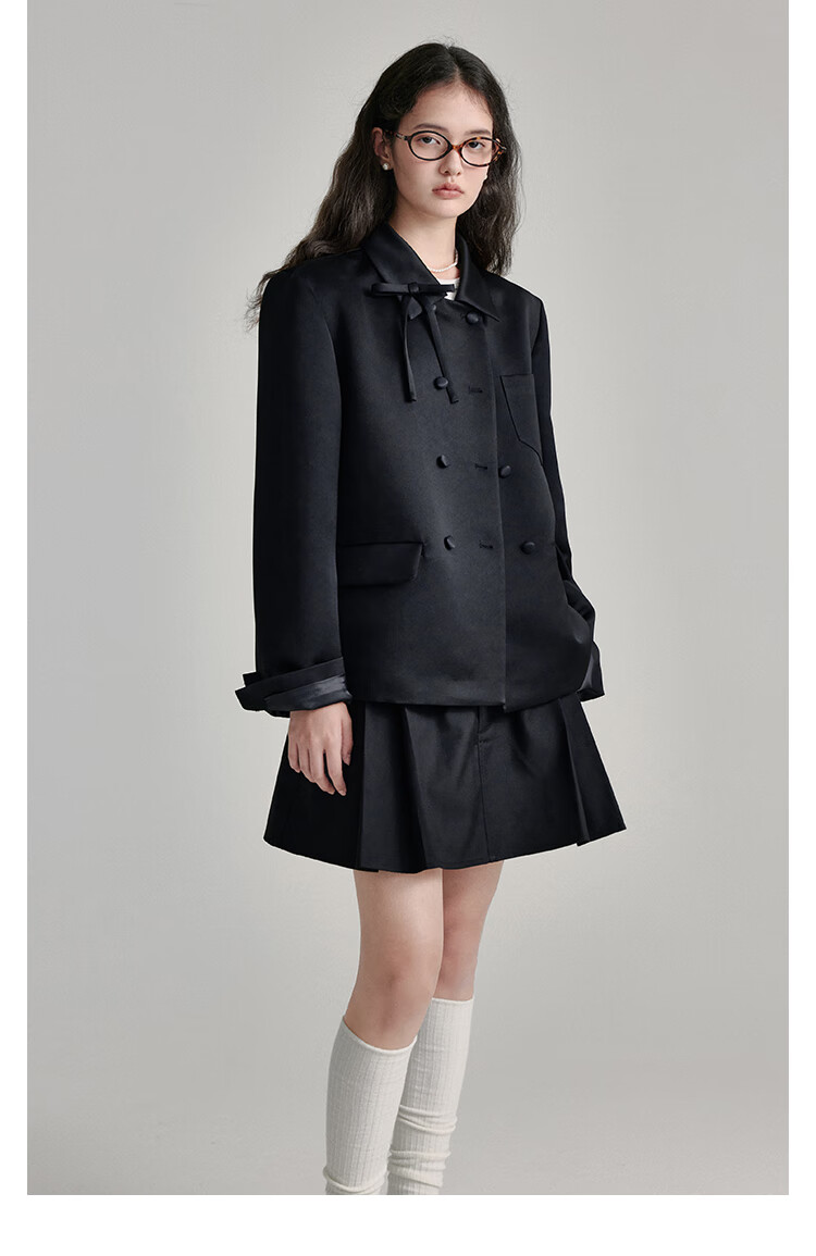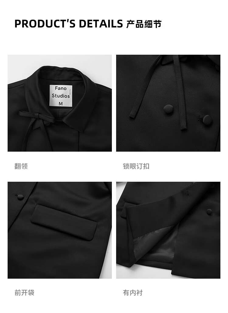 Fano studios Fan Luo French style satin bow suit 2024 spring new style noble and exquisite double-breasted short coat black S, shipped within 48 hours