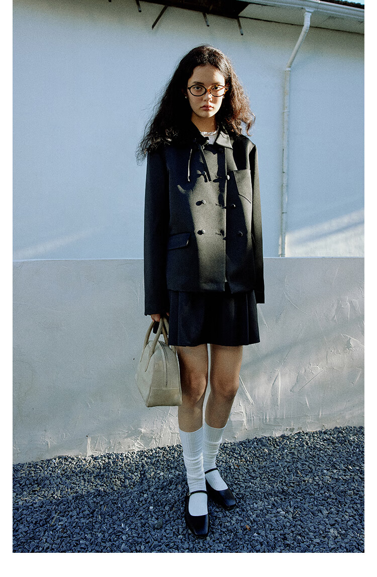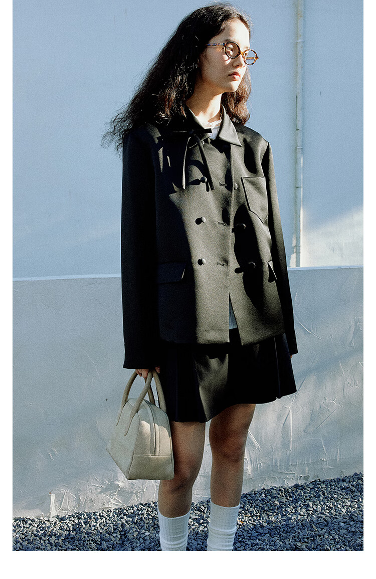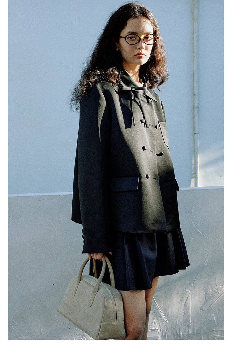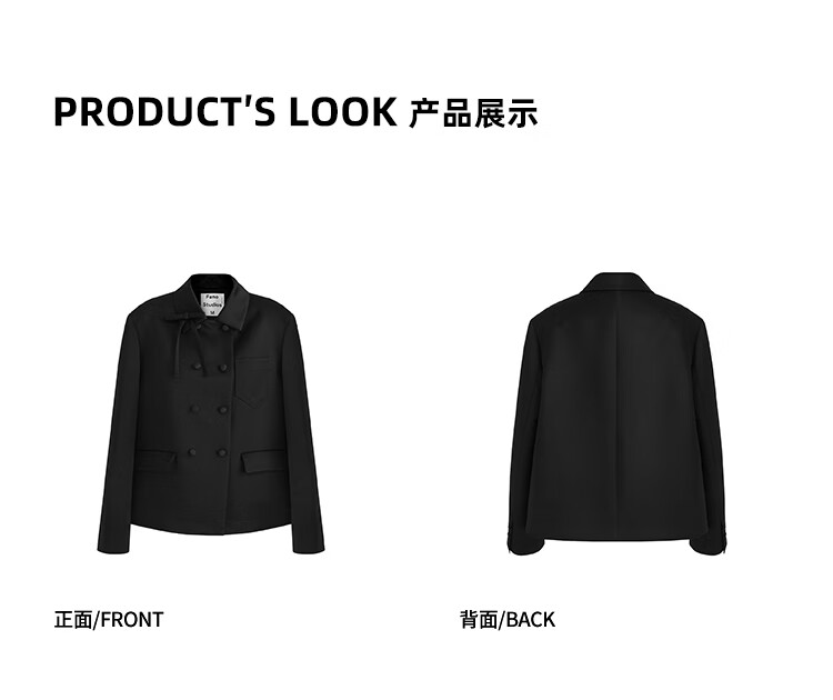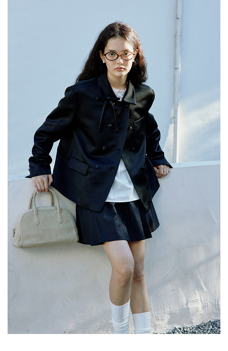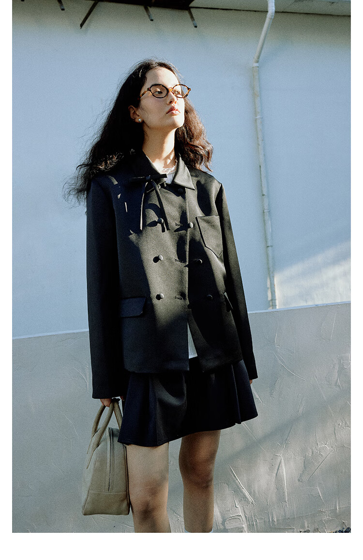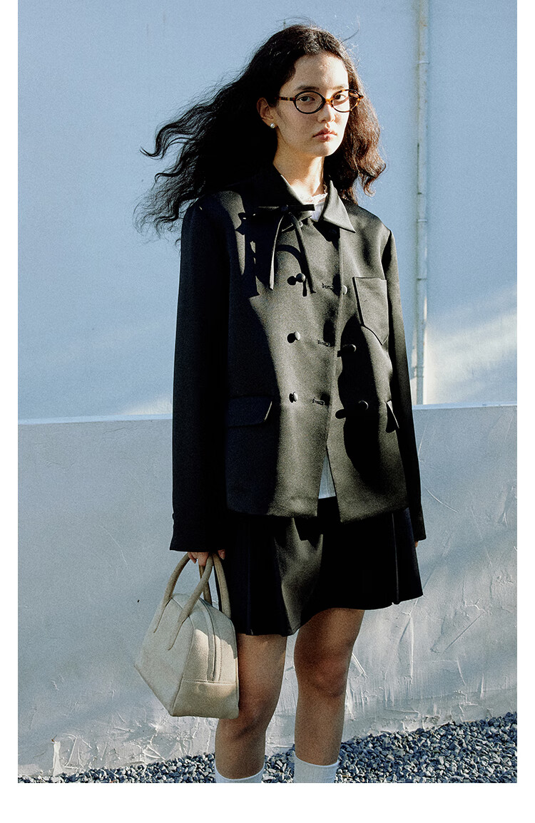Fano studios Fan Luo French style satin bow suit 2024 spring new style noble and exquisite double-breasted short coat black S, shipped within 48 hours