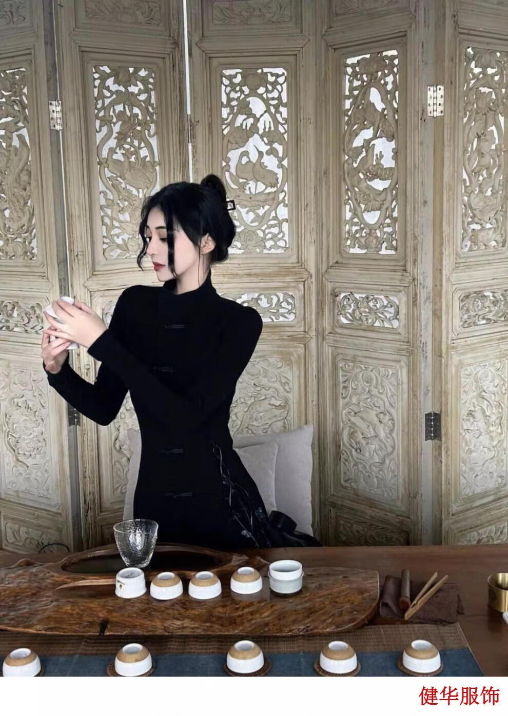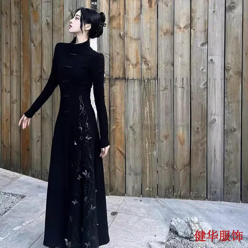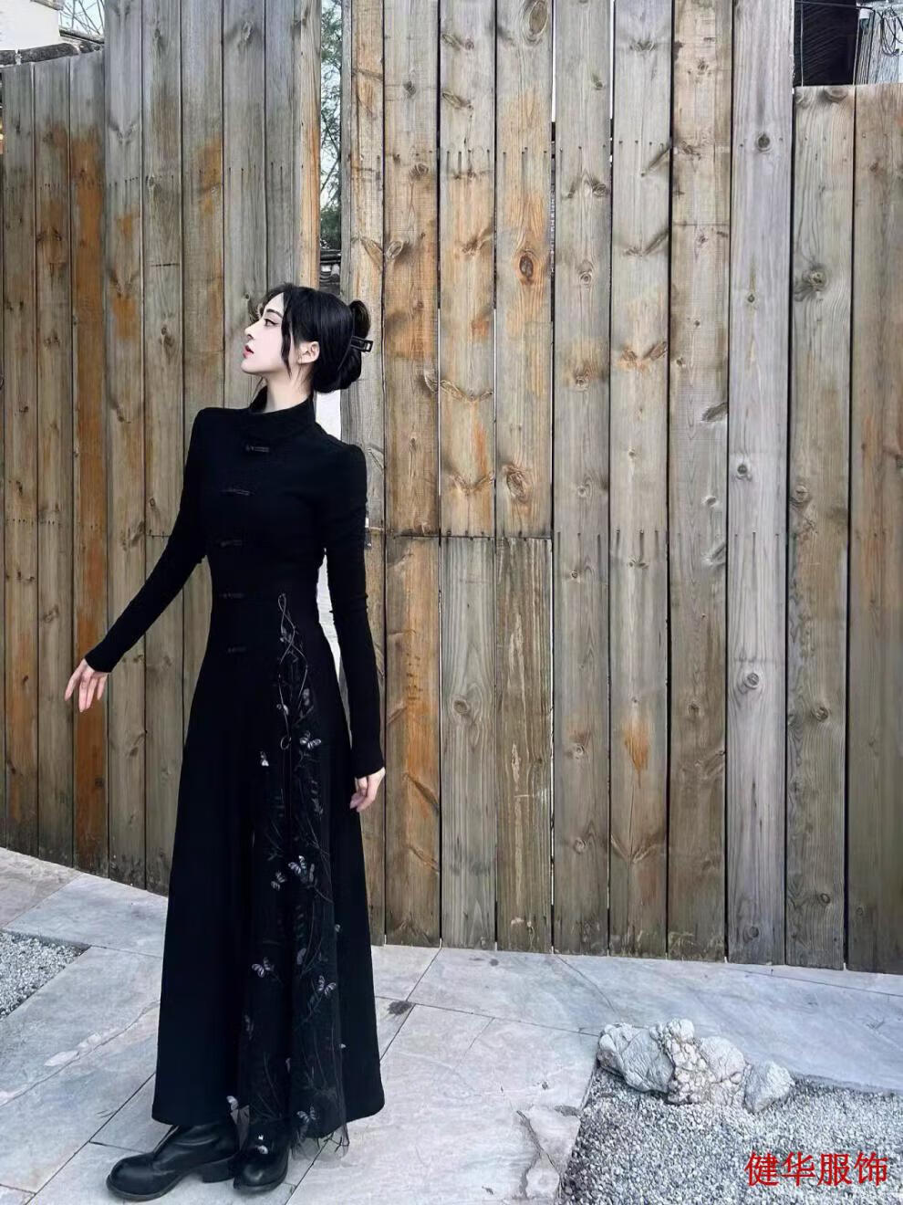 Yinchu early autumn new Chinese style women's clothing, chic and unique national style cheongsam, Buddhist Zen tea dress, autumn and winter style, black-cheongsam S 160