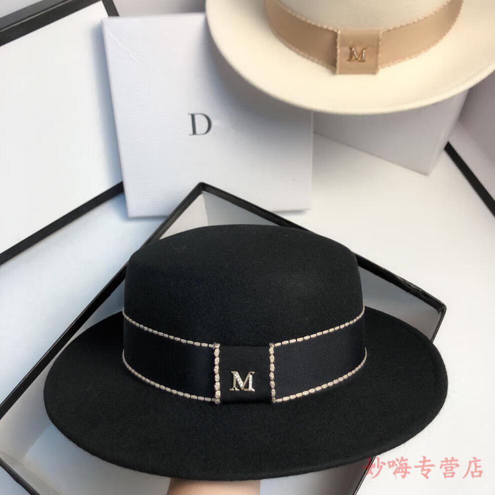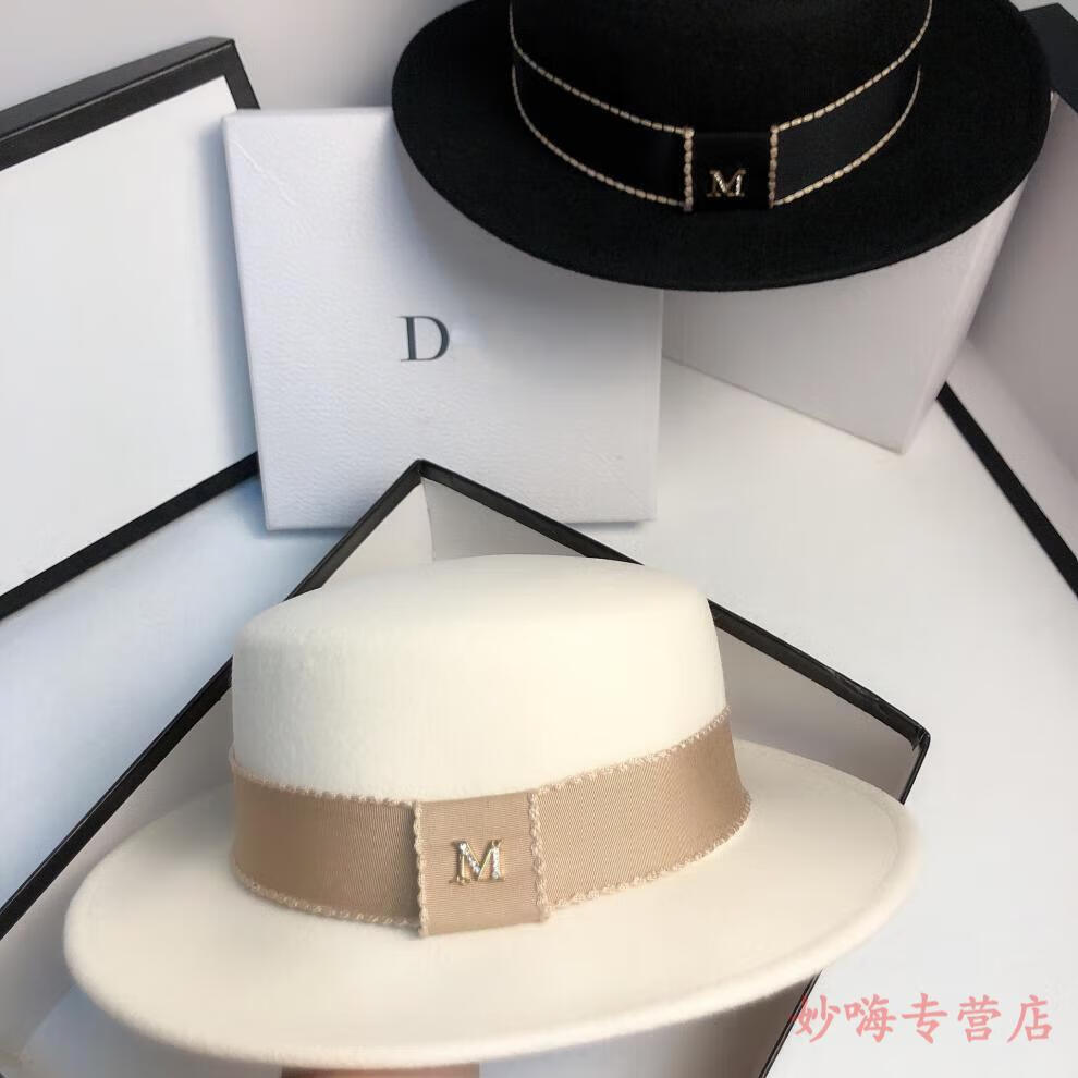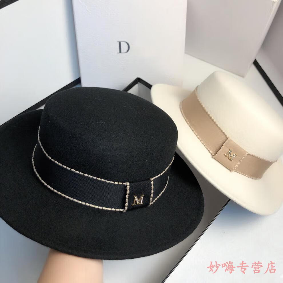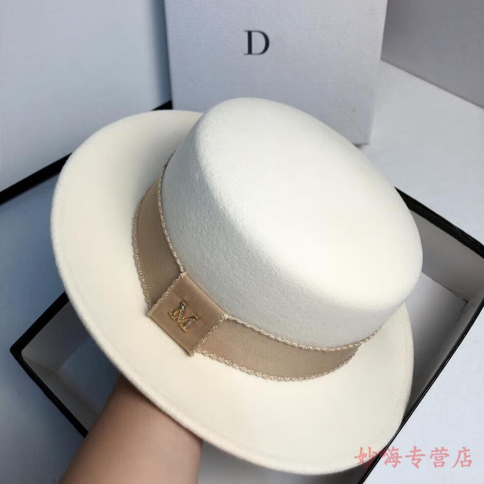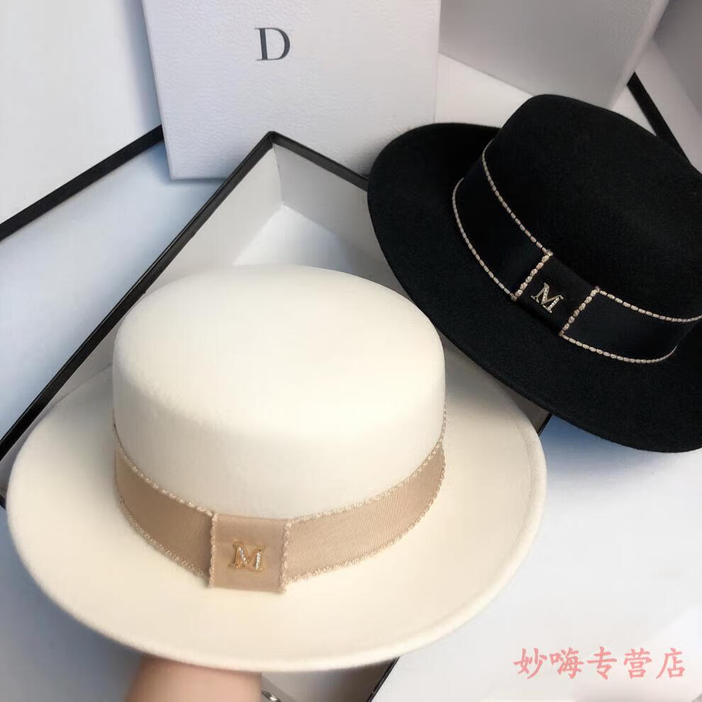 NY-NYM autumn and winter woolen French socialite white flat top hat female British retro fashion Hepburn hat black adjustable