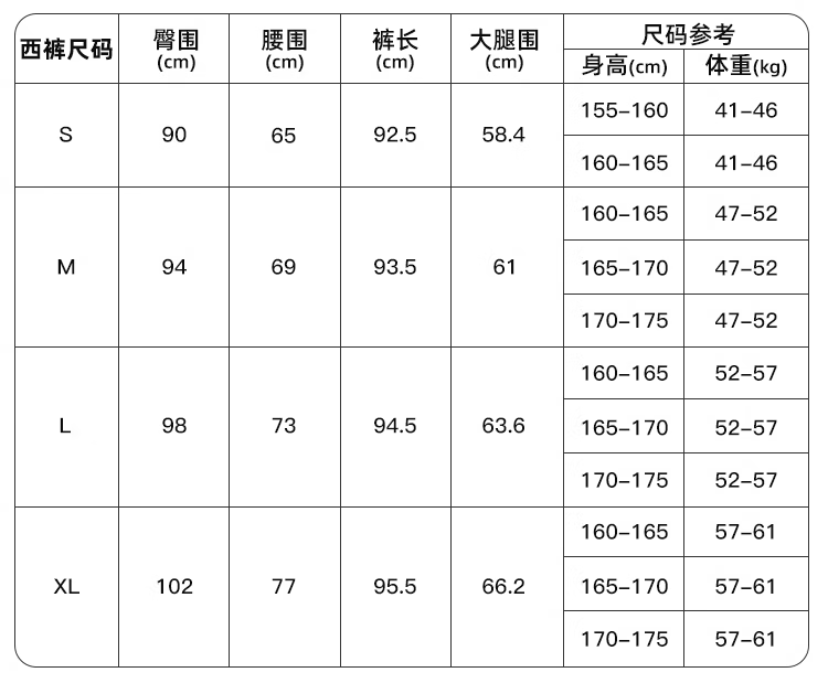 Outseam (cm) 99 cm 101.5 cm 104 cm 106.5 cm 109 cm