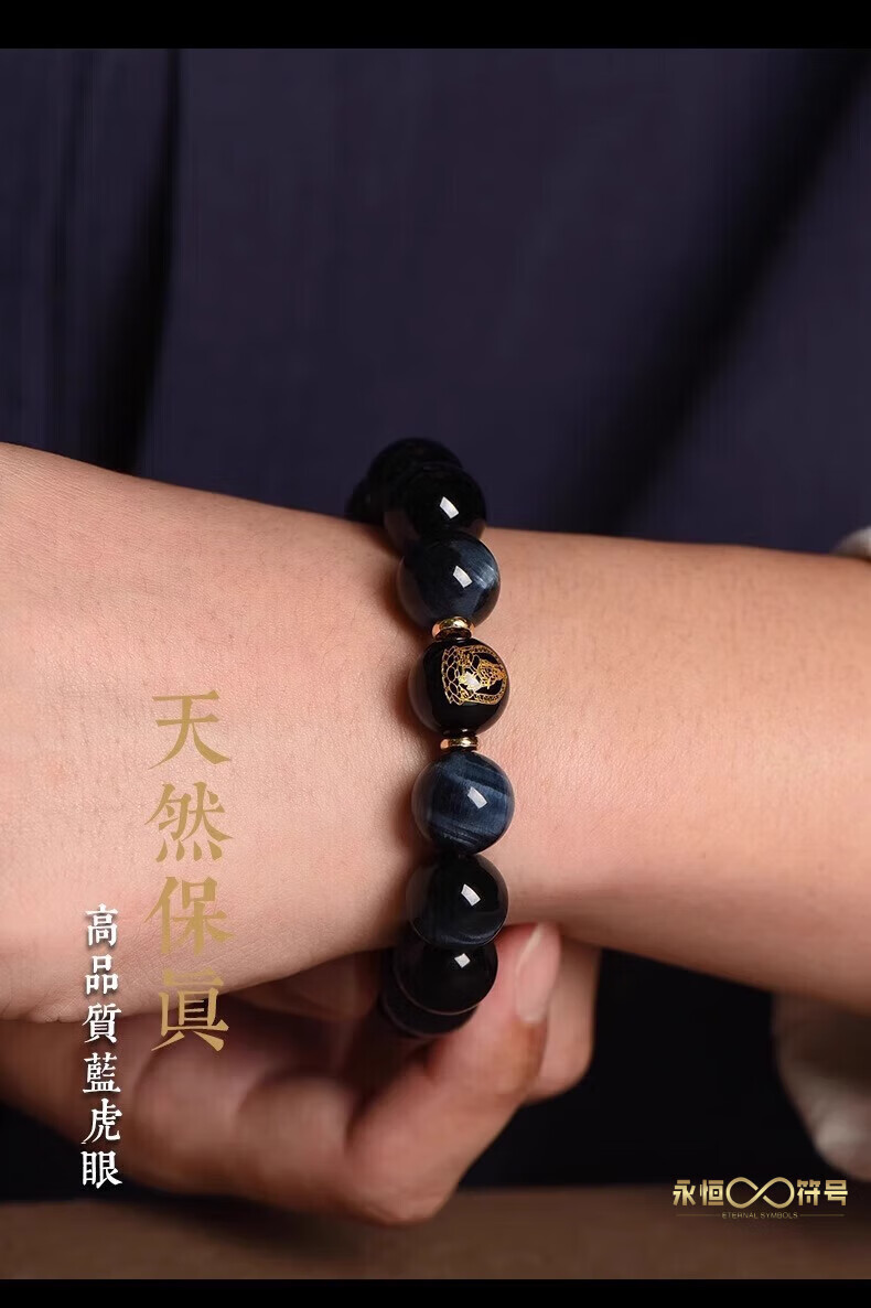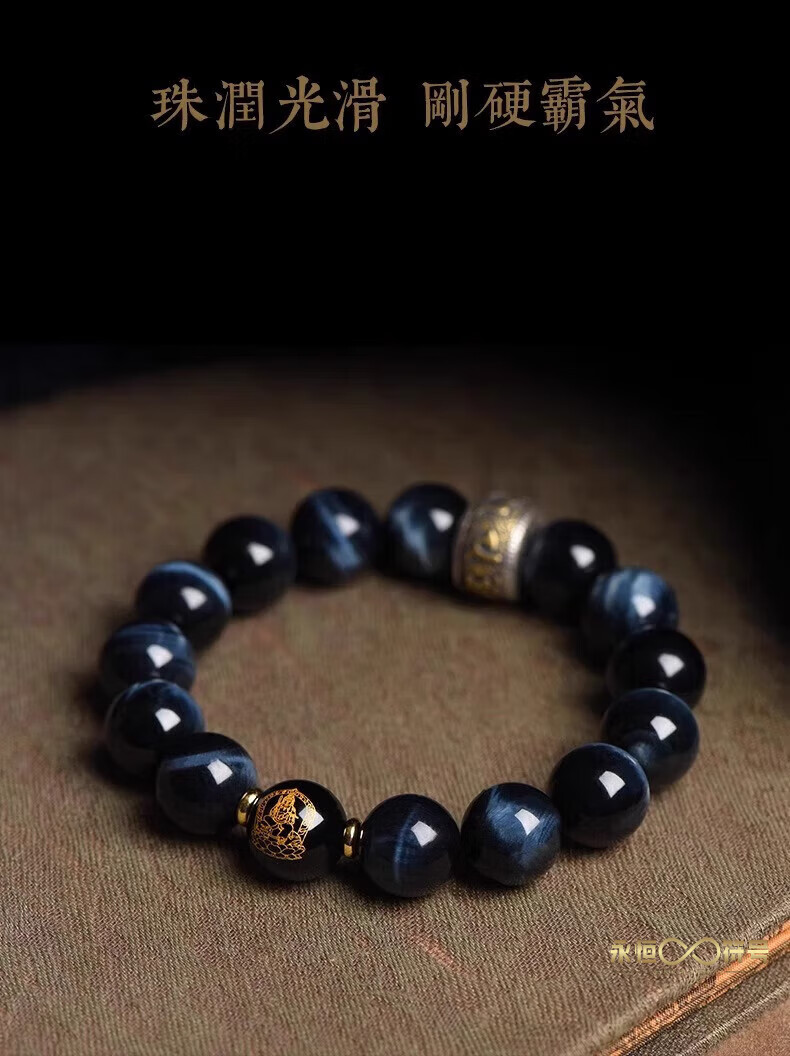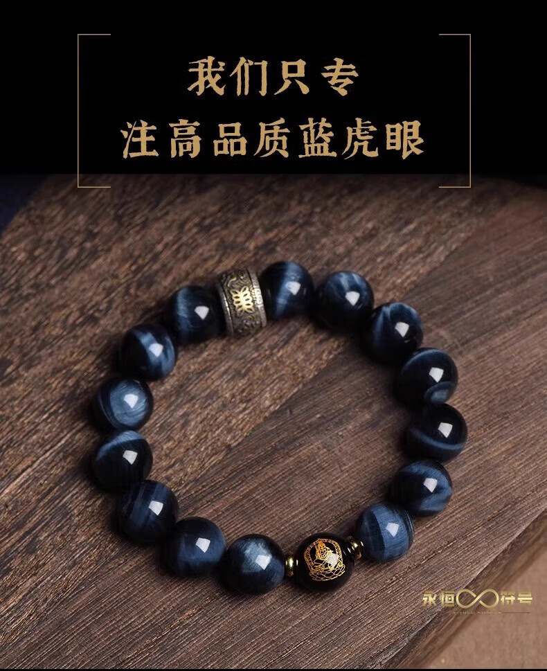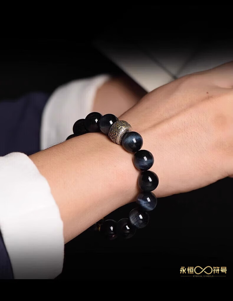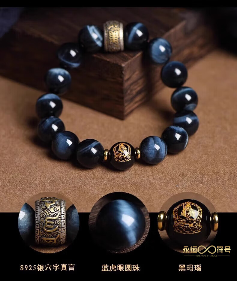 Eternal symbol blue tiger eye obsidian bracelet for men's birth year, Buddha bead stone six-character mantra bracelet for girls' birthday, Ami-zodiac, dog, pig 14mm