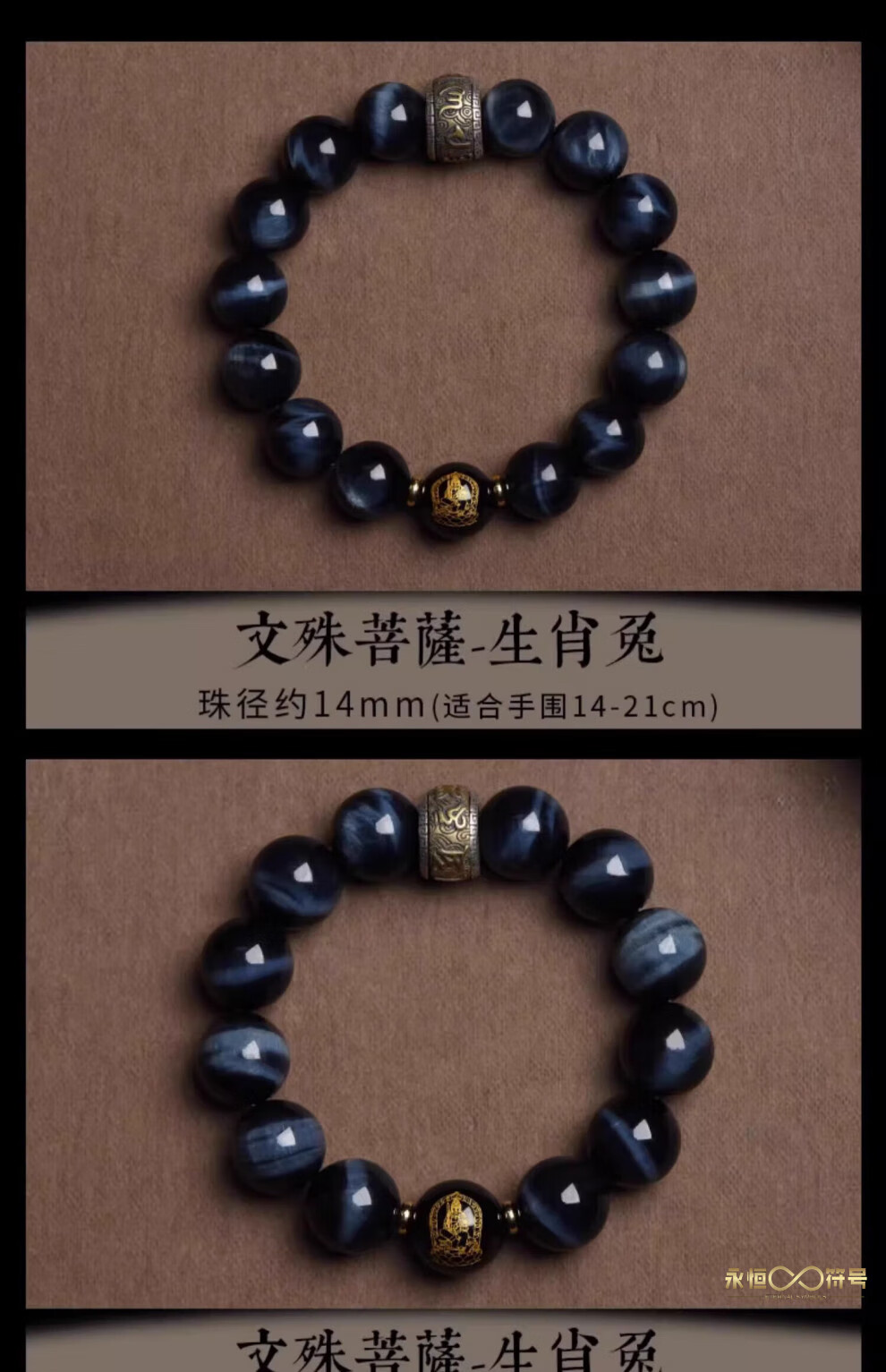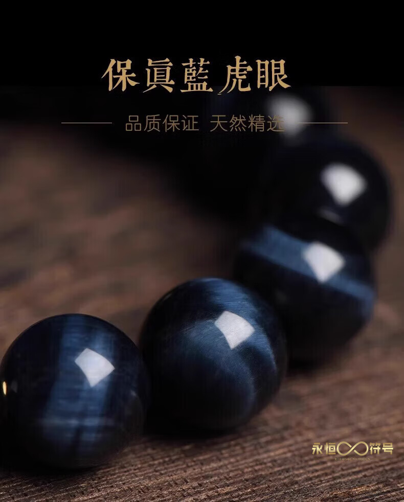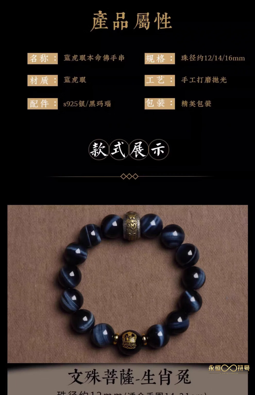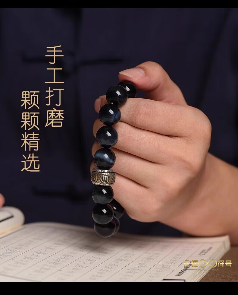 Eternal symbol blue tiger eye obsidian bracelet for men's birth year, Buddha bead stone six-character mantra bracelet for girls' birthday, Ami-zodiac, dog, pig 14mm
