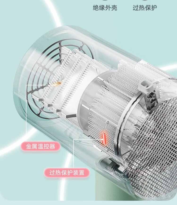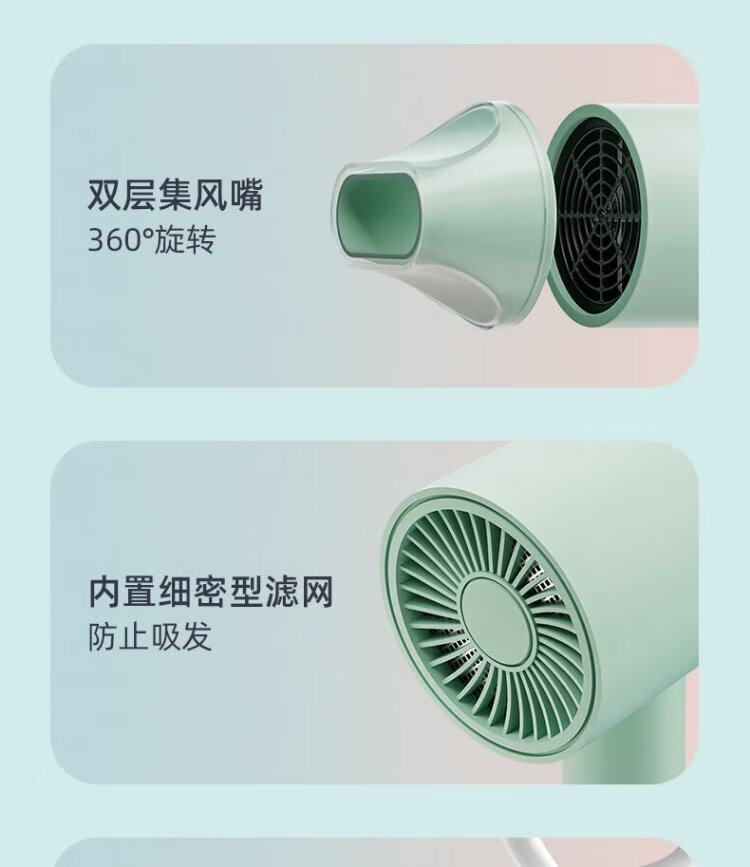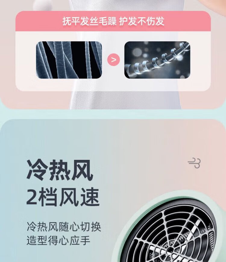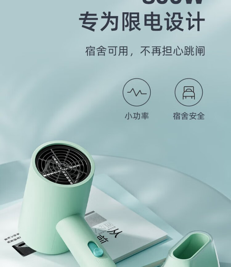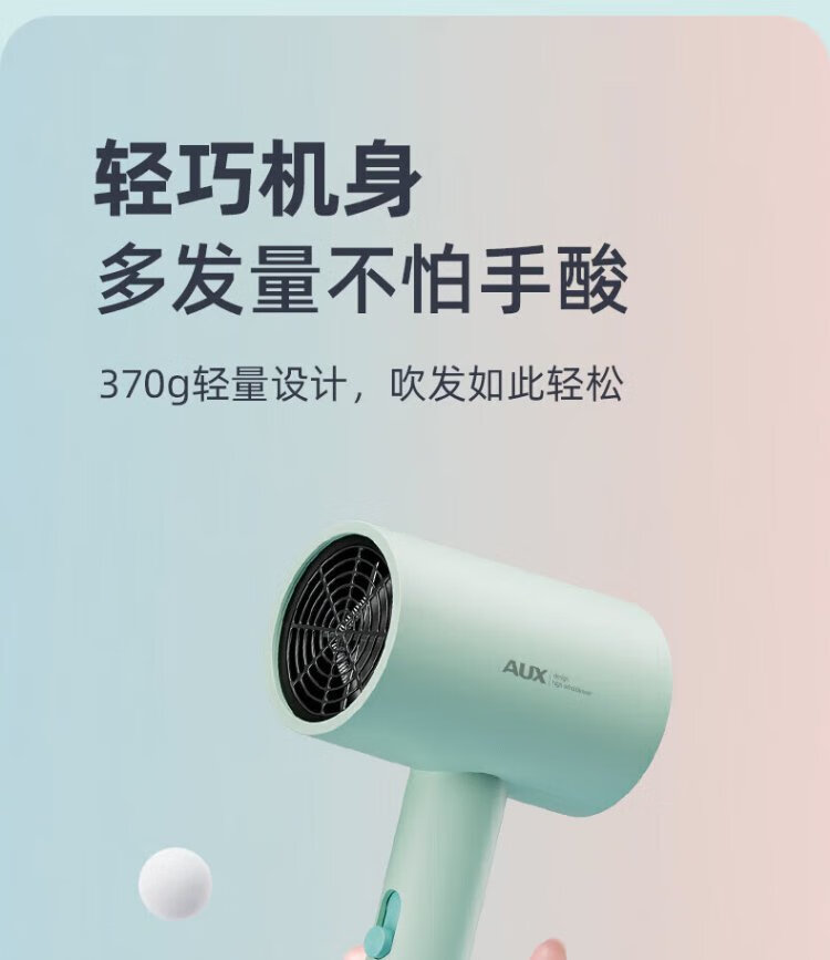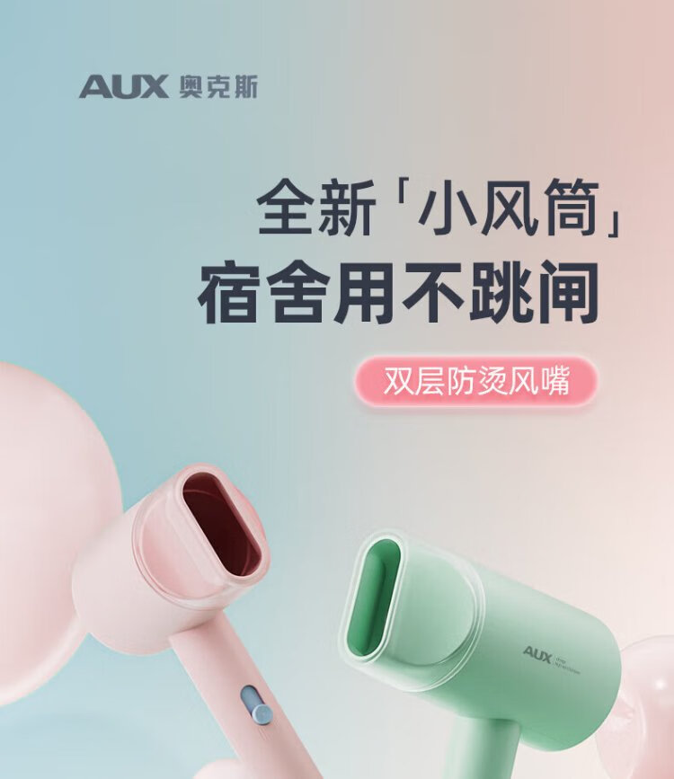 AUX hair dryer for students in dormitories, low power 800W quick-drying household hair dryer, negative ion hair care, does not hurt the power generation, portable hair dryer AH7008 green green blue light negative ion + three-speed temperature control 800W for dormitories