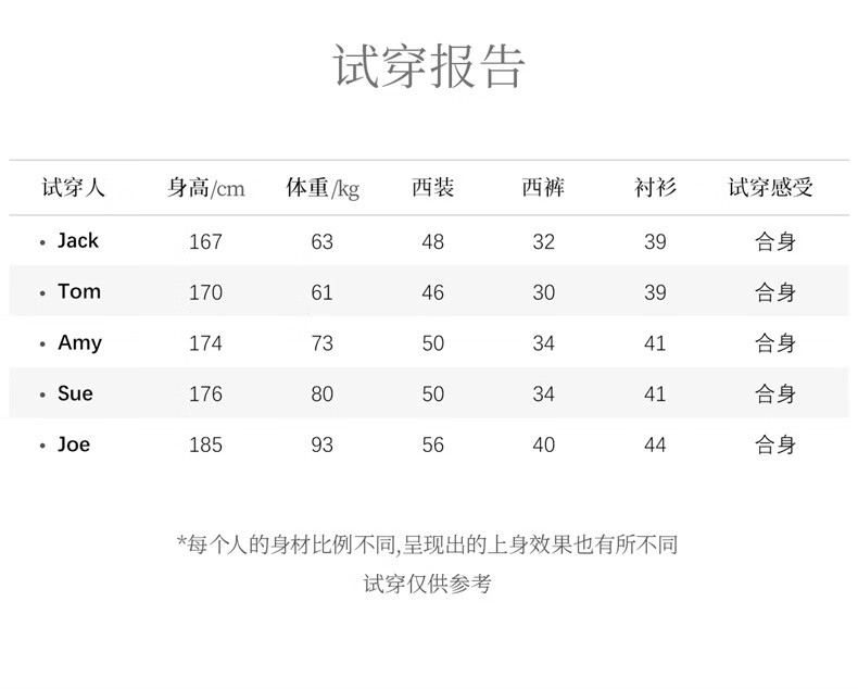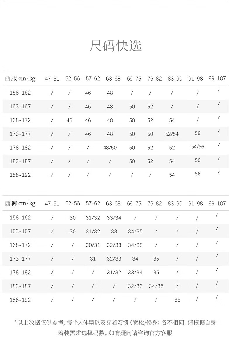China (cm) 160-165/84-86 165-170 / 88-90 167-172 / 92-96 168-173 / 98-102 170-176 / 106-110