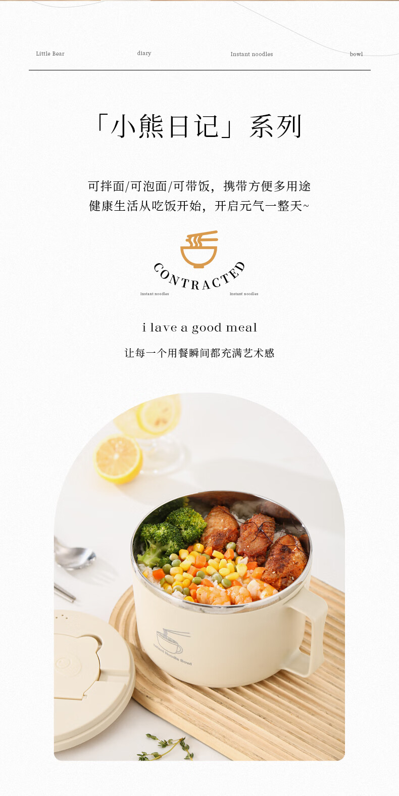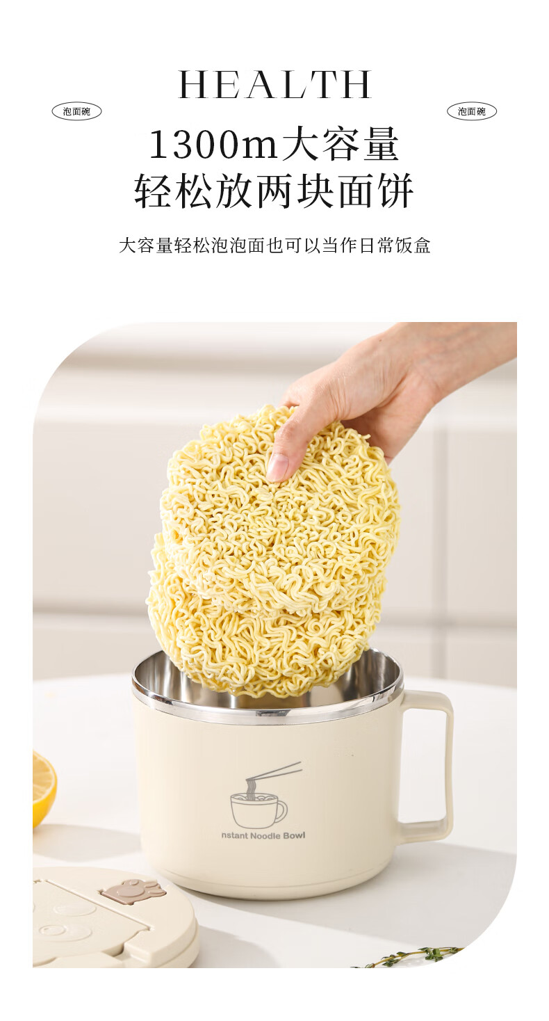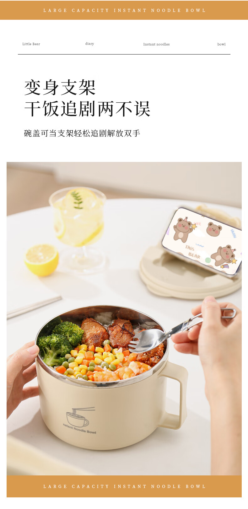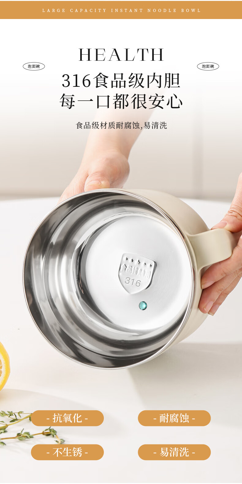 ABDT instant noodle bowl for dormitory students with lid Japanese-style 316 stainless steel thermal insulation large capacity canteen instant noodle artifact milky white food grade 304 1600ML+ tableware