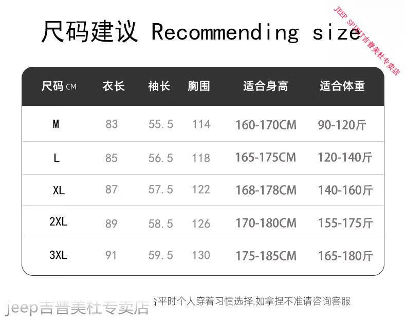 China (cm) 165 / 88-90 170 / 96-98 175 / 108-110 180 / 118-122 185 / 126-130
