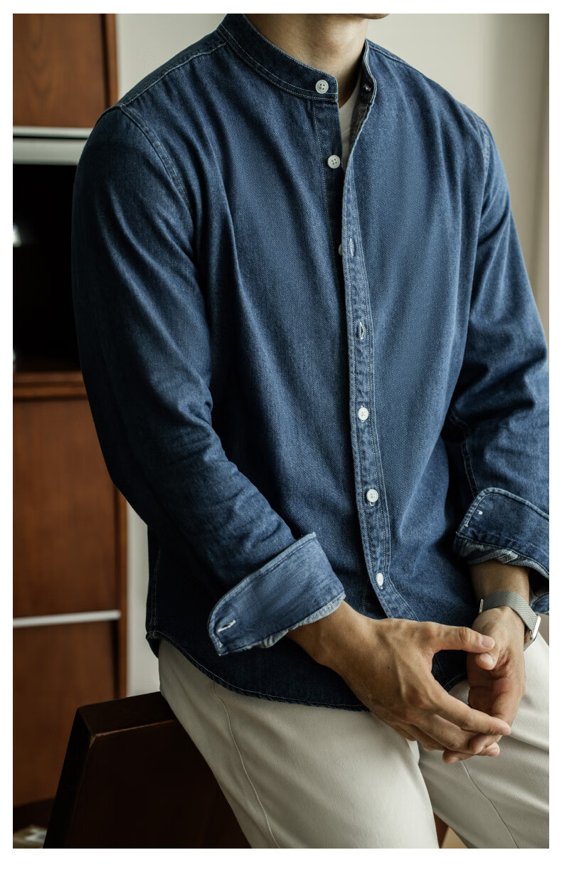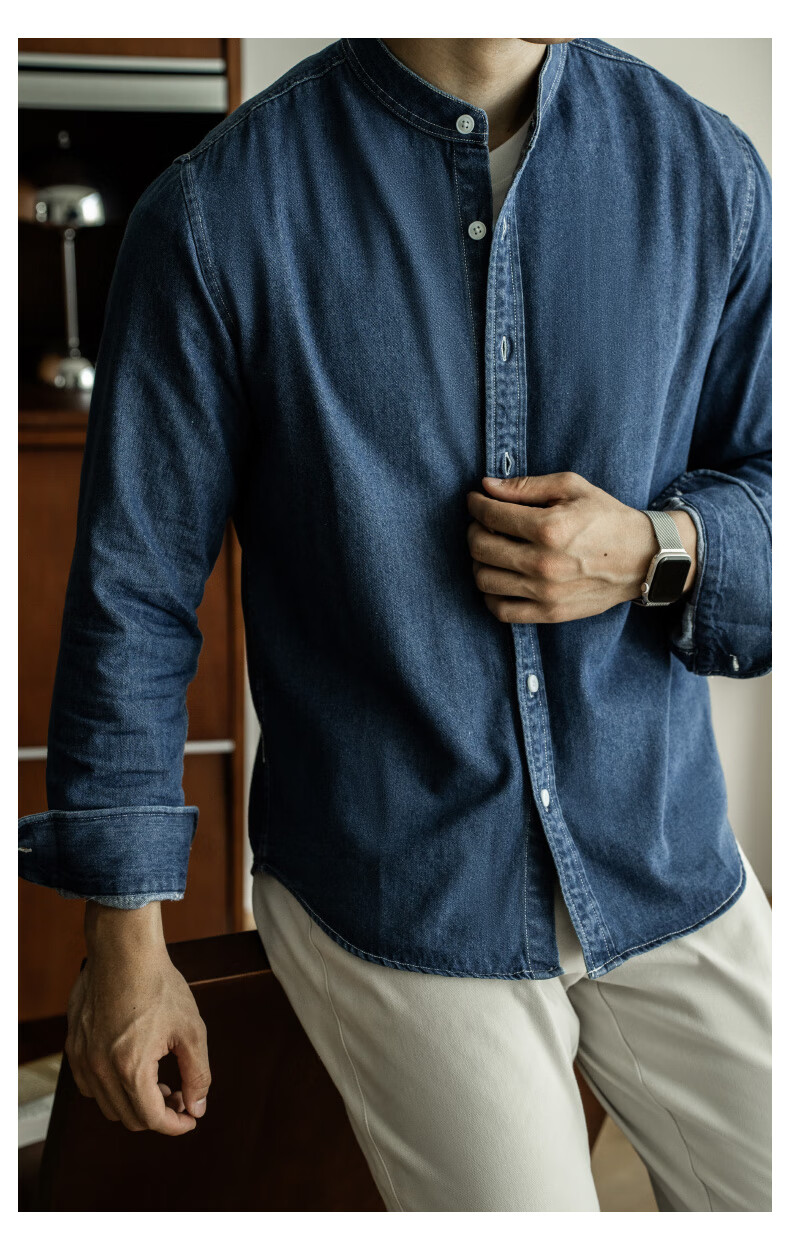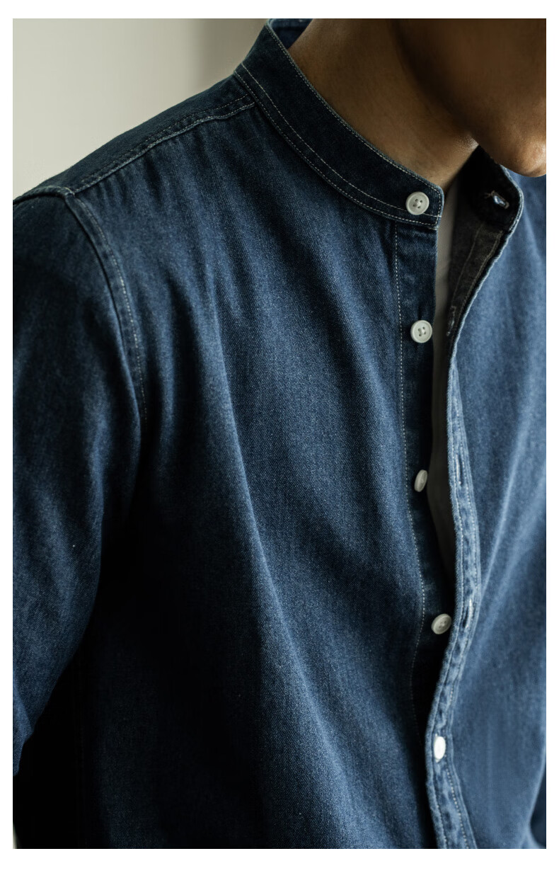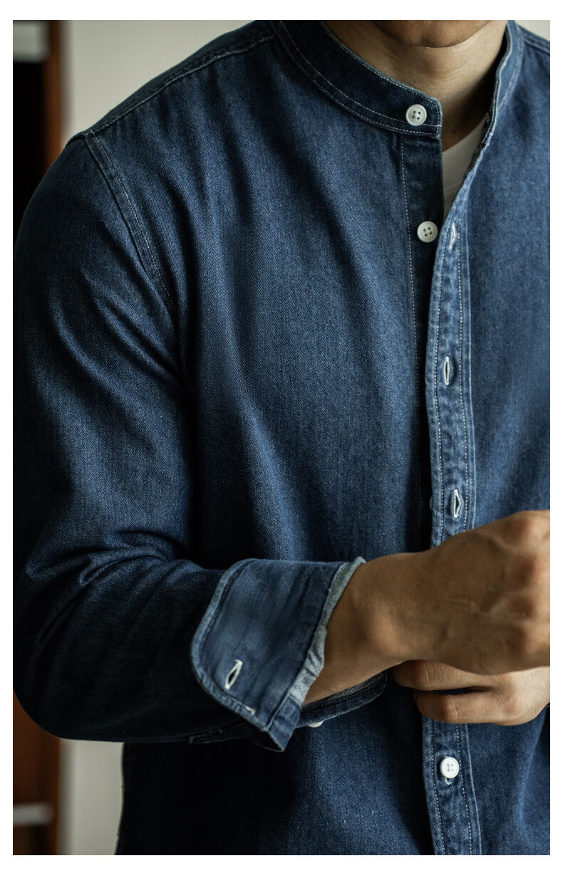 UBV American Retro Henry Collar Denim Shirt Men's 2024 Autumn New Casual Commuting Casual Jacket Shirt Blue XL