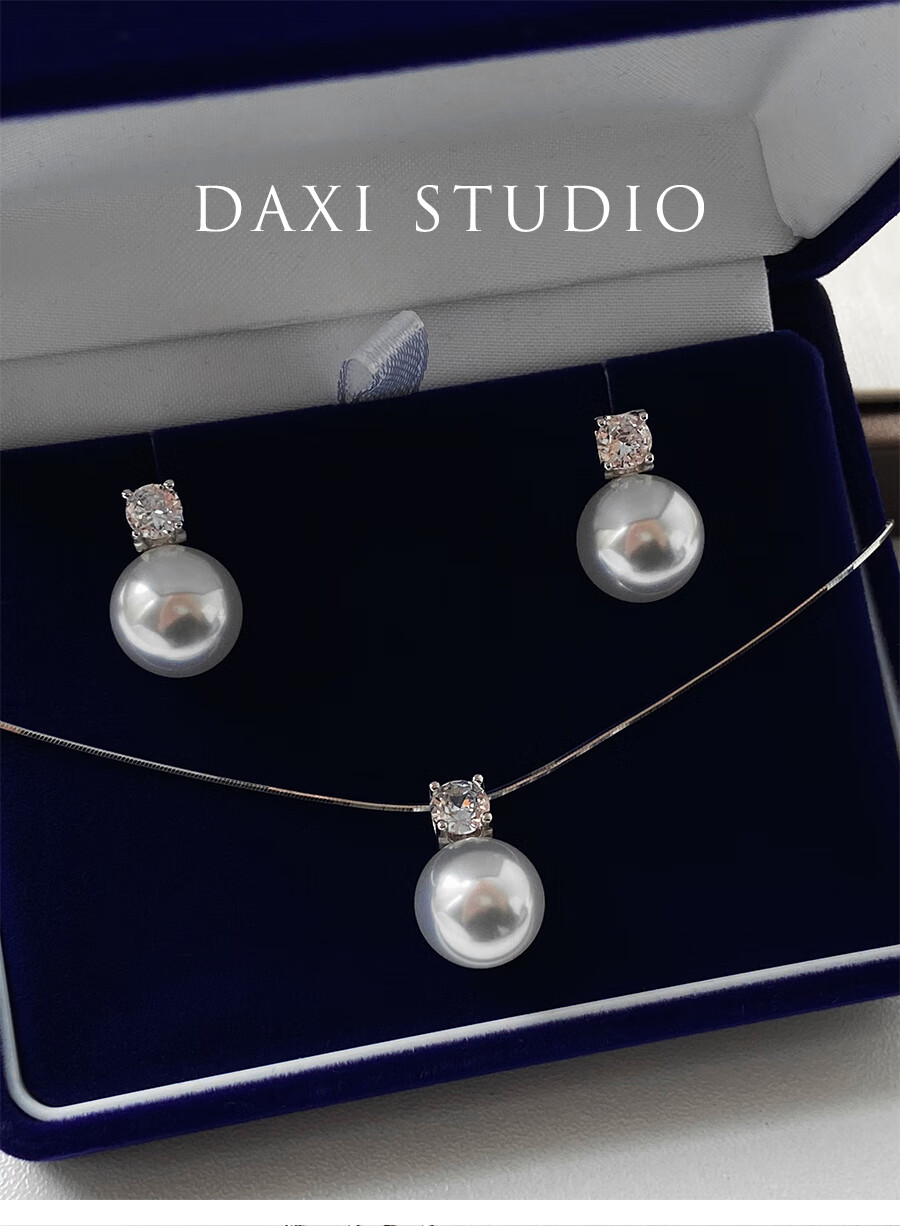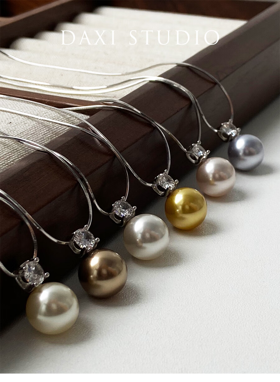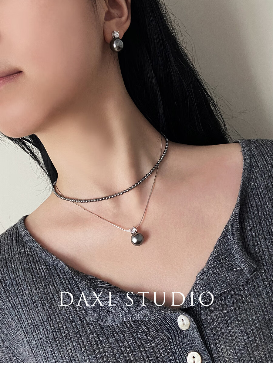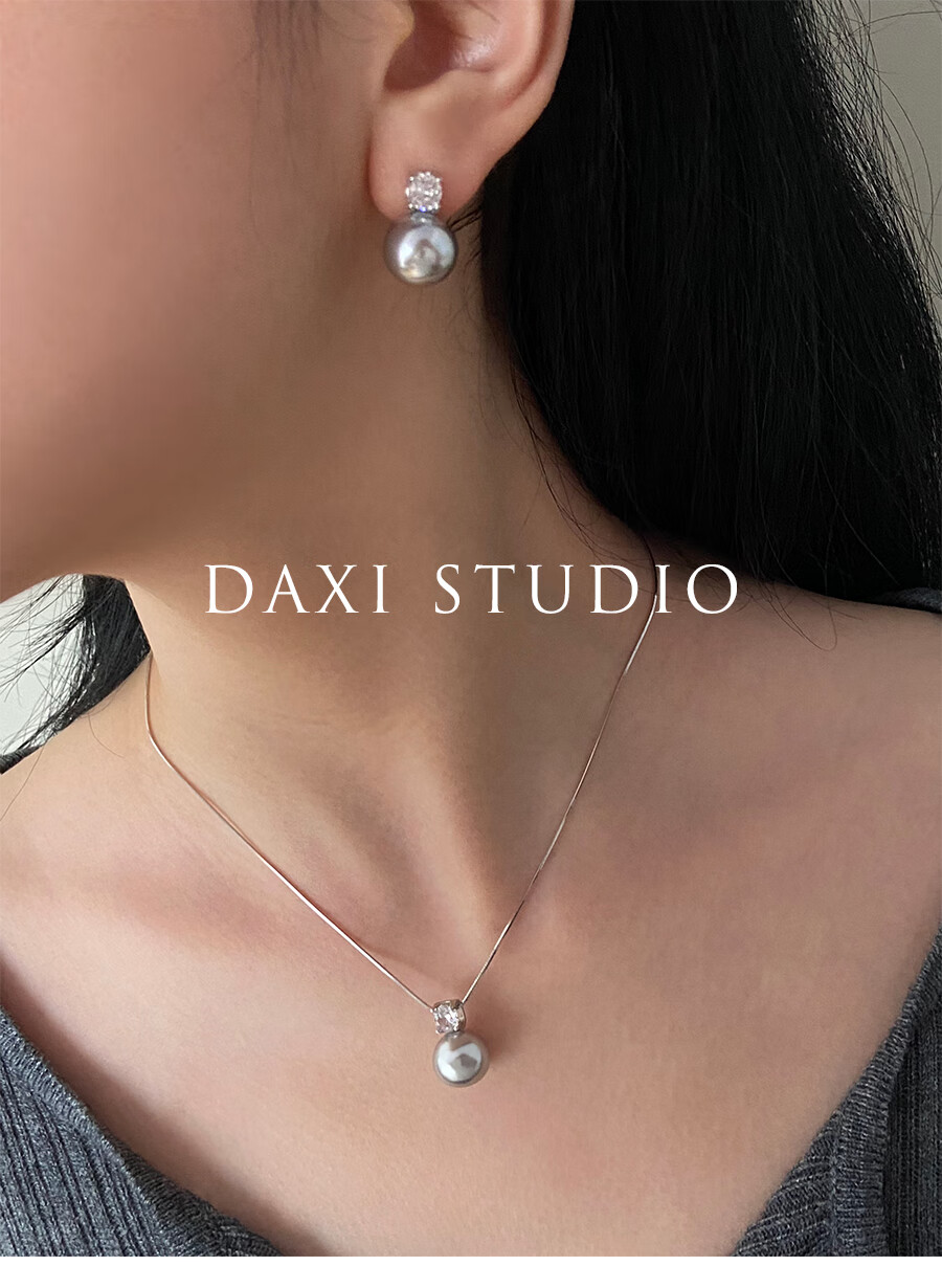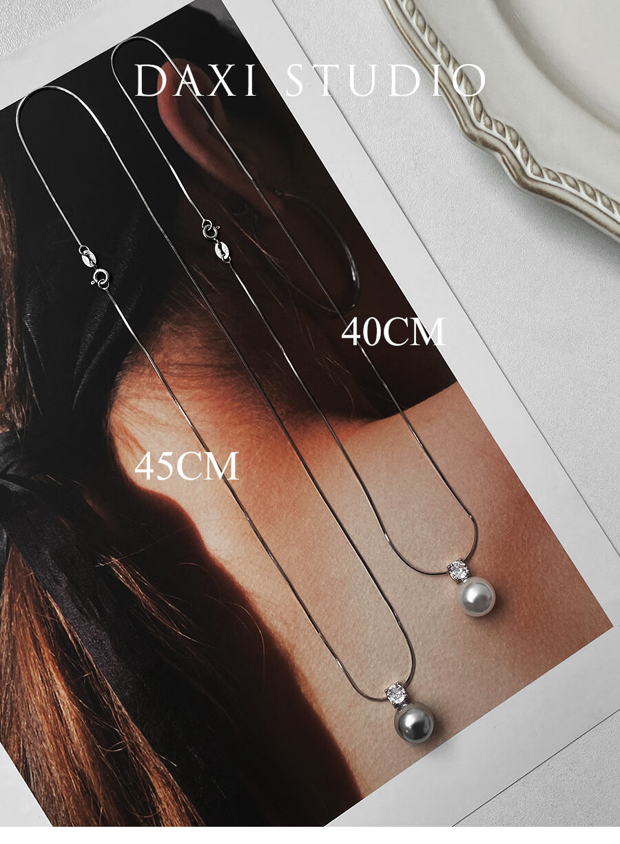 DL 1998 Fat Donglai same style true hemp pendant Princess Diana Australian white pearl necklace women's light luxury gray milk white clavicle chain silver snake Tahiti black suit (12mm earrings + 40CM pendant