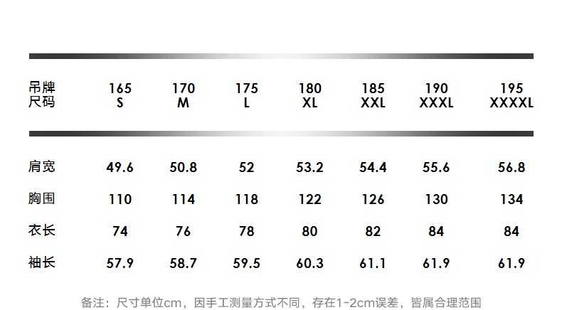 China (cm) 160-165/84-86 165-170 / 88-90 167-172 / 92-96 168-173 / 98-102 170-176 / 106-110