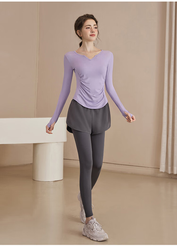 LULUUVTTOH yoga clothing suit women's Pilates autumn and winter fitness long-sleeved tops breathable running sports training clothes gray fake two-piece trousers L
