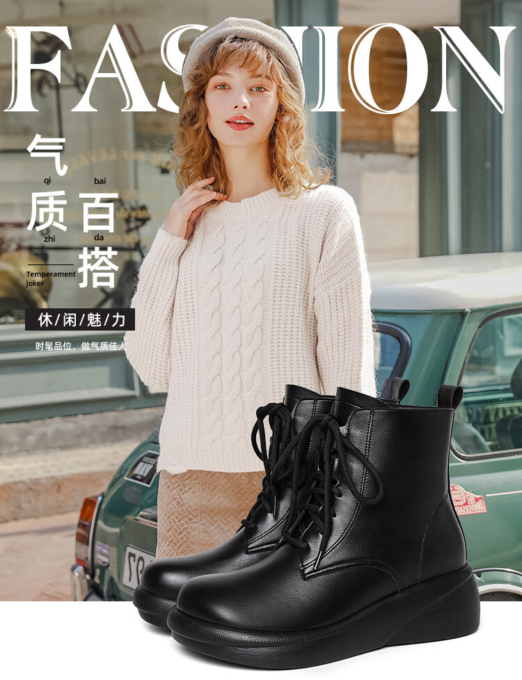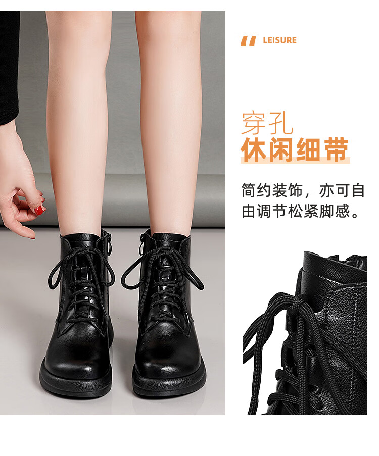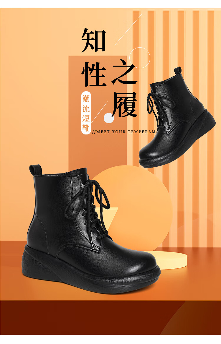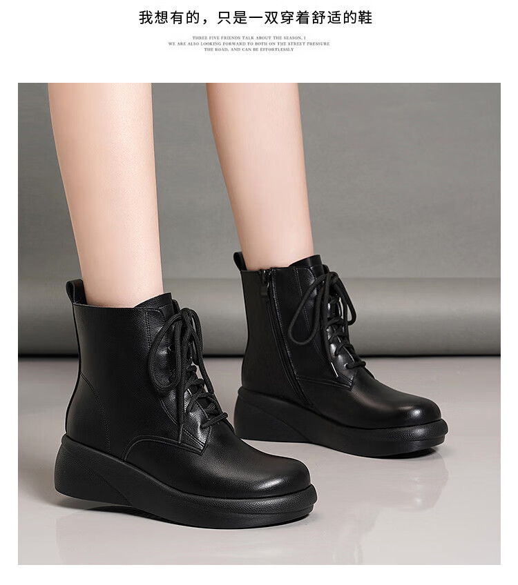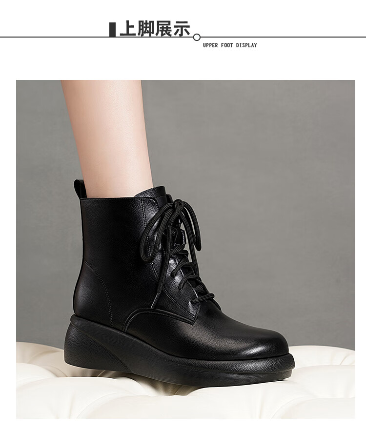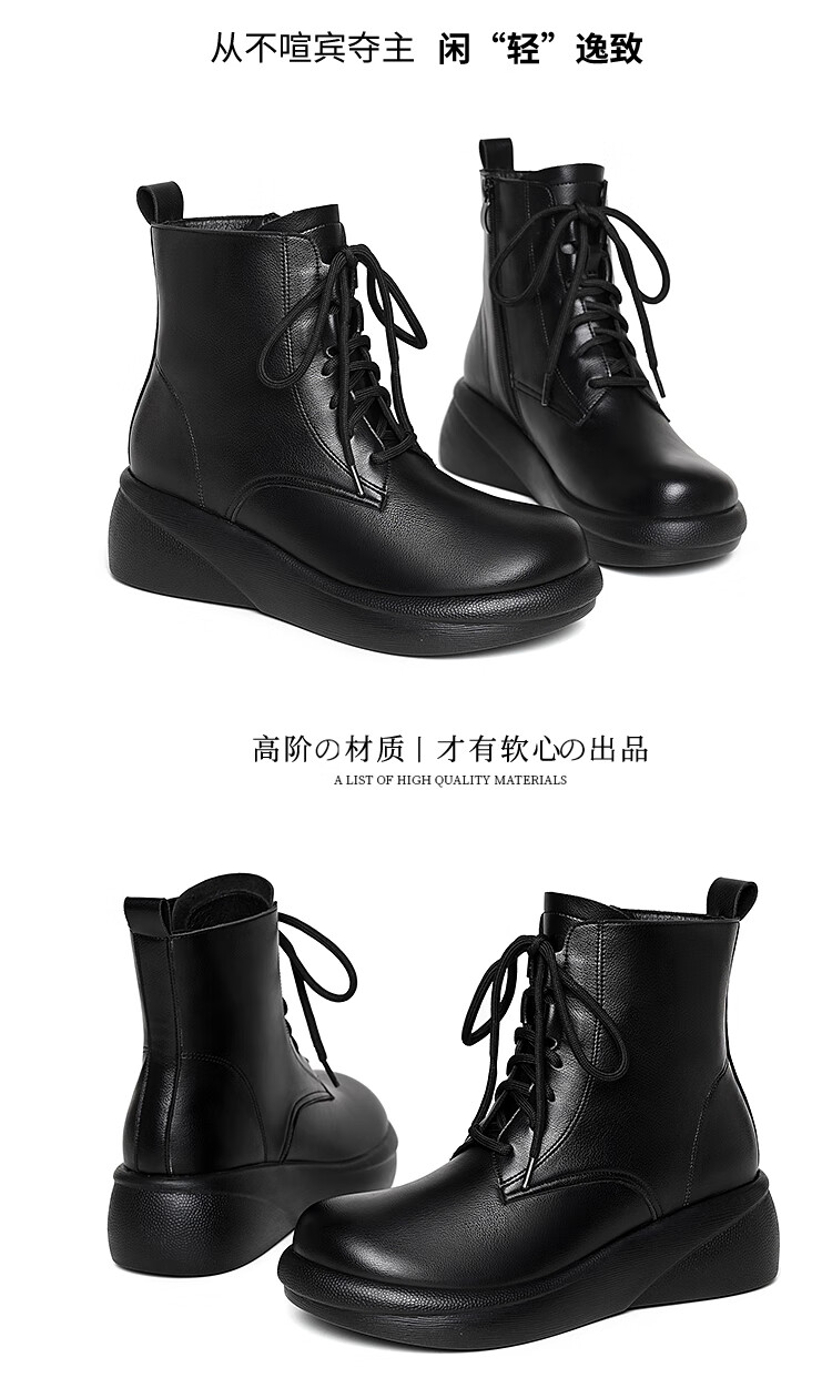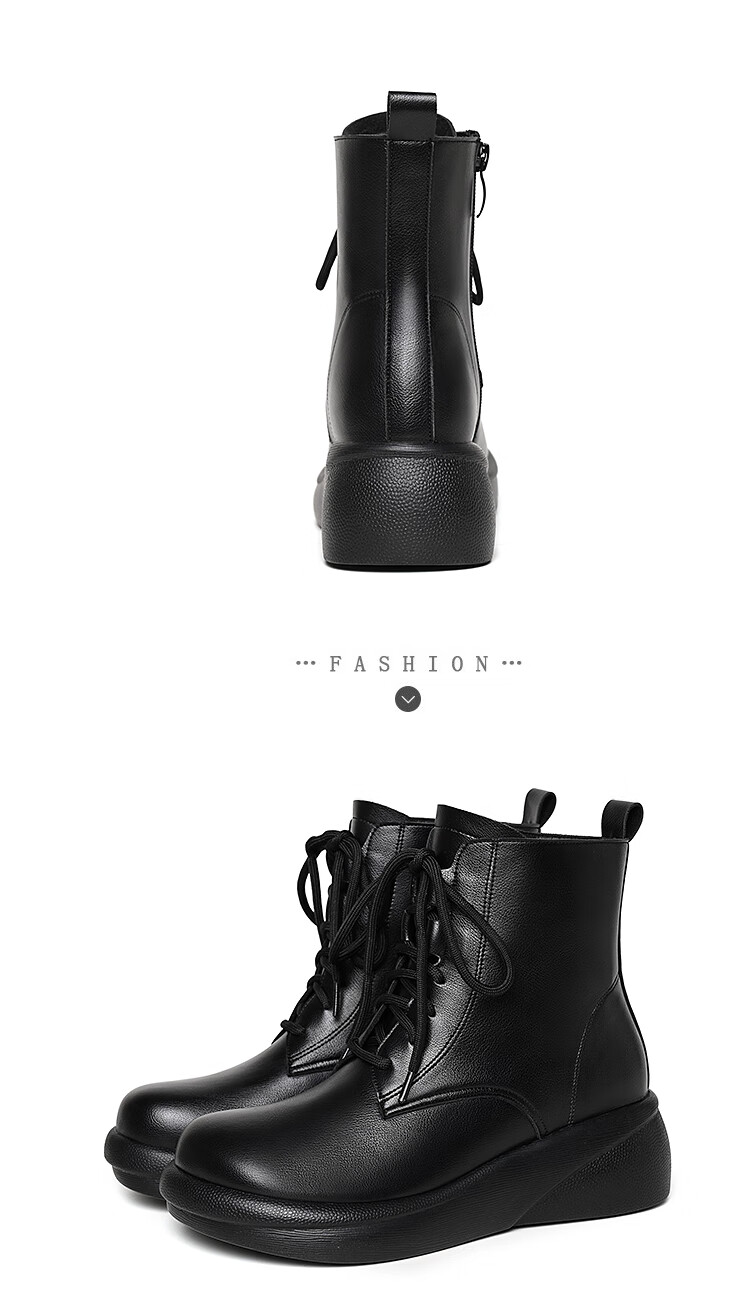 Woodpecker genuine leather women's shoes 2025 winter new Martin boots thick-soled wedge-heeled short boots flat-soled high-heeled single boots women's boots black warm velvet lining 38 standard size