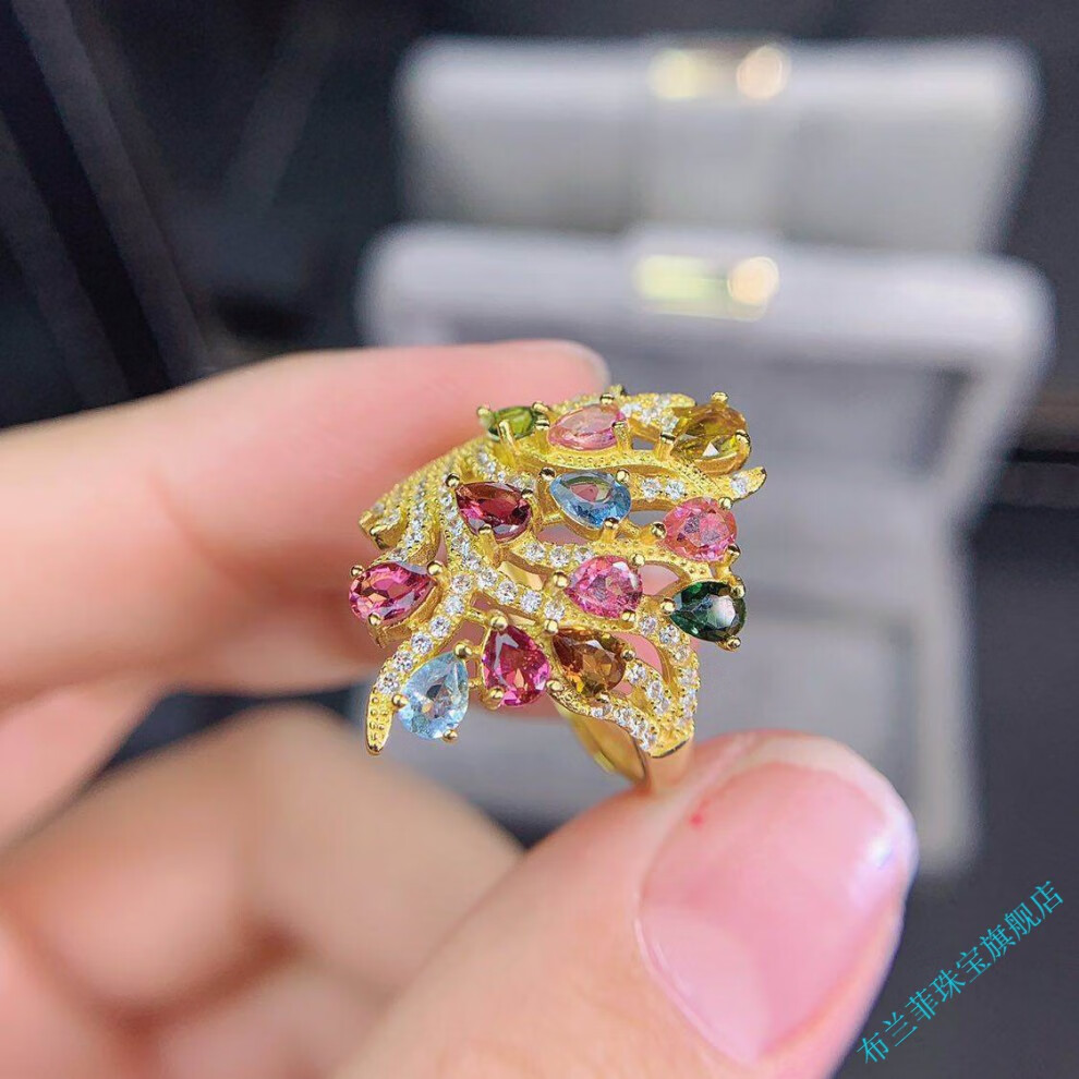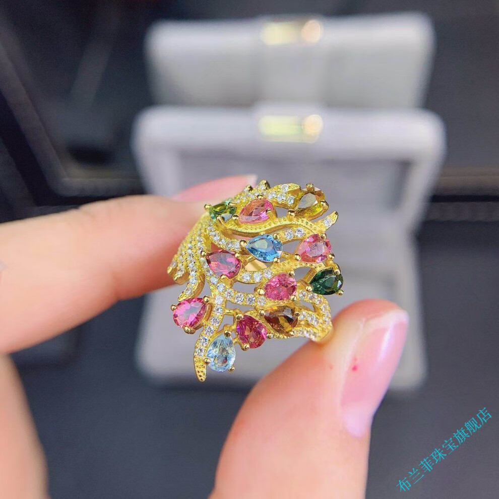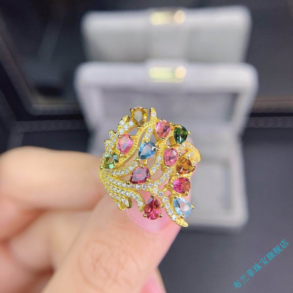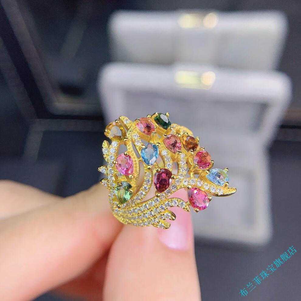 Xinheming Tourmaline Ring Girls Light Luxury Ring New Product Brazilian Women's S925 Silver Exquisite and Attractive Multi-grain Candy Color Fresh and Hao Tourmaline Ring Color