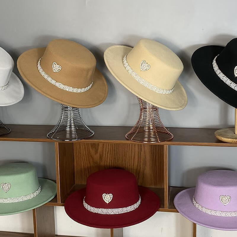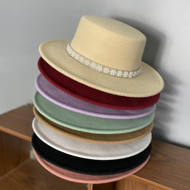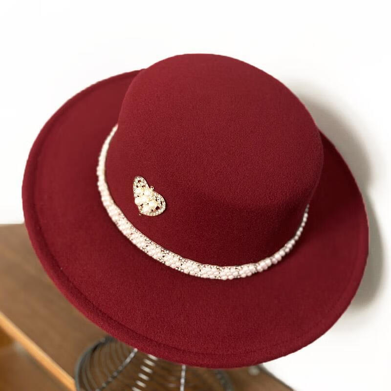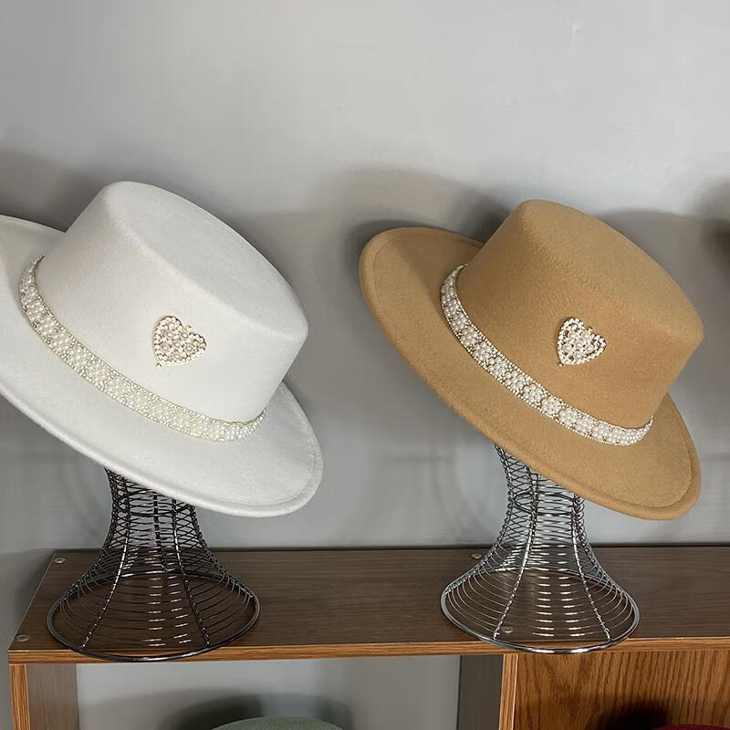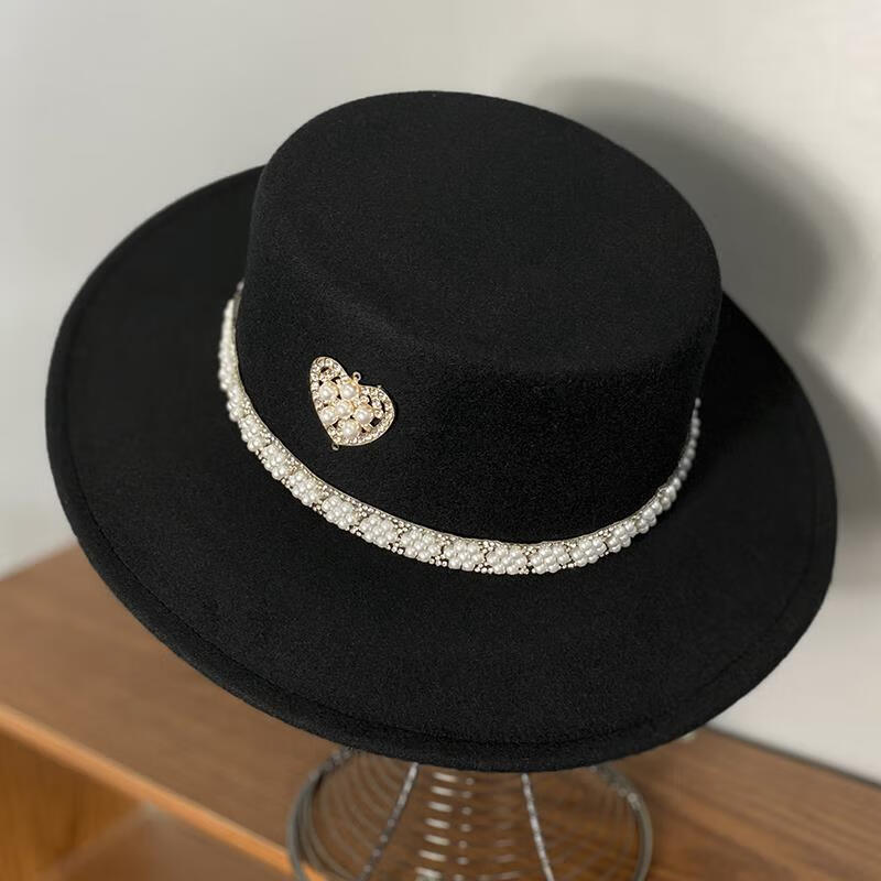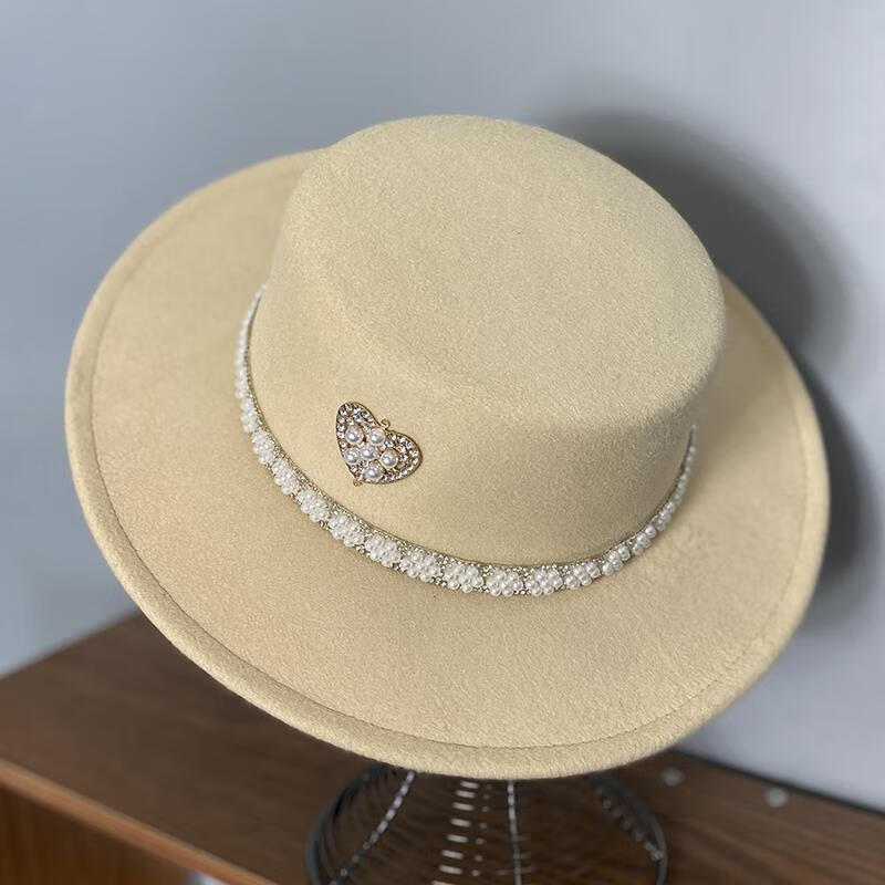 Xishengduo Spring and Autumn Versatile Celebrity Pearl Rhinestone Love Flat Top Jazz Hat Temperament Internet Celebrity Woolen Gift Hat Women's Fashion White M (56-58cm)