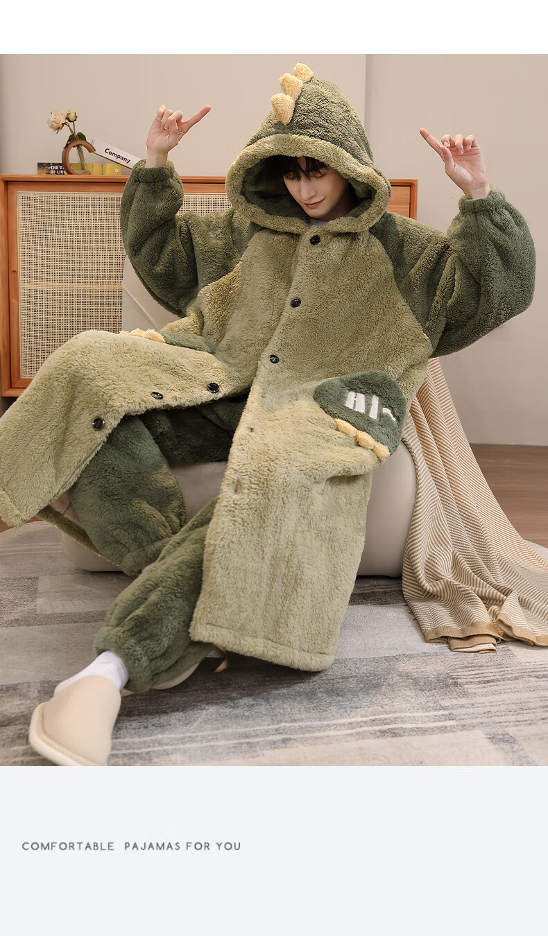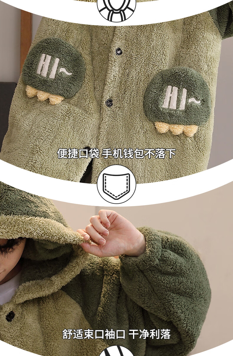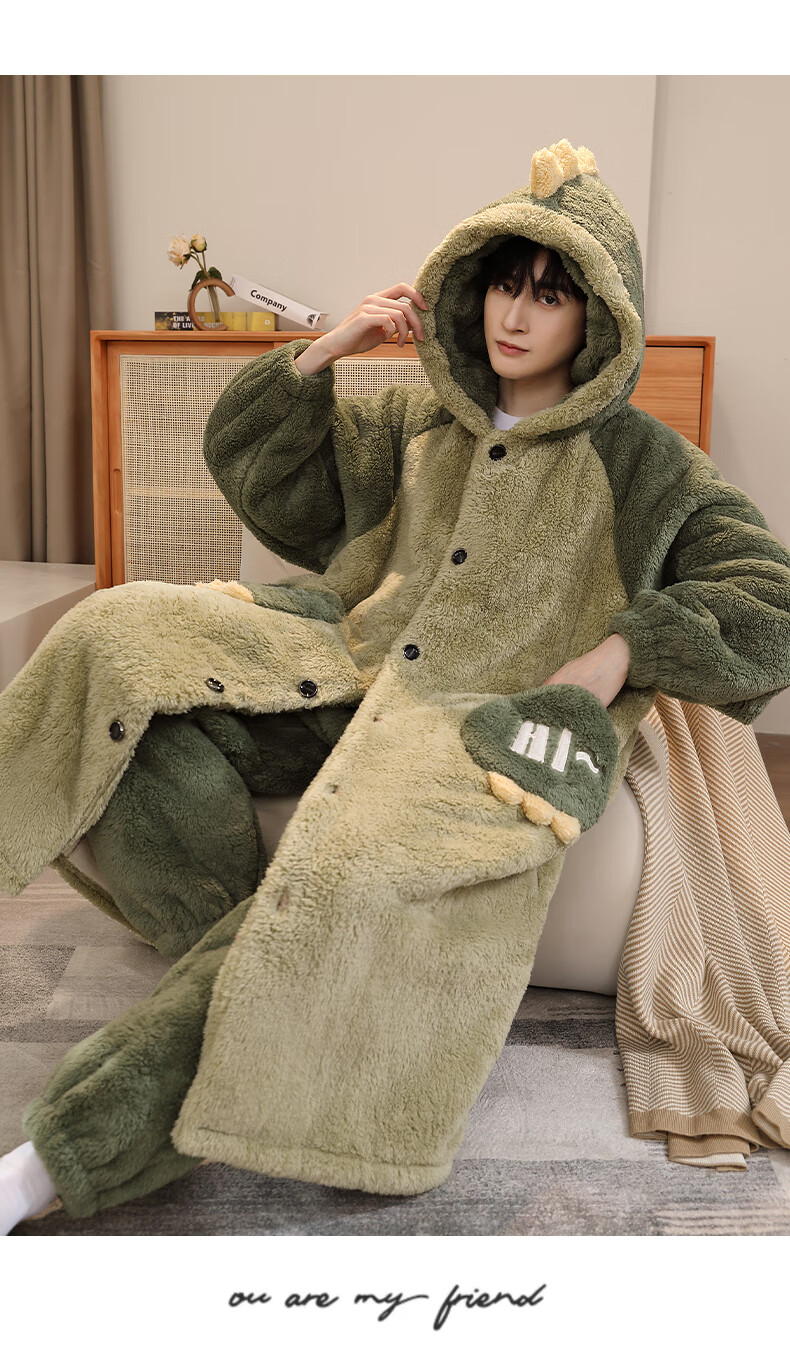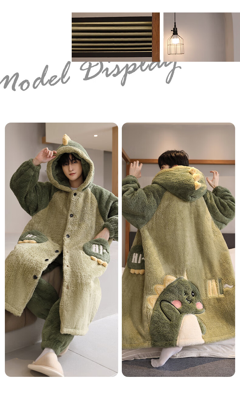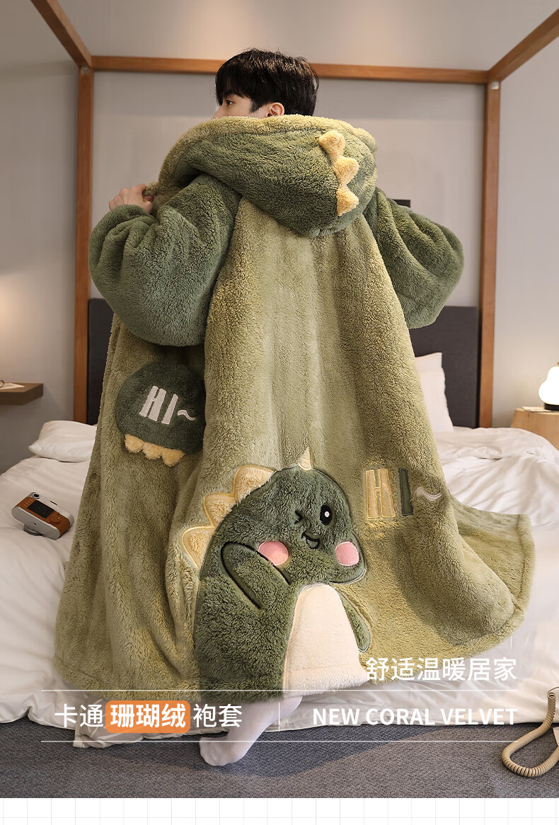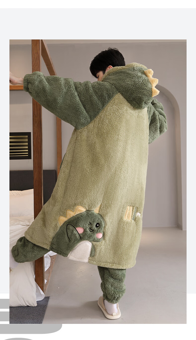 Teenage Love Story Men's Nightgown Autumn and Winter Plus Velvet Thickened Large Size Youth Coral Velvet Long Winter Cartoon Style Home Clothes Set 144N Dinosaur Robe + Pants XL Male 135-158Jin Jin is equal to 0.5 kg