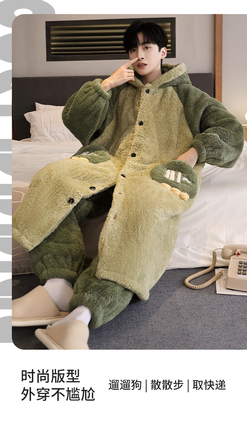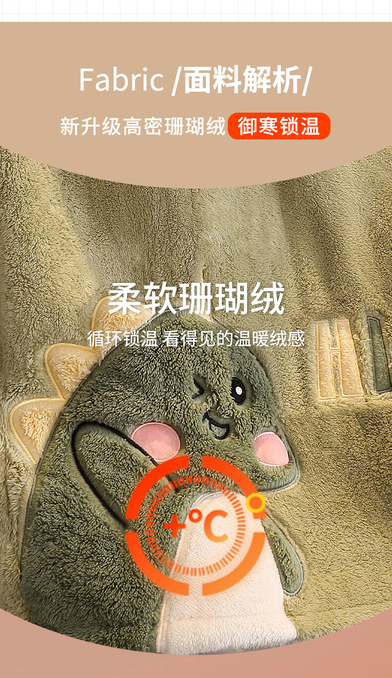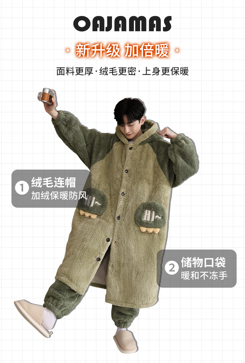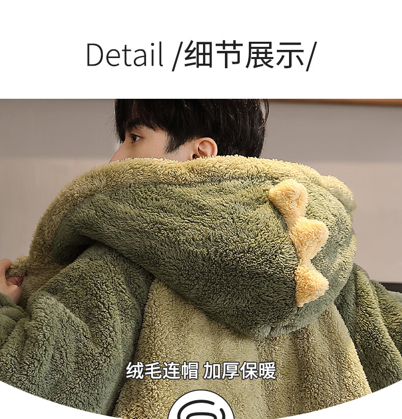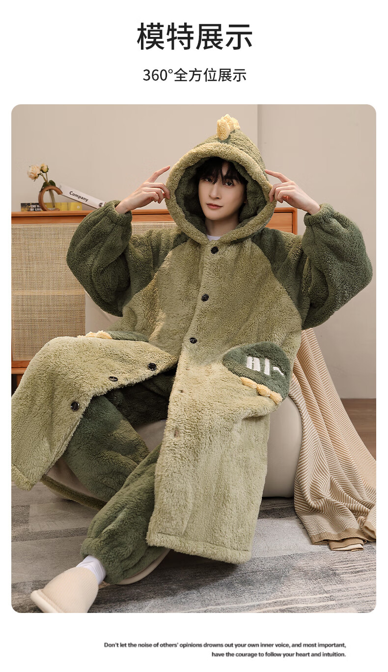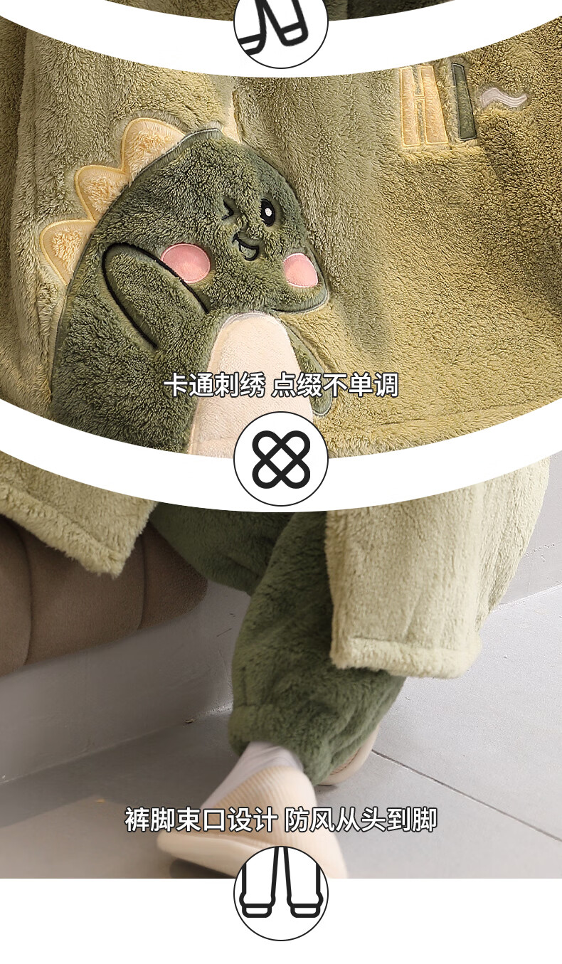 Teenage Love Story Men's Nightgown Autumn and Winter Plus Velvet Thickened Large Size Youth Coral Velvet Long Winter Cartoon Style Home Clothes Set 144N Dinosaur Robe + Pants XL Male 135-158Jin Jin is equal to 0.5 kg