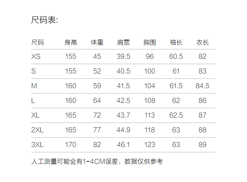 China (cm) 160-165/84-86 165-170 / 88-90 167-172 / 92-96 168-173 / 98-102 170-176 / 106-110